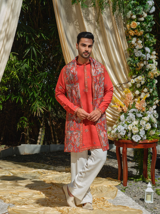 Vermilion Fendi Kurta Set with Multicolour Thread Work Embroidery & Embroidered Stole