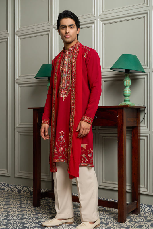 Vermilion Fendi Kurta–Bottom–Stole Set with Multicolour Thread Work