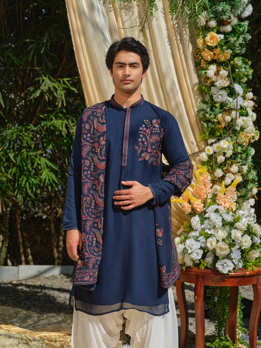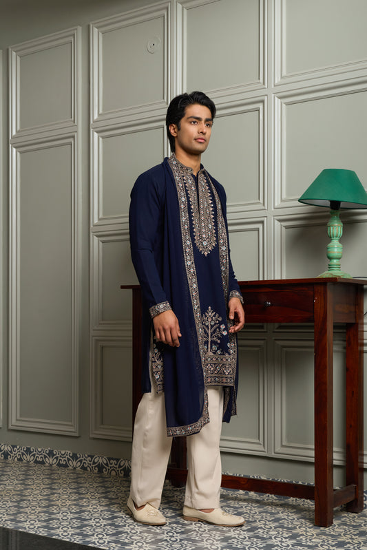 Navy Blue Georgette Kurta Set with Thread Work Embroidery & Dupatta