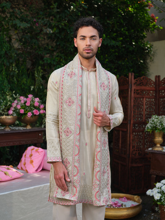 Festive Beige Armani Kurta Ensemble with Handcrafted Detailing