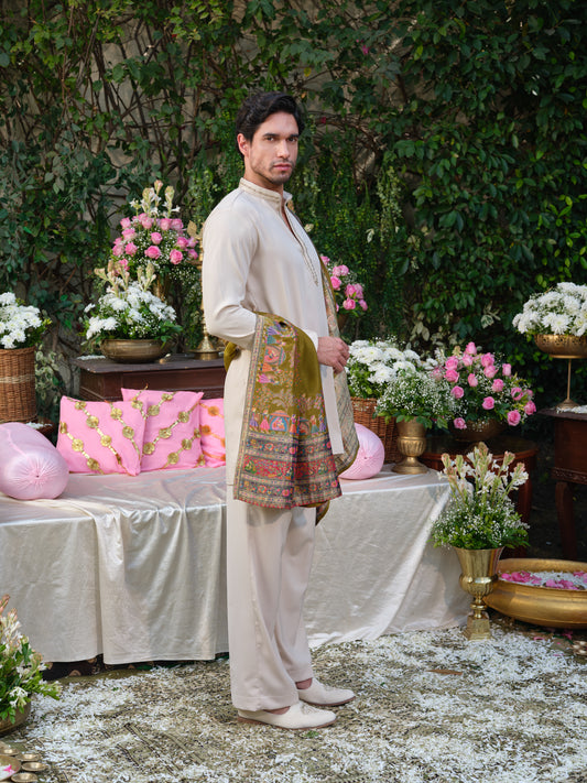 Beige Armani Festive Kurta Set with Hand Work & Jacquard Dupatta