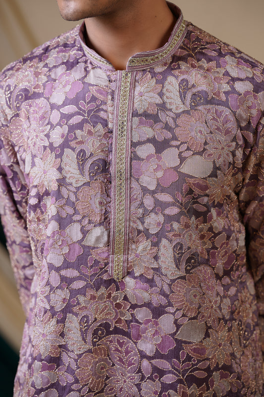 Lilac Chinnon Golden Zari Embroidery Kurta Set