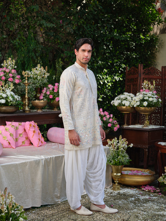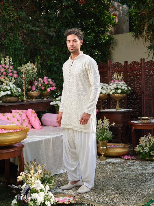 White Thread-Embroidered Georgette Kurta–Bottom Set