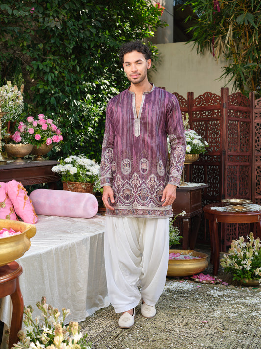 Purple Shimmer Printed Tissue Kurta–Bottom Set with Chain Stitch Embroidery
