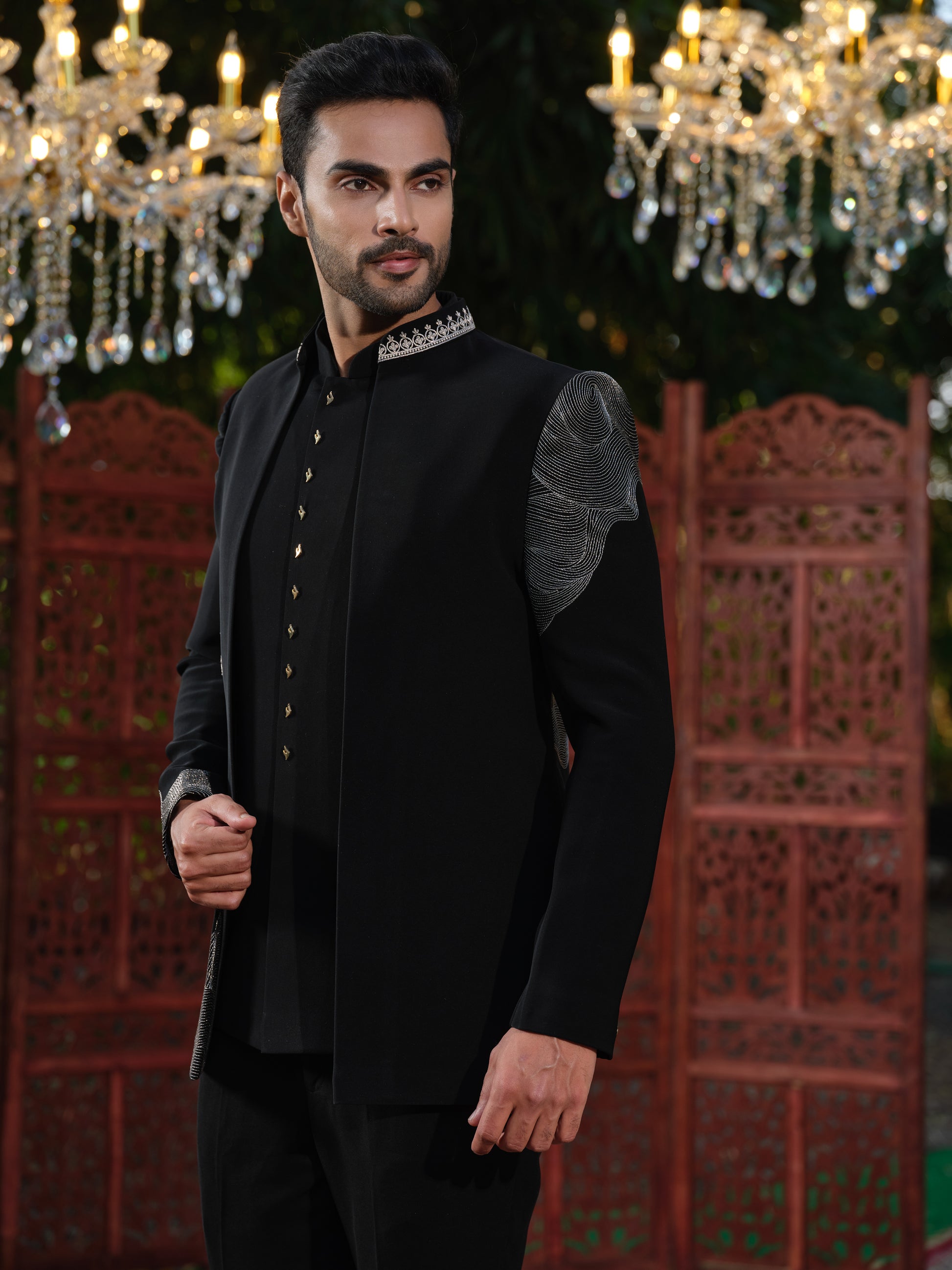 - Neck: Madarian Collar (Inner Jacket - Open Jodhpuri)
