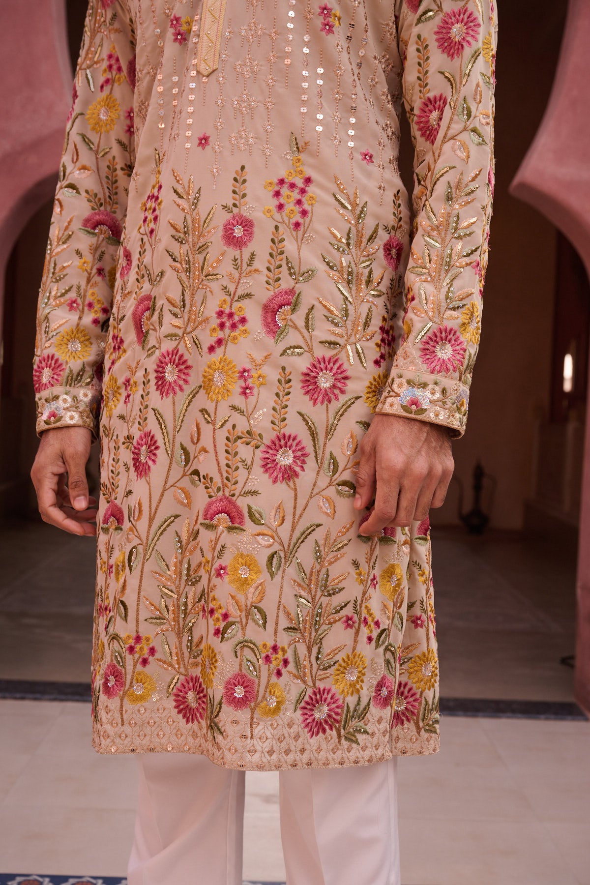 Enhance your festive wardrobe with this Beige Georgette Kurta Set, featuring intricate sequins and multicolour floral thread work embroidery. The mandarin collar and full sleeves add sophistication to the knee-length kurta, while the side slits provide both style and comfort. Paired with a straight pant, this ensemble is perfect for any festive celebration or special occasion.