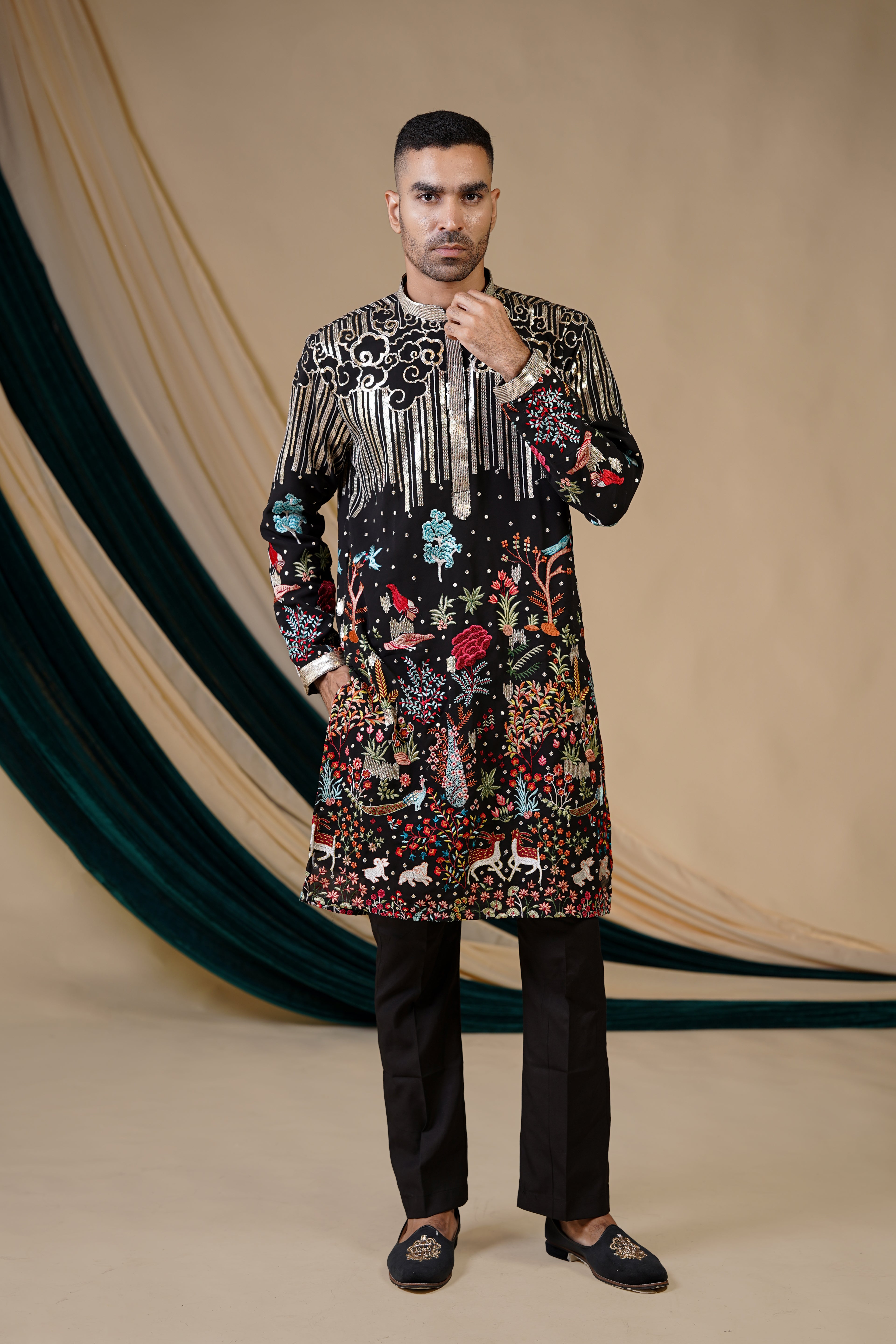 Elevate your festive wardrobe with this Men's Black Georgette Kurta, featuring intricate multicolour threadwork and floral embroidery. This kurta boasts a mandarin collar and full sleeves, offering a sophisticated and elegant look. The luxurious georgette fabric and exquisite detailing make it a perfect choice for any special occasion.