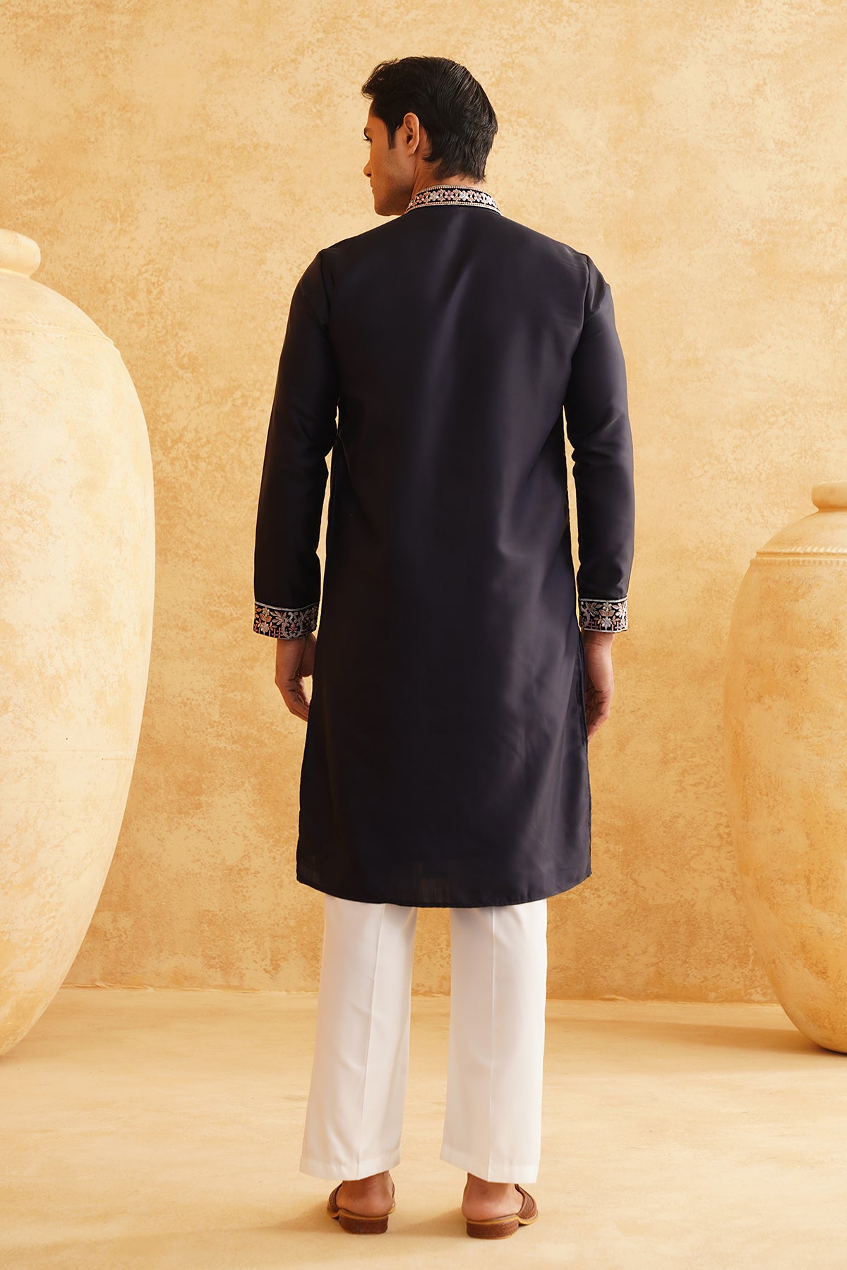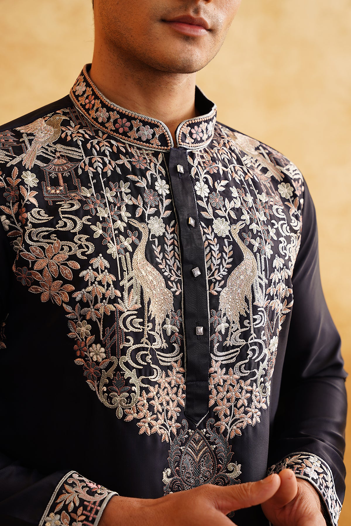Enhance your festive or regular wardrobe with this Men's Black Kenzo Kurta Set. Made from premium Kenzo fabric, this kurta is adorned with detailed thread work embroidery, adding a touch of elegance. The mandarin collar and full sleeves offer a classic style, while the knee-length design with side slits ensures comfort and sophistication for any occasion.