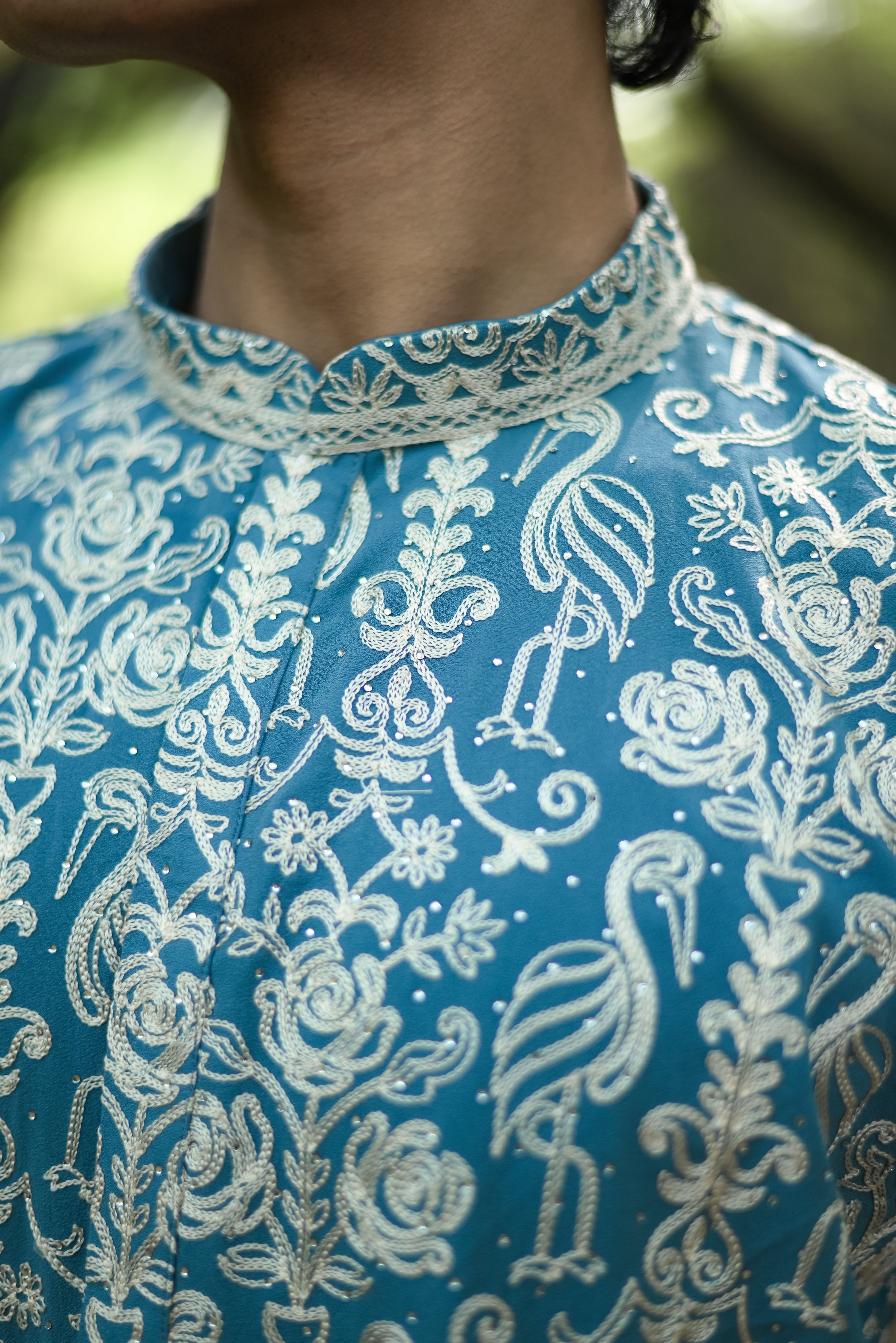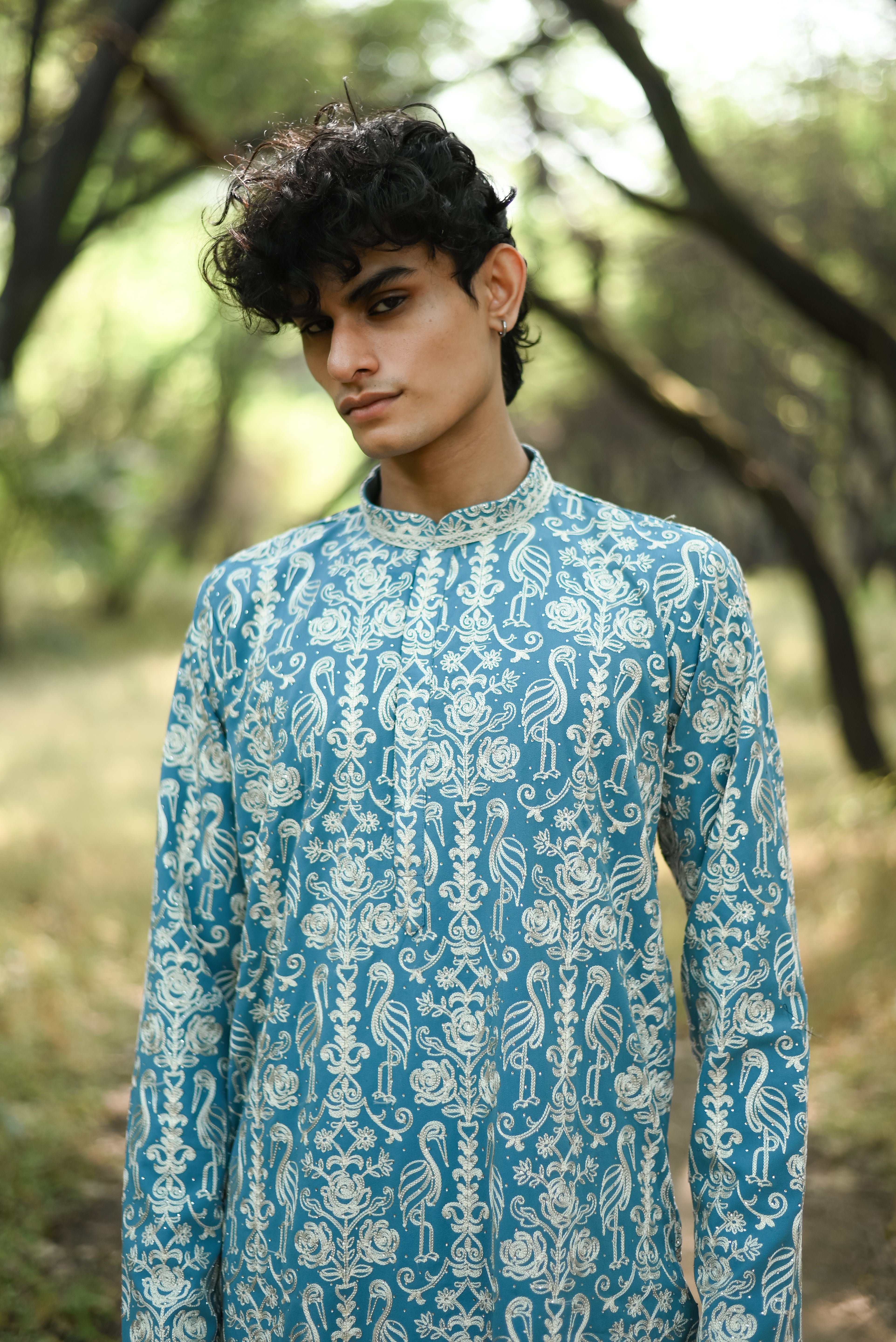 Refine your festive wardrobe with this Men's Blue Crepe Kurta Set. Crafted with intricate thread work embroidery, the kurta features full sleeves, a mandarin collar, and a knee-length design with side slits for a seamless blend of tradition and style. The straight-cut fit adds a modern edge, making it an excellent choice for festive occasions. Paired with a complementing straight pant, this ensemble ensures an elegant and polished appearance.