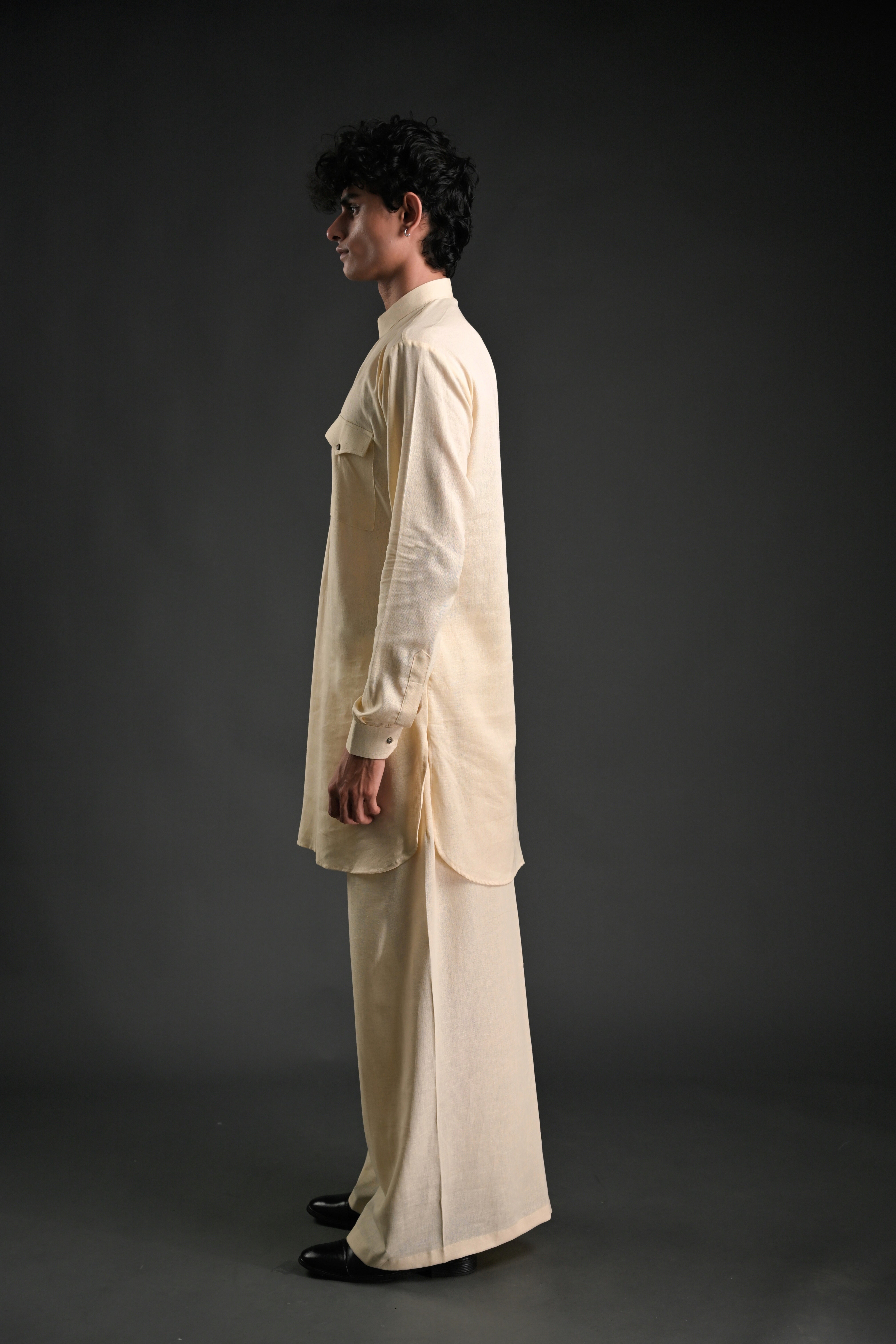 Step into effortless elegance with our Classic Beige Linen Blend Pathani Suit with Flared Pants. Crafted from premium linen blend fabric, this ensemble blends timeless tradition with contemporary style. The short kurta features a mandarin collar, full regular sleeves, and a side-slit design for added comfort and versatility. Paired with flared pants, this outfit is ideal for family gatherings, wedding functions, or casual evening lounging. The curved hemline adds a modern touch to the classic Pathani silhouette, making it a perfect choice for any occasion.