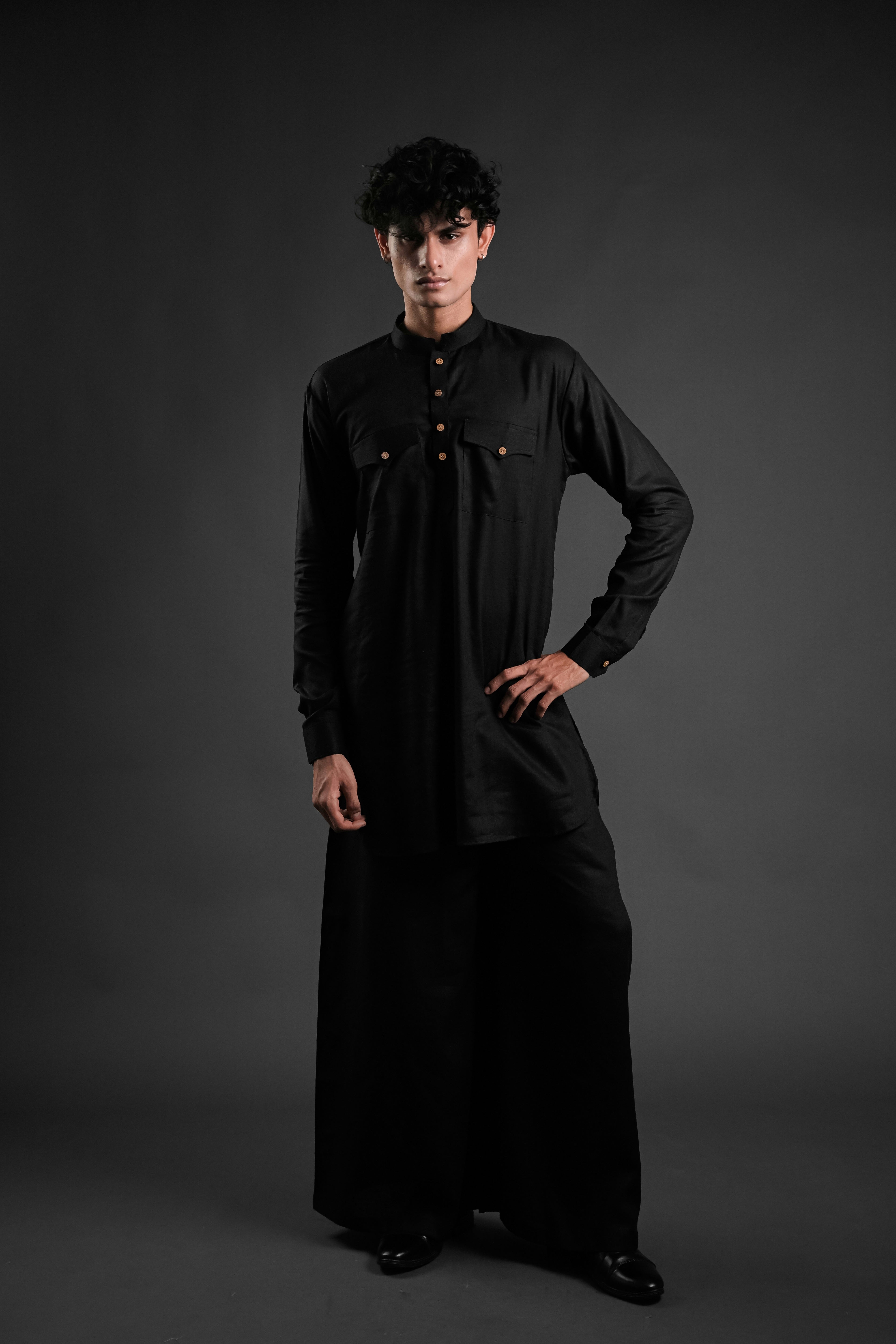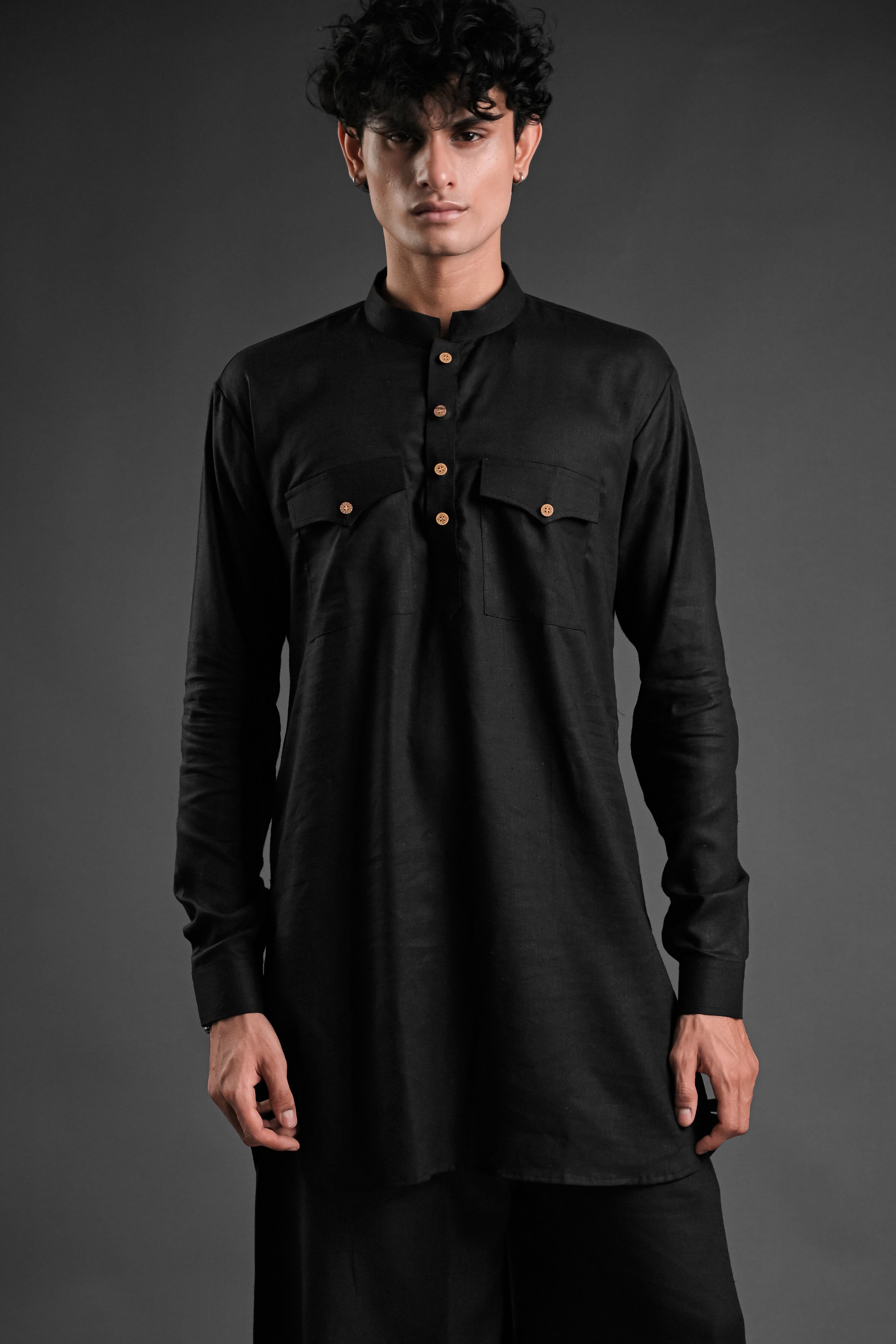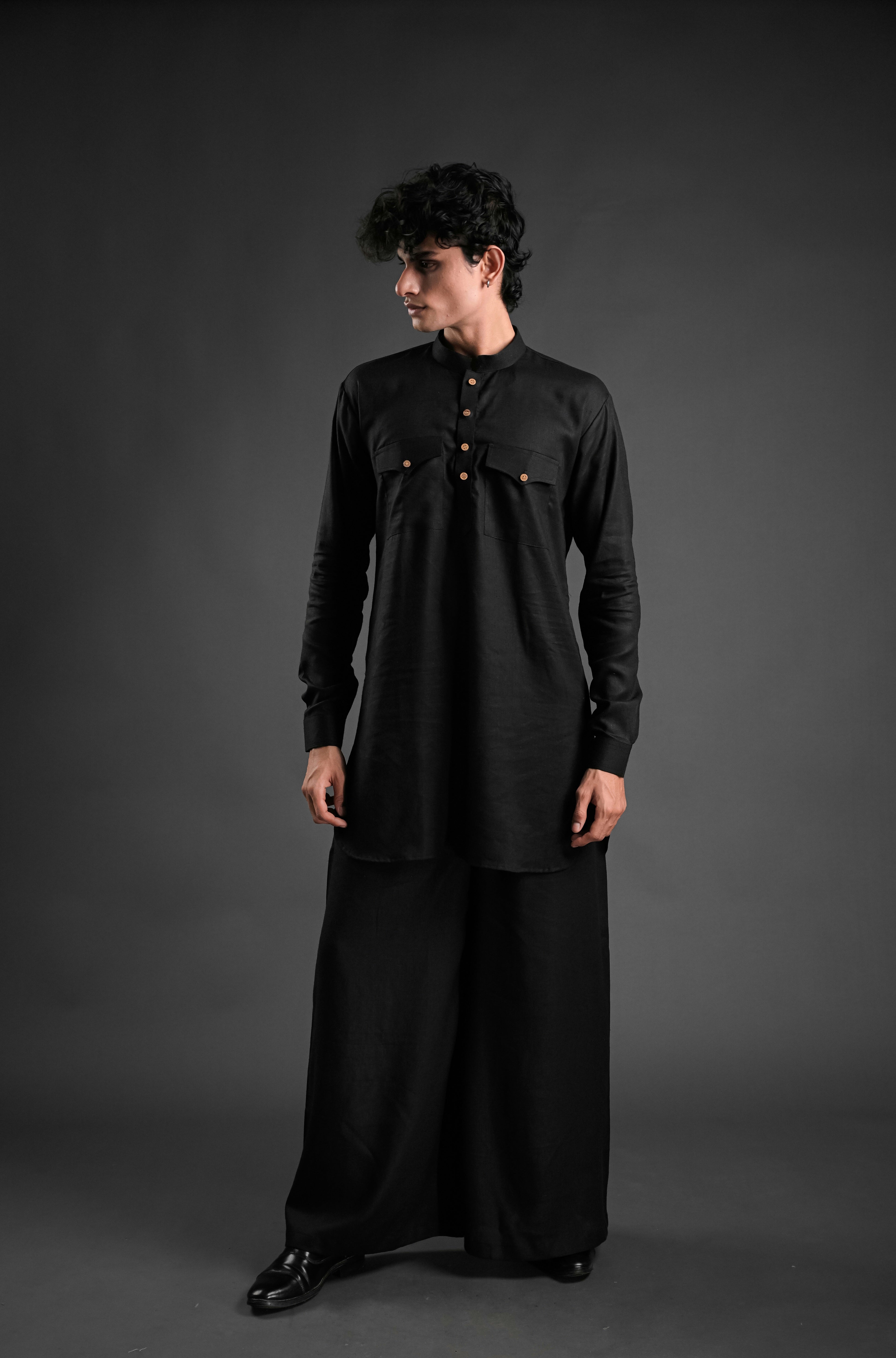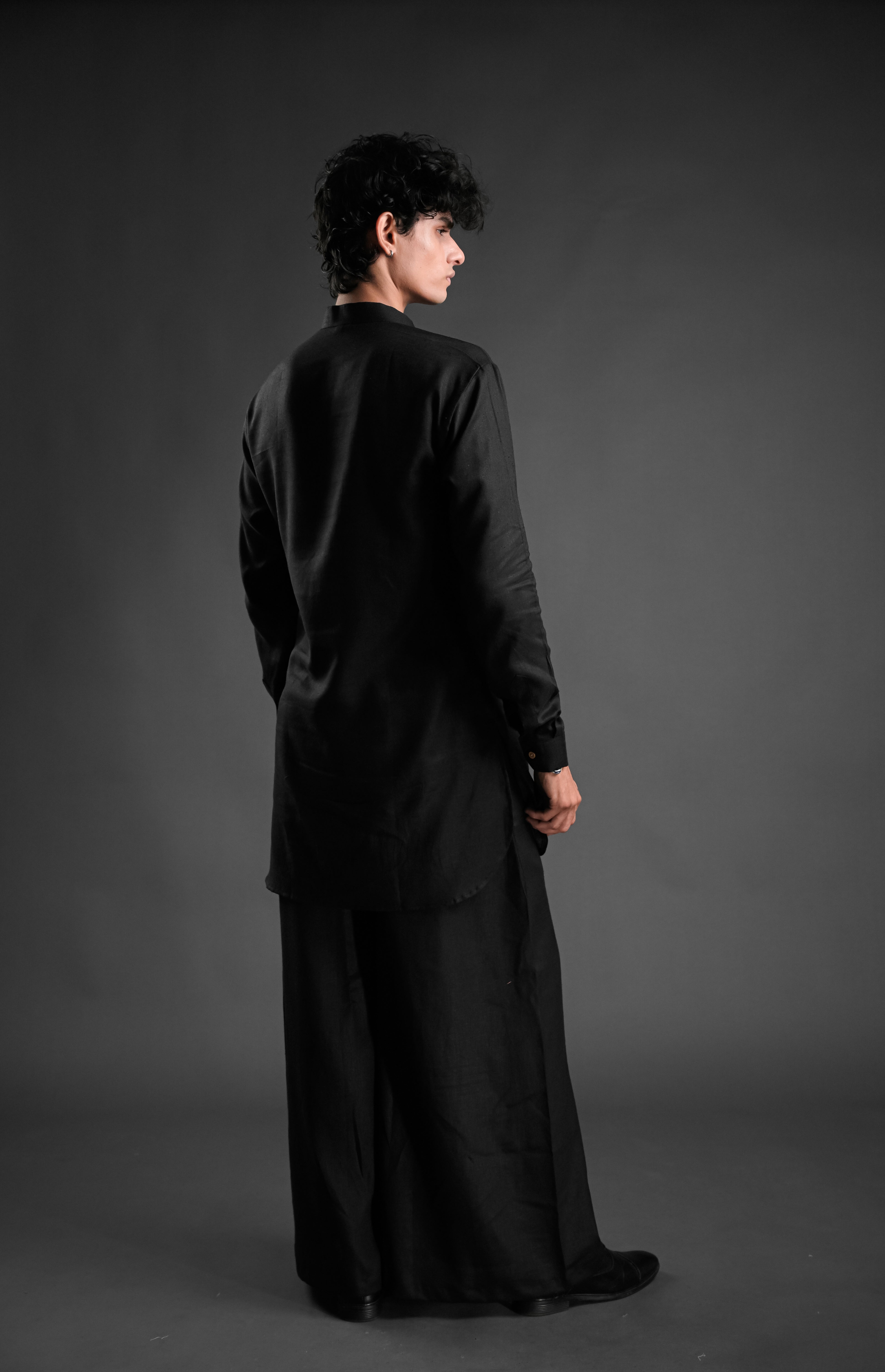 Step into effortless elegance with our Classic Black Linen Blend Pathani Suit with Flared Pants. Crafted from premium linen blend fabric, this ensemble blends timeless tradition with contemporary style. The short kurta features a mandarin collar, full regular sleeves, and a side-slit design for added comfort and versatility. Paired with flared pants, this outfit is ideal for family gatherings, wedding functions, or casual evening lounging. The curved hemline adds a modern touch to the classic Pathani silhouette, making it a perfect choice for any occasion.
