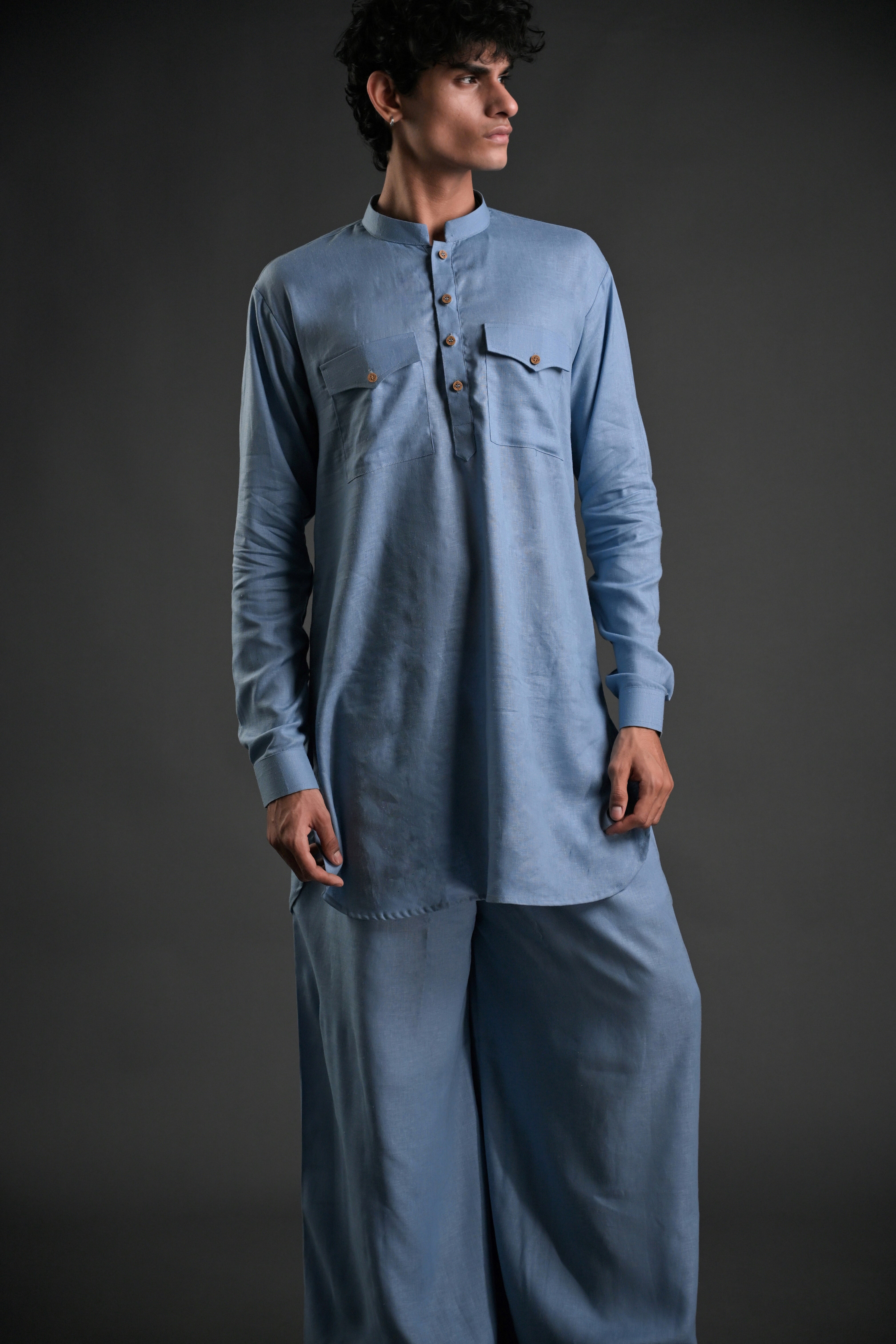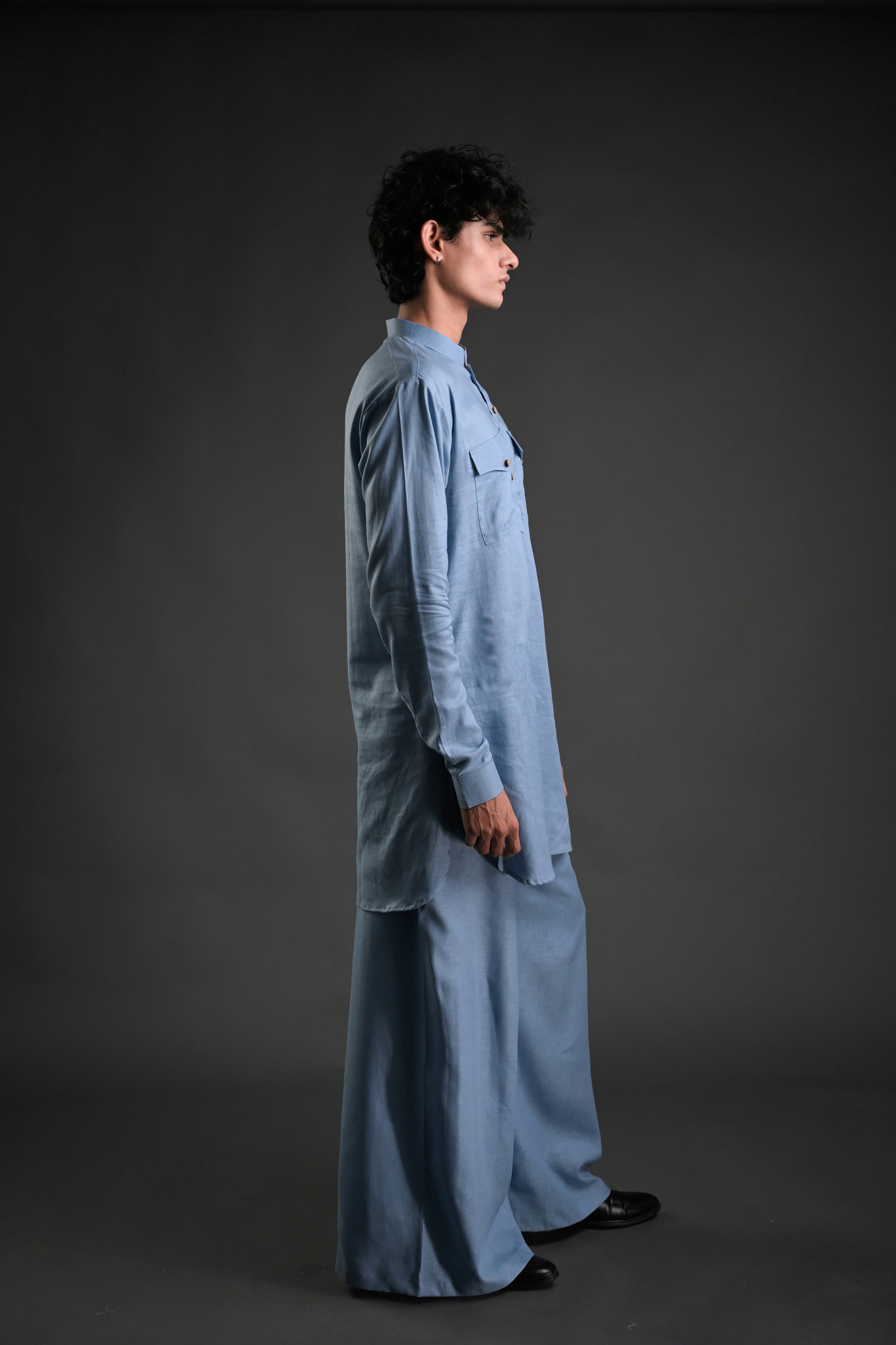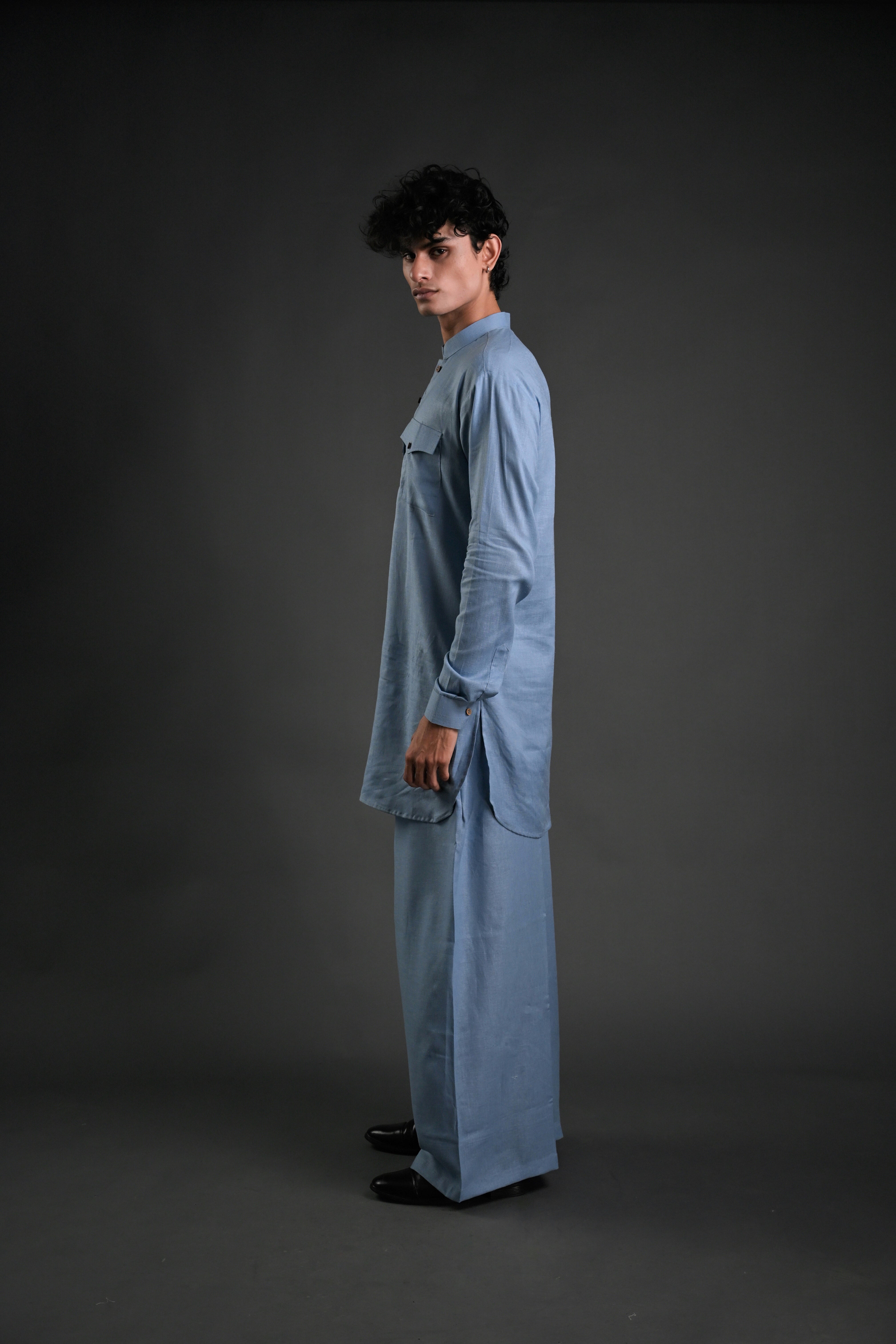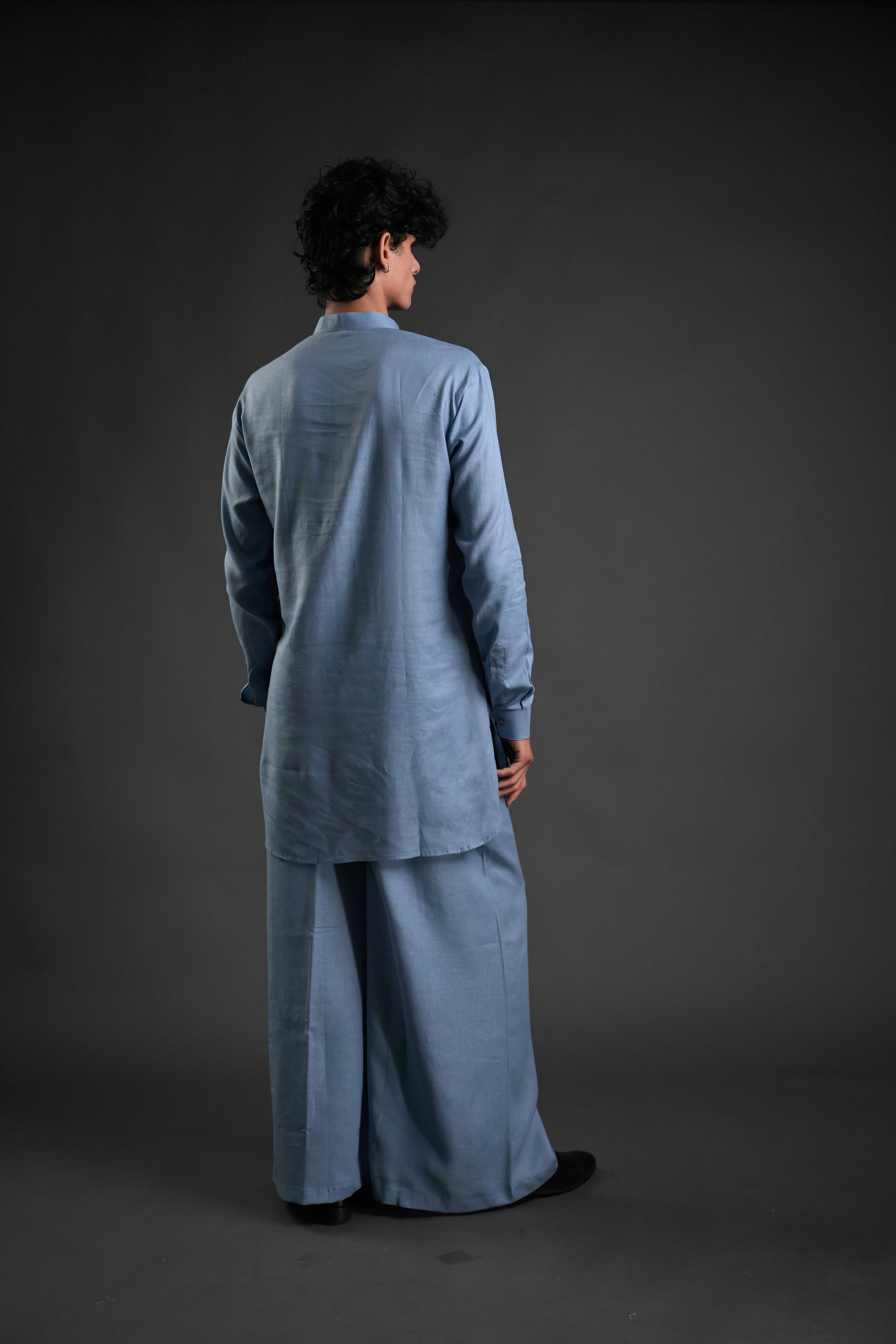 Step into effortless elegance with our Classic Black Linen Blend Pathani Suit with Flared Pants. Crafted from premium linen blend fabric, this ensemble blends timeless tradition with contemporary style. The short kurta features a mandarin collar, full regular sleeves, and a side-slit design for added comfort and versatility. Paired with flared pants, this outfit is ideal for family gatherings, wedding functions, or casual evening lounging. The curved hemline adds a modern touch to the classic Pathani silhouette, making it a perfect choice for any occasion.
