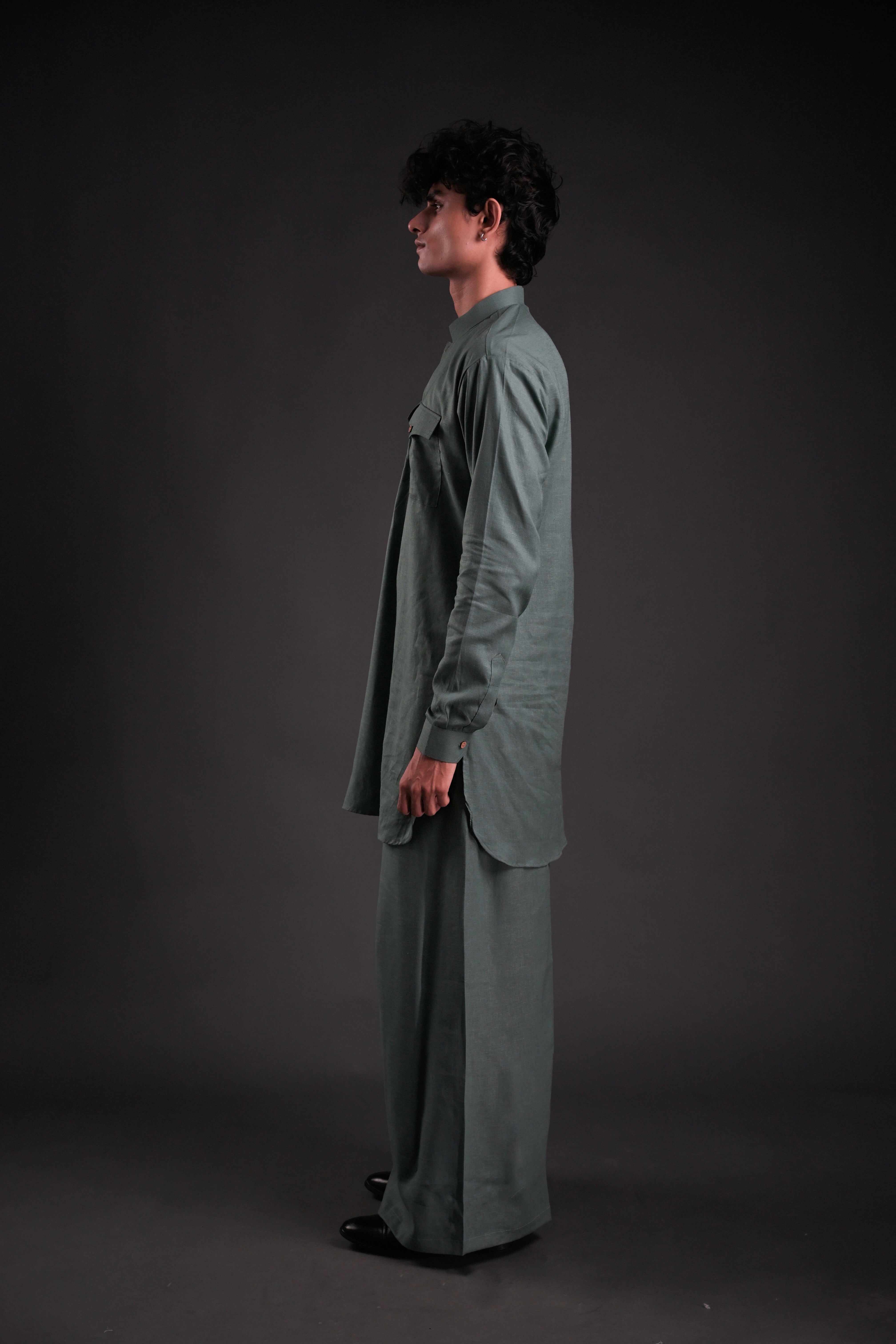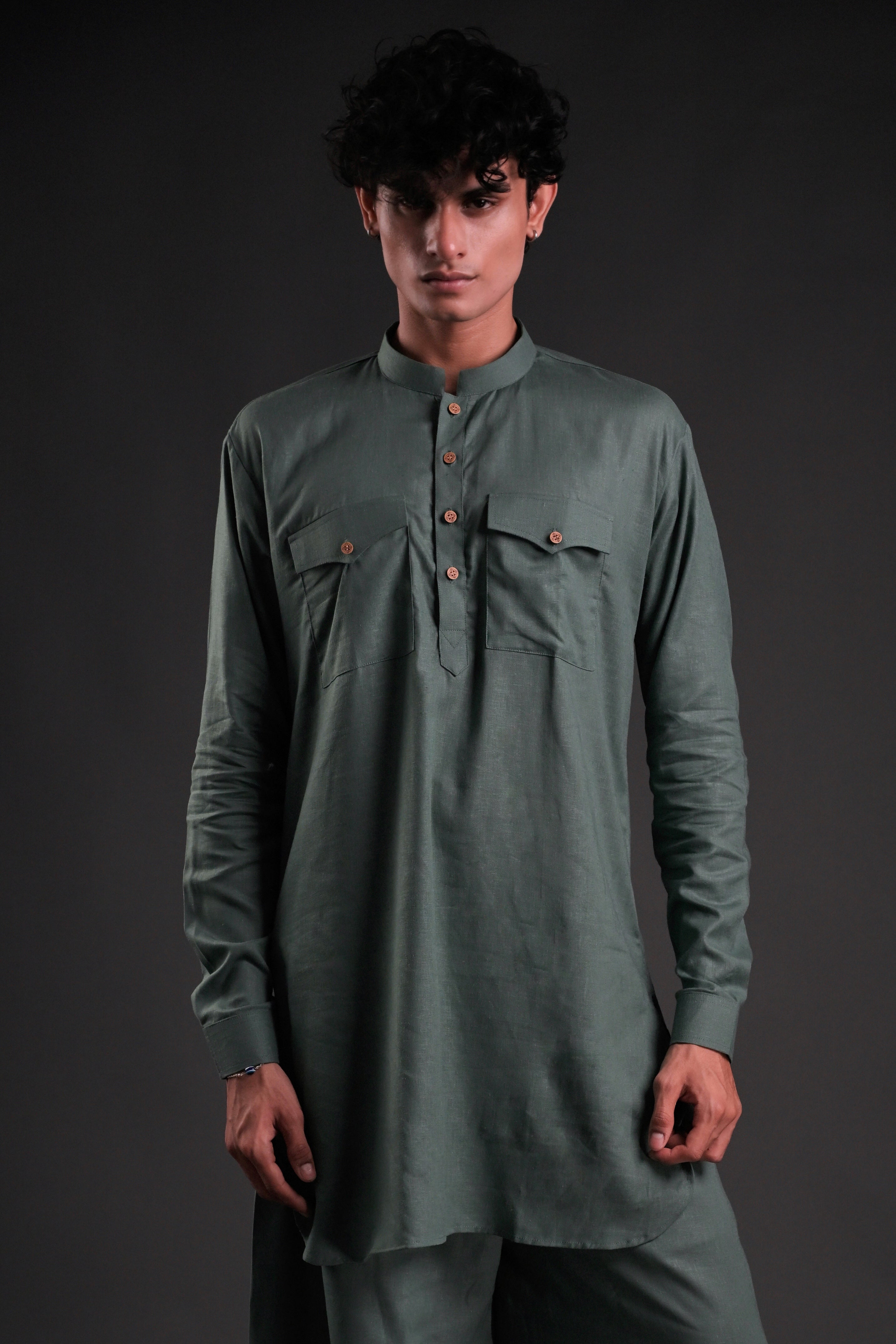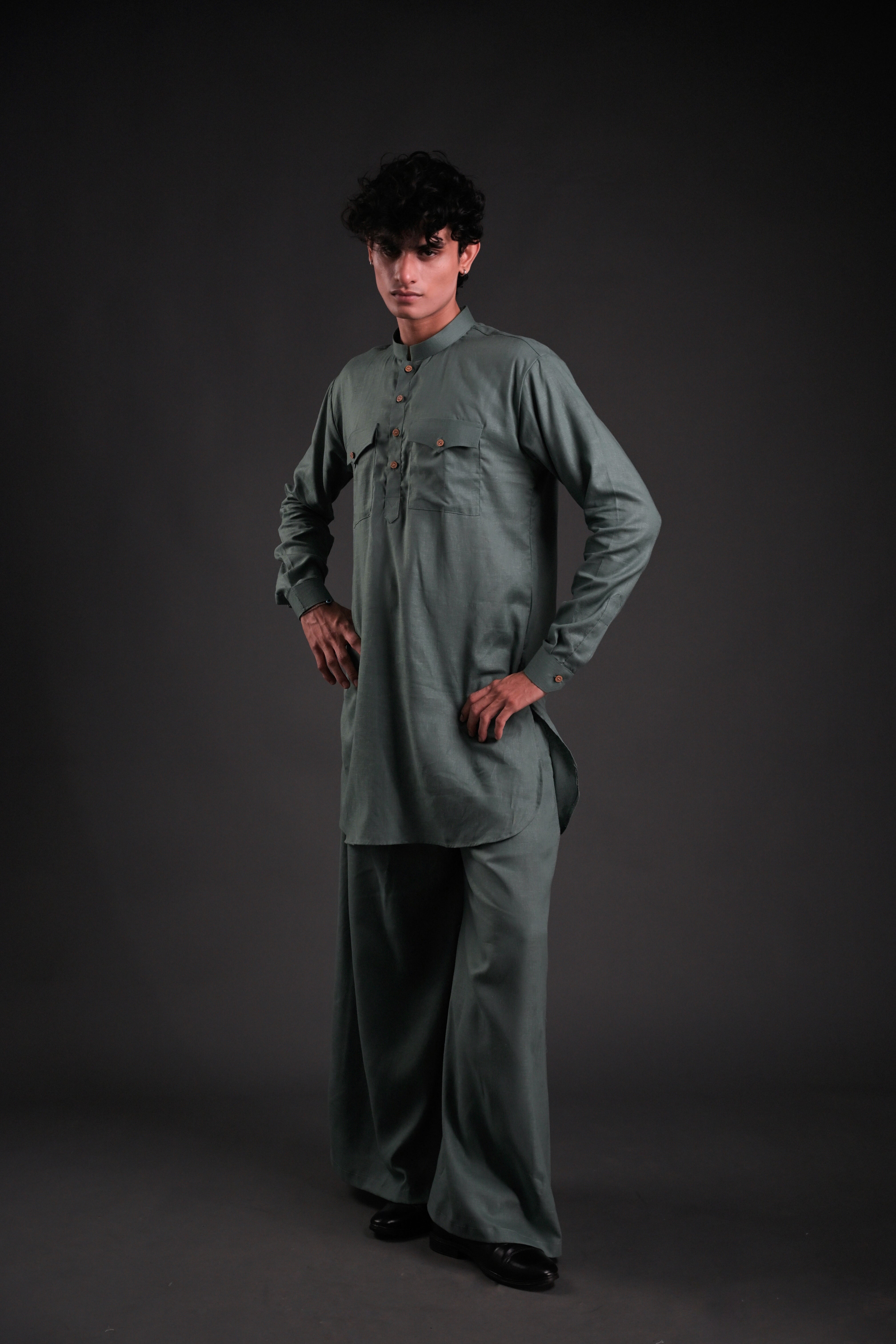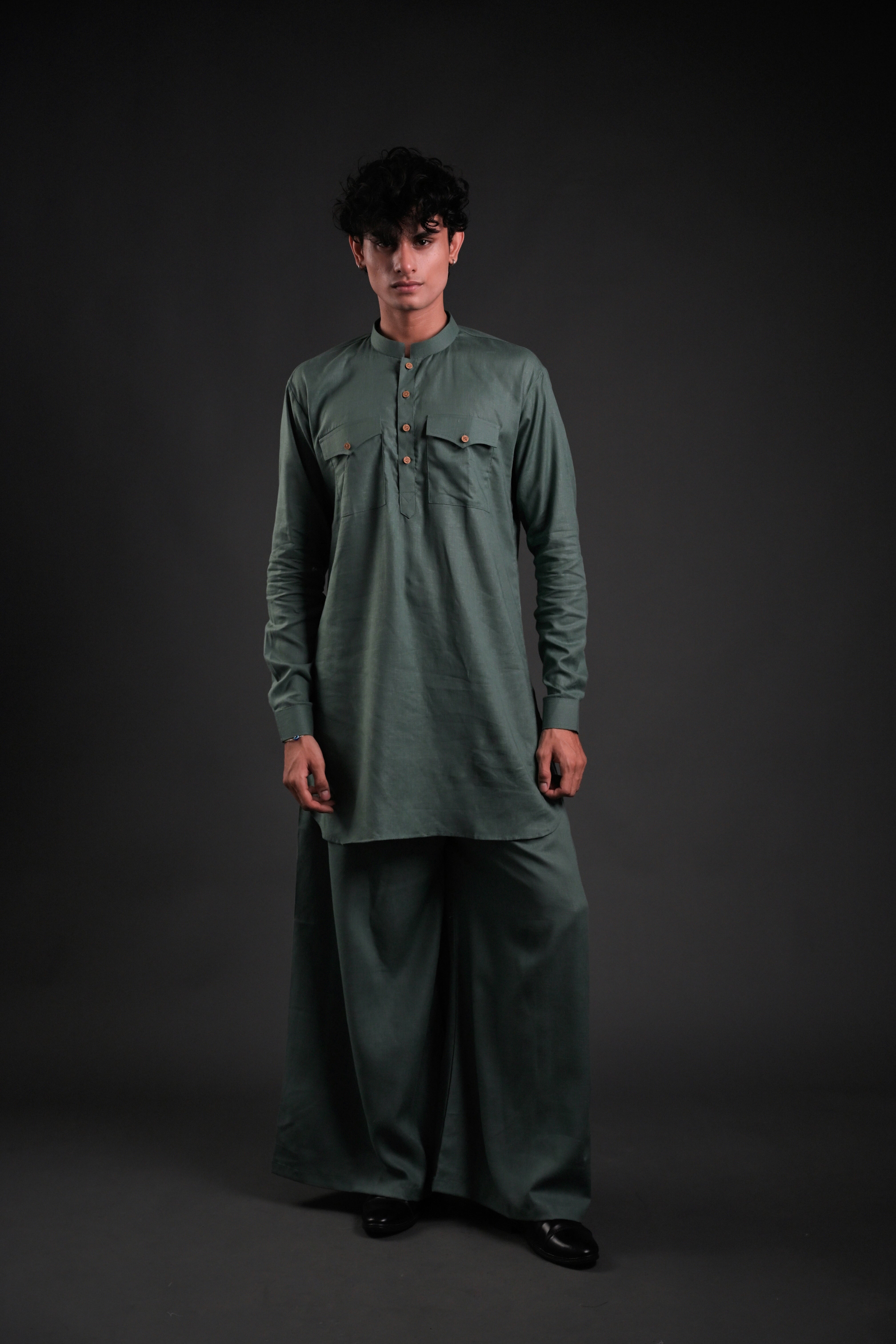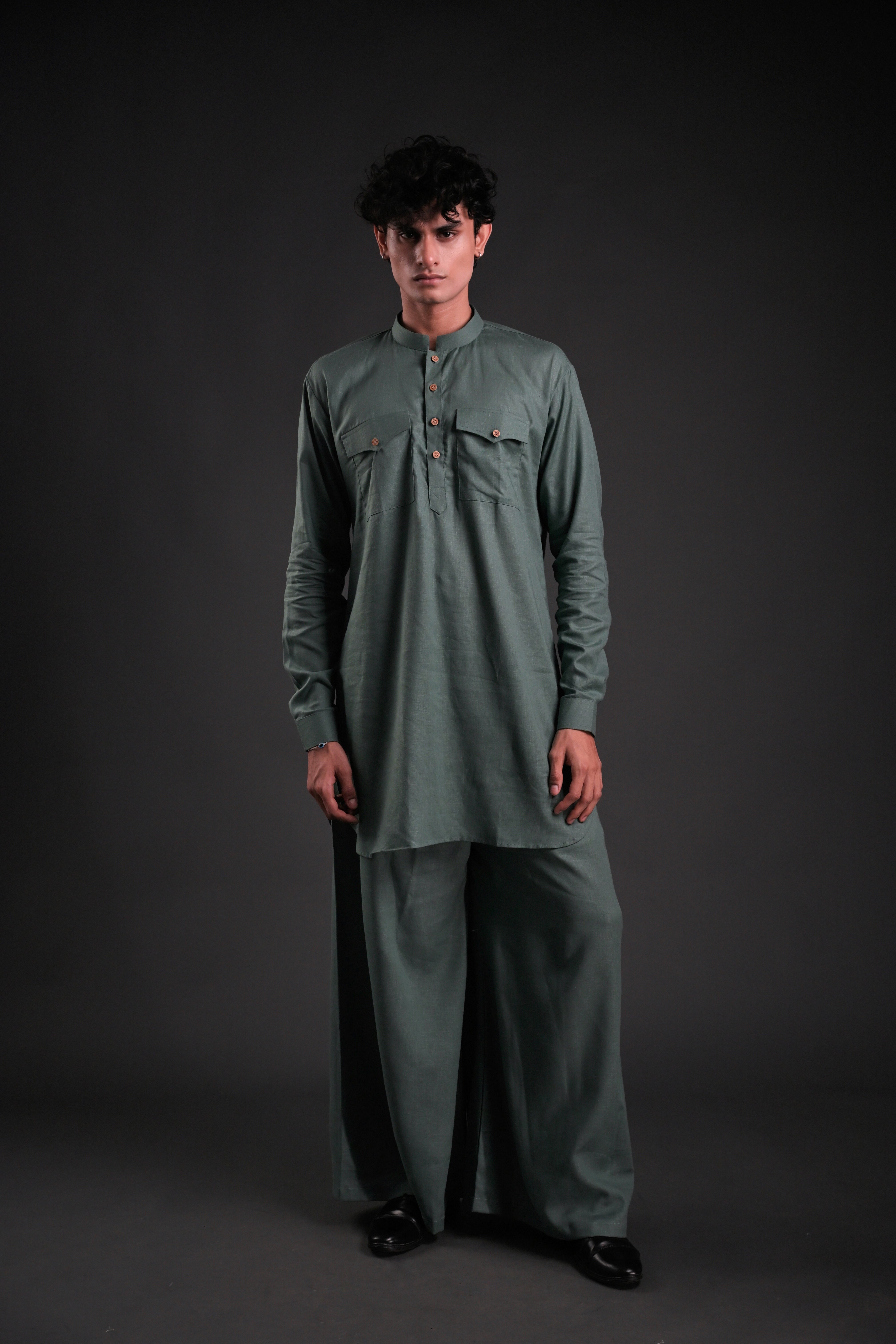 Step into effortless elegance with our Classic Green Linen Blend Pathani Suit with Flared Pants. Crafted from premium linen blend fabric, this ensemble blends timeless tradition with contemporary style. The short kurta features a mandarin collar, full regular sleeves, and a side-slit design for added comfort and versatility. Paired with flared pants, this outfit is ideal for family gatherings, wedding functions, or casual evening lounging. The curved hemline adds a modern touch to the classic Pathani silhouette, making it a perfect choice for any occasion.