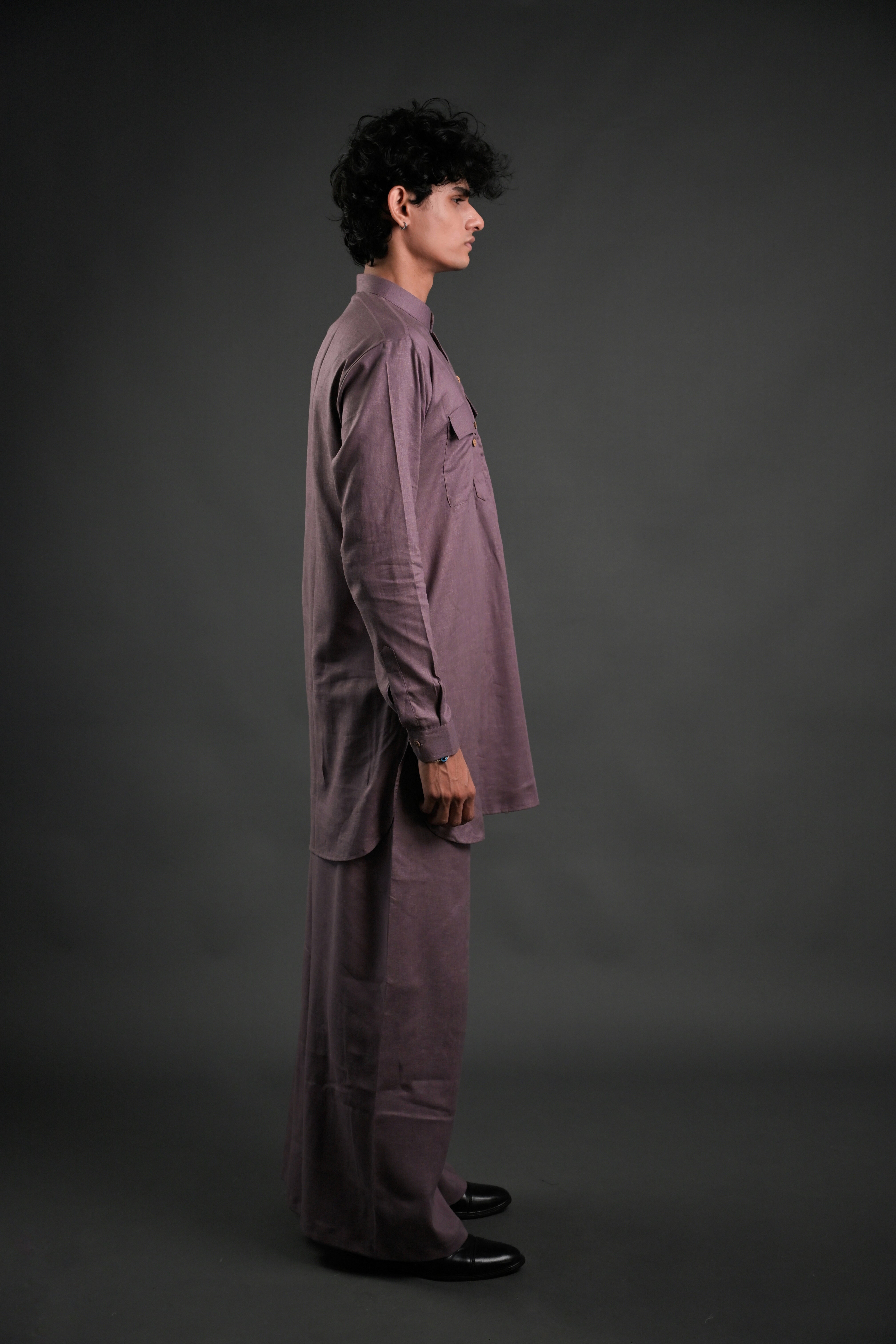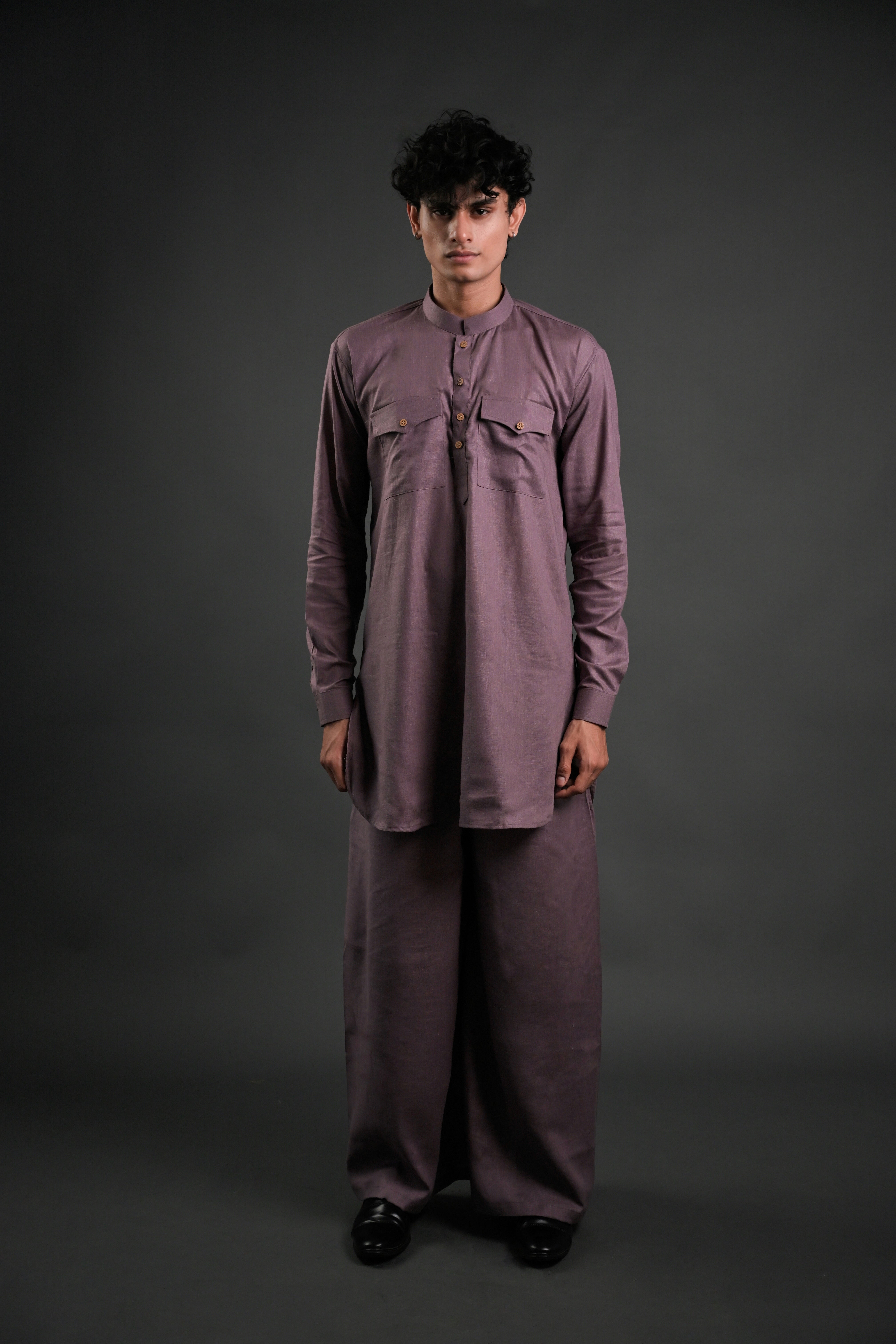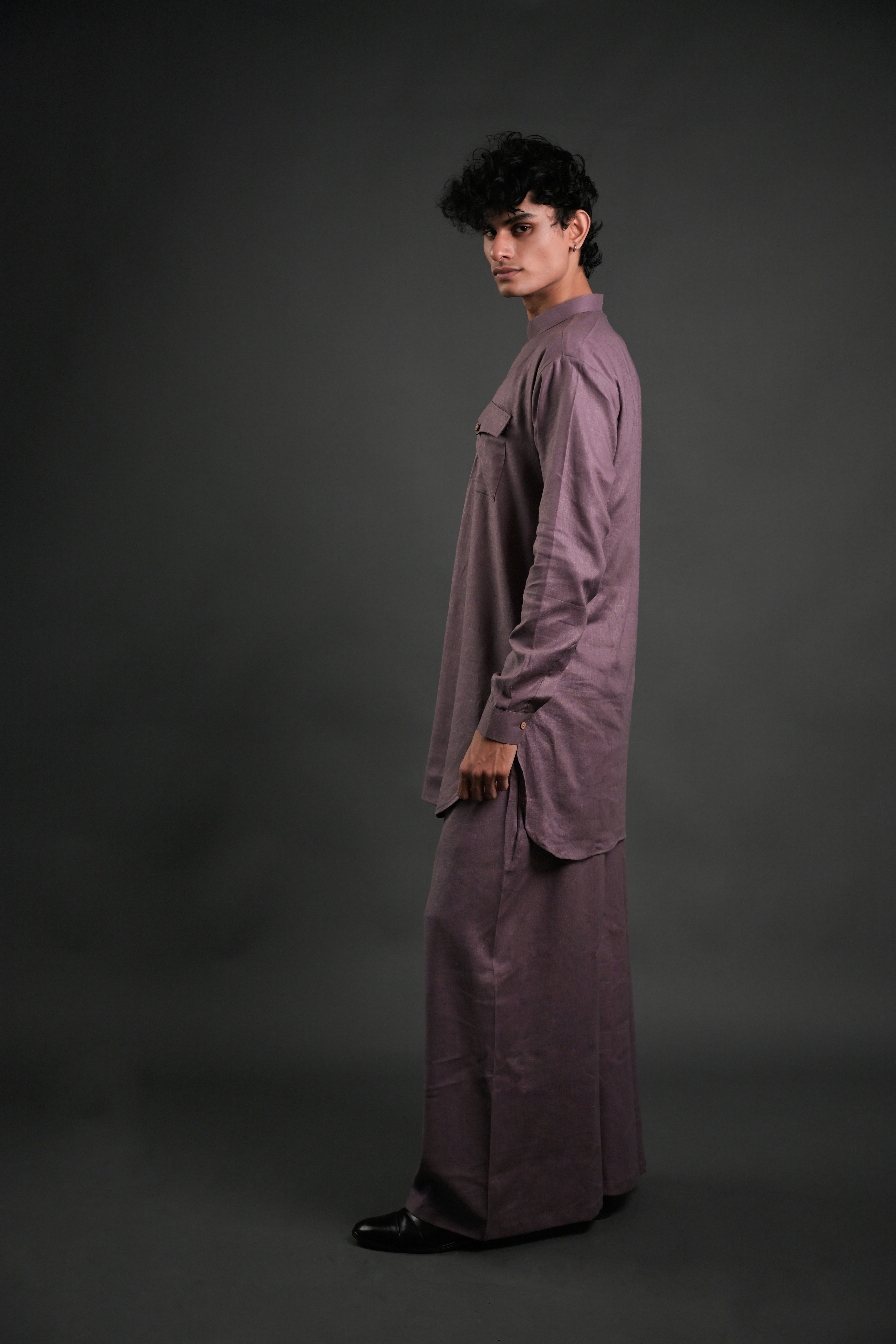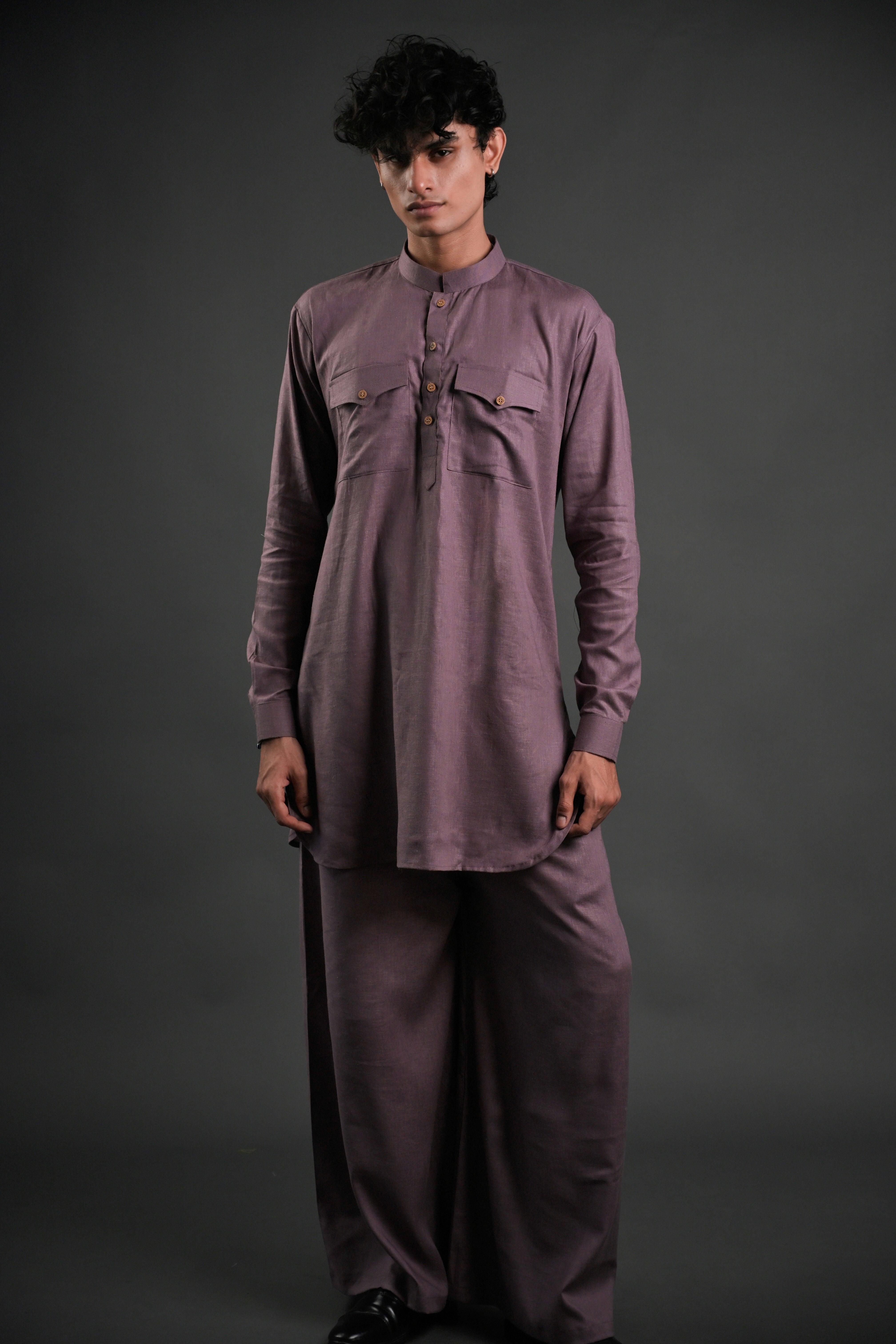 Step into effortless elegance with our Classic Mauve Linen Blend Pathani Suit with Flared Pants. Crafted from premium linen blend fabric, this ensemble blends timeless tradition with contemporary style. The short kurta features a mandarin collar, full regular sleeves, and a side-slit design for added comfort and versatility. Paired with flared pants, this outfit is ideal for family gatherings, wedding functions, or casual evening lounging. The curved hemline adds a modern touch to the classic Pathani silhouette, making it a perfect choice for any occasion.