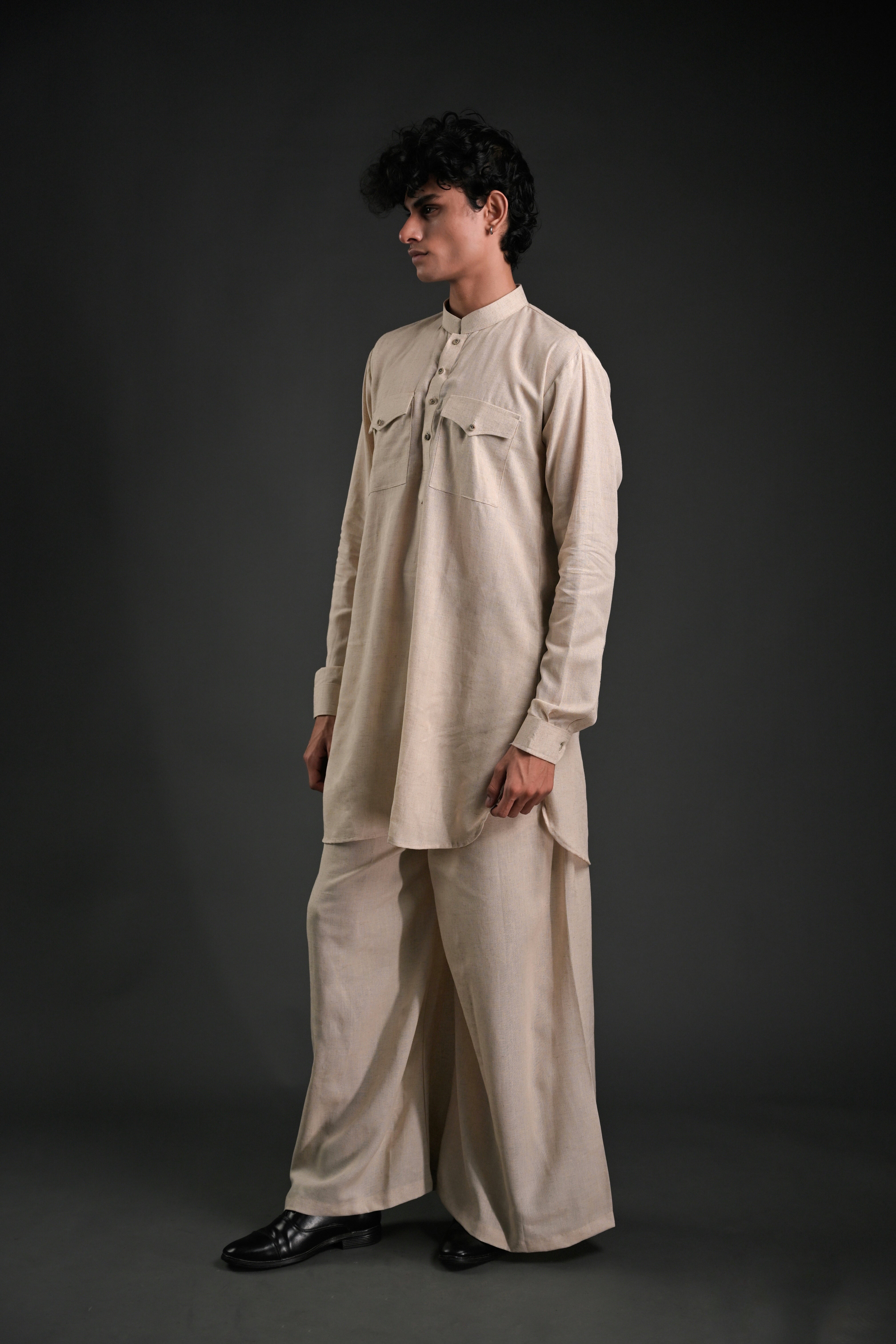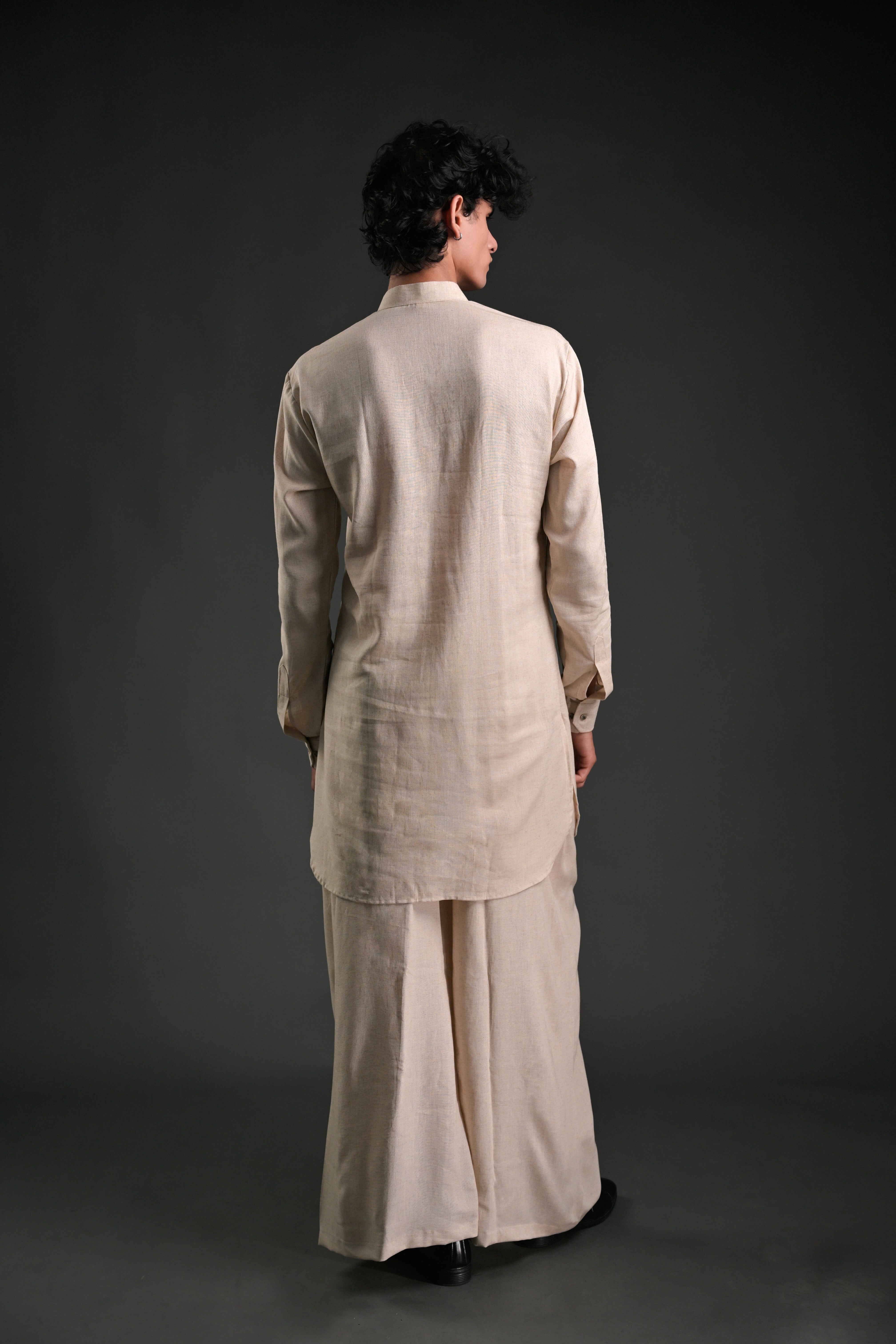 Step into effortless elegance with our Classic Natural Linen Blend Pathani Suit with Flared Pants. Crafted from premium linen blend fabric, this ensemble blends timeless tradition with contemporary style. The short kurta features a mandarin collar, full regular sleeves, and a side-slit design for added comfort and versatility. Paired with flared pants, this outfit is ideal for family gatherings, wedding functions, or casual evening lounging. The curved hemline adds a modern touch to the classic Pathani silhouette, making it a perfect choice for any occasion.