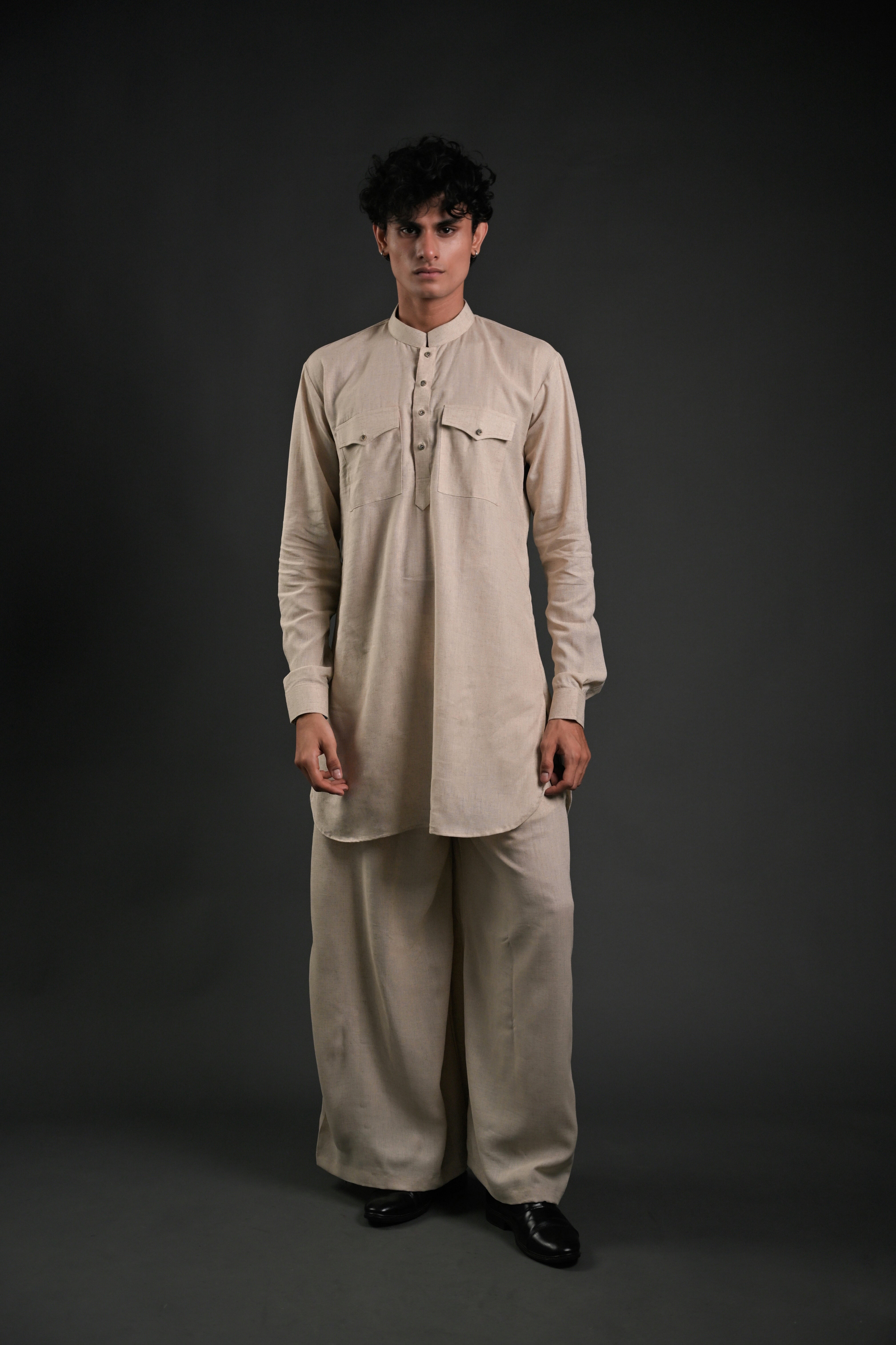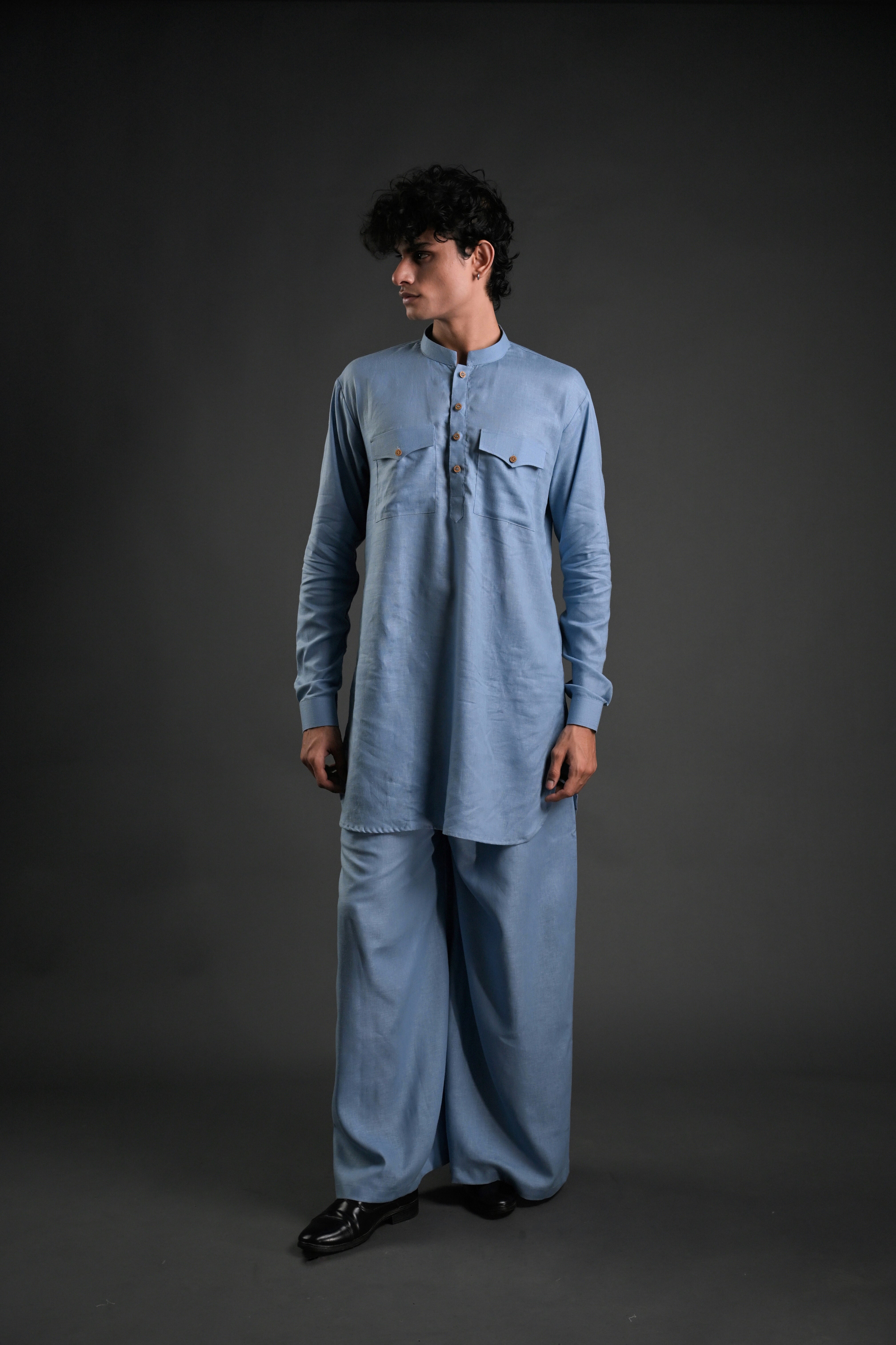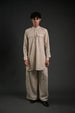 Step into effortless elegance with our Classic Linen Blend Pathani Suit with Flared Pants. Crafted from premium linen blend fabric, this ensemble blends timeless tradition with contemporary style. The short kurta features a mandarin collar, full regular sleeves, and a side-slit design for added comfort and versatility. Paired with flared pants, this outfit is ideal for family gatherings, wedding functions, or casual evening lounging. The curved hemline adds a modern touch to the classic Pathani silhouette, making it a perfect choice for any occasion.