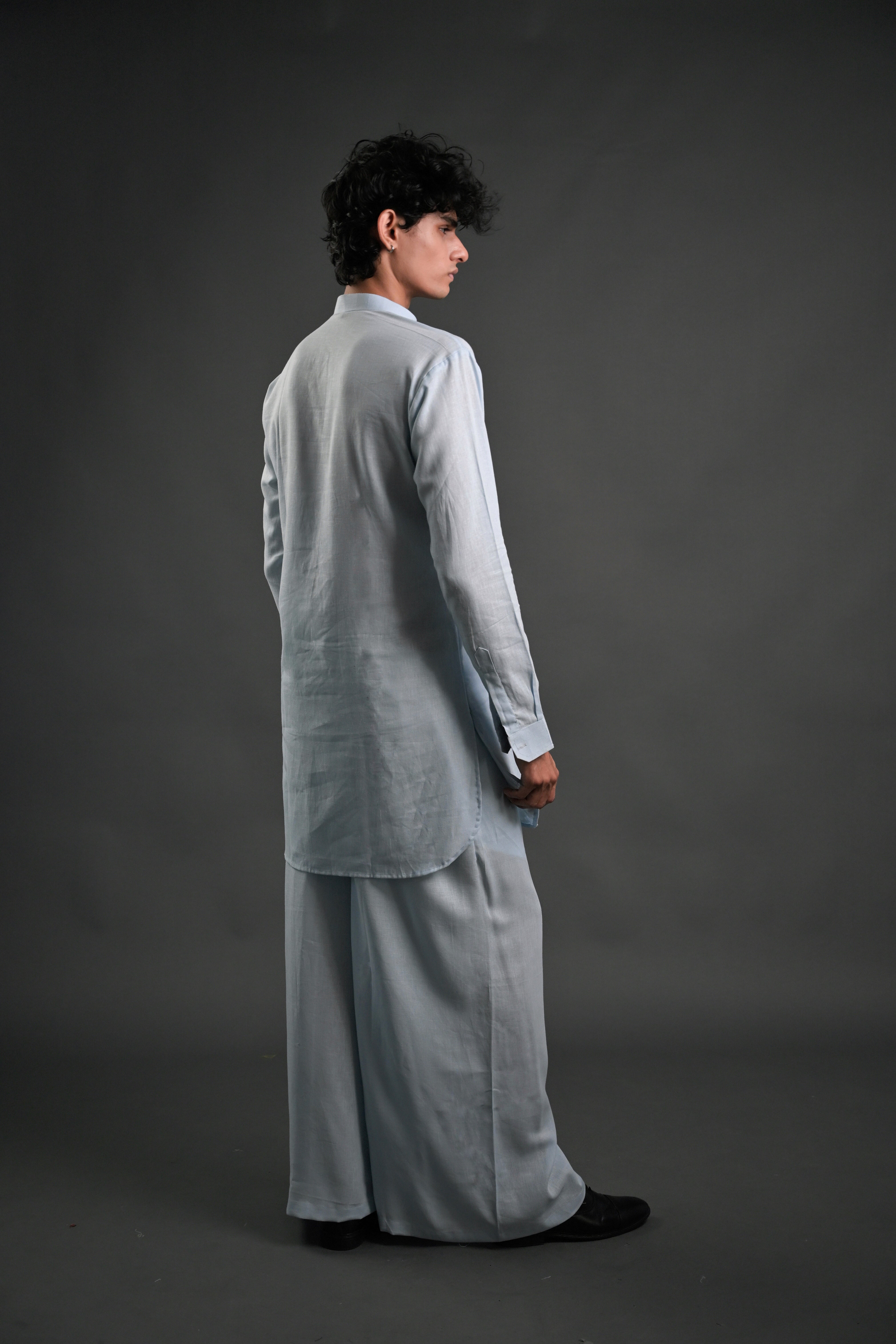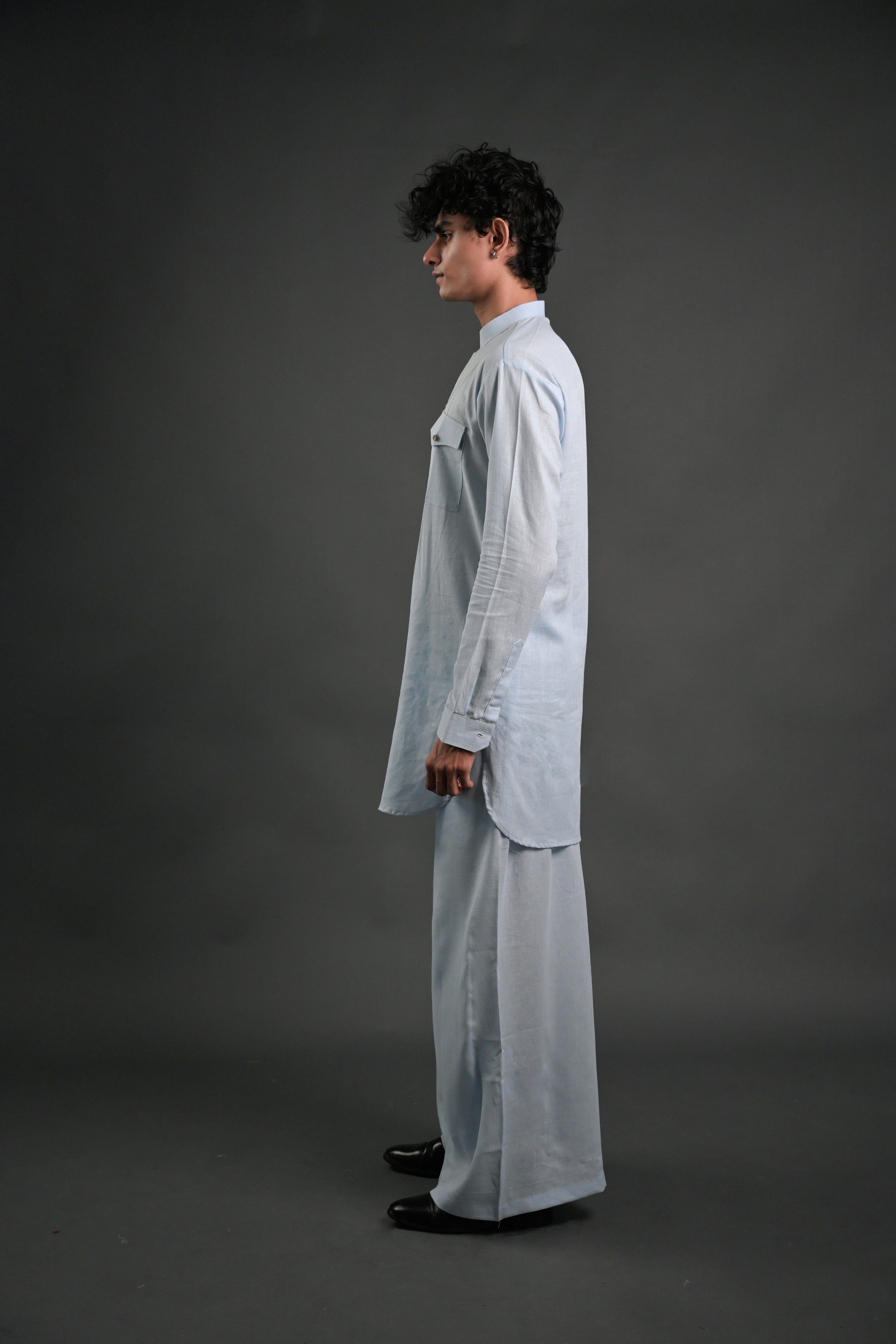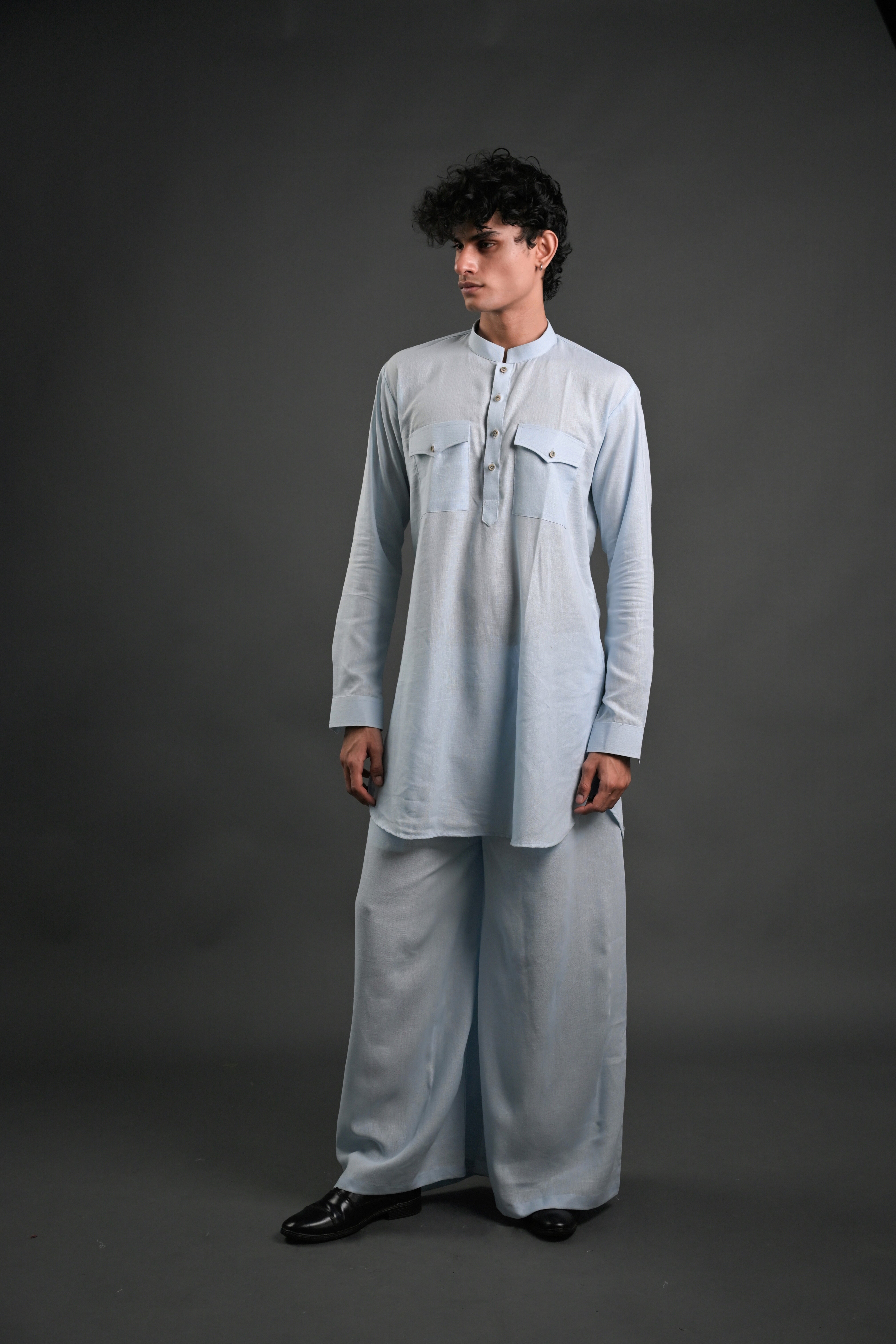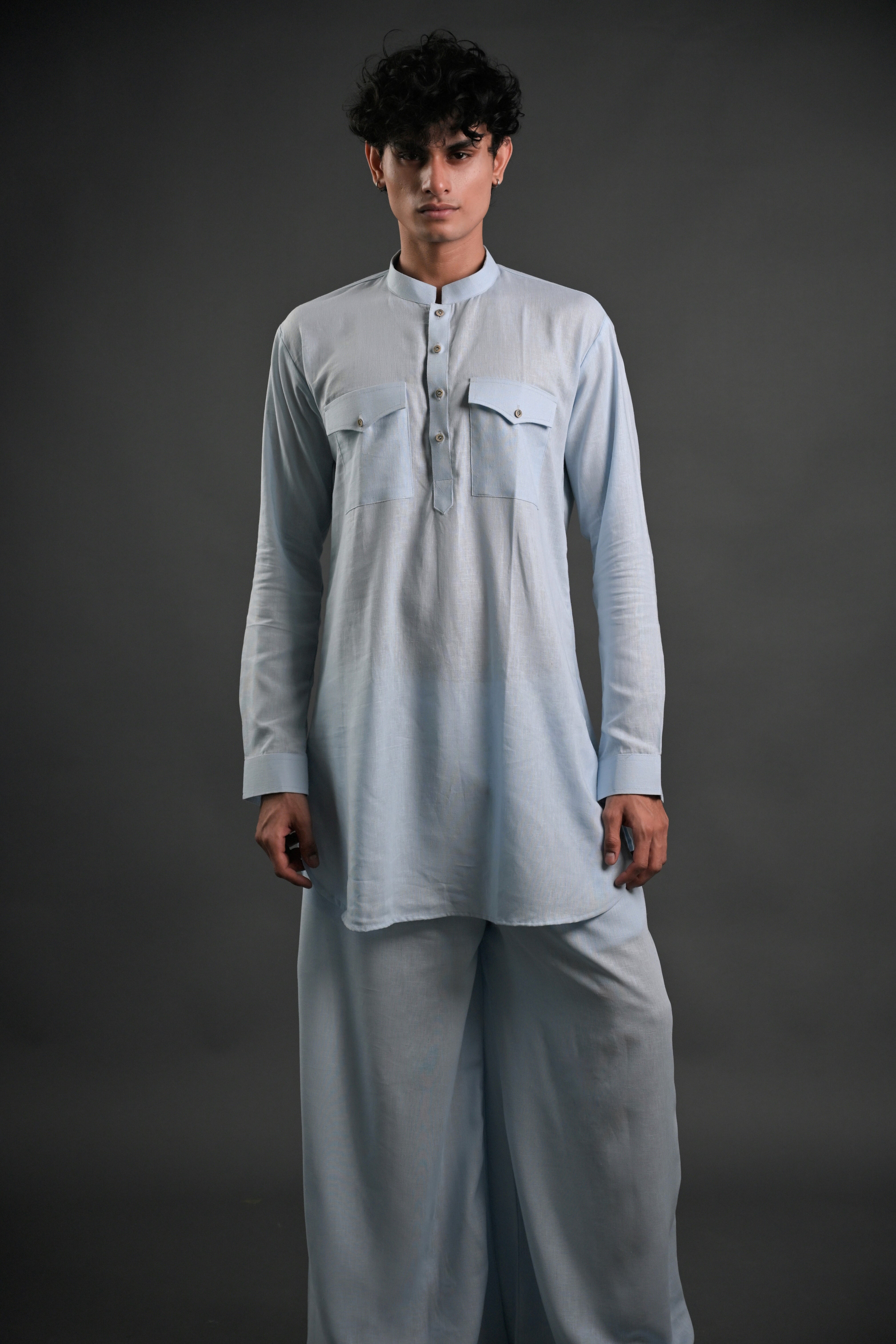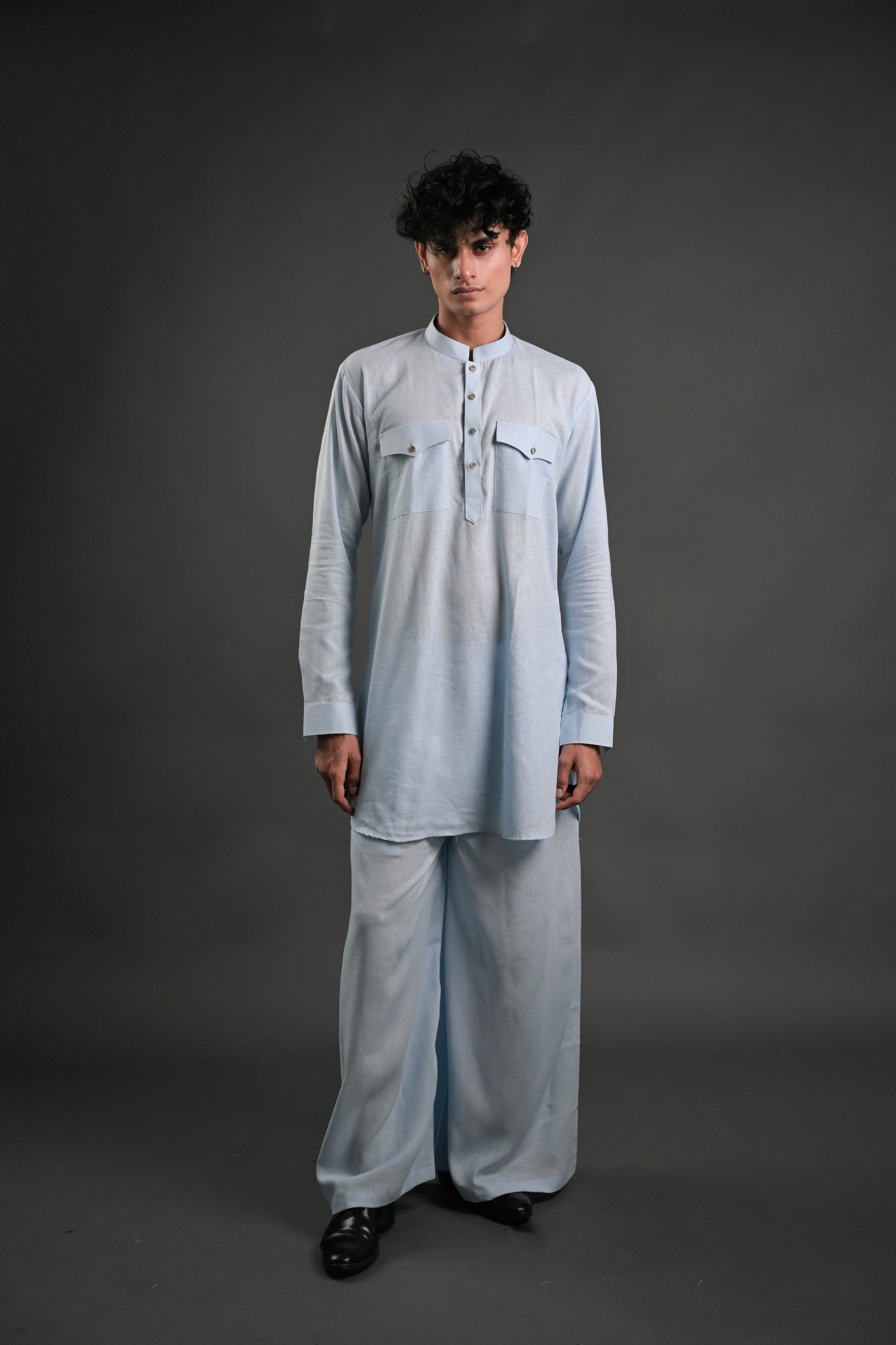Step into effortless elegance with our Classic Sky Blue Linen Blend Pathani Suit with Flared Pants. Crafted from premium linen blend fabric, this ensemble blends timeless tradition with contemporary style. The short kurta features a mandarin collar, full regular sleeves, and a side-slit design for added comfort and versatility. Paired with flared pants, this outfit is ideal for family gatherings, wedding functions, or casual evening lounging. The curved hemline adds a modern touch to the classic Pathani silhouette, making it a perfect choice for any occasion.