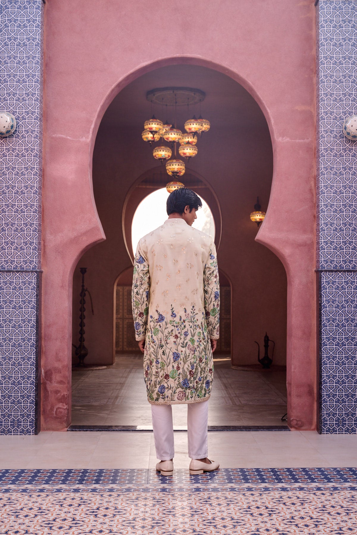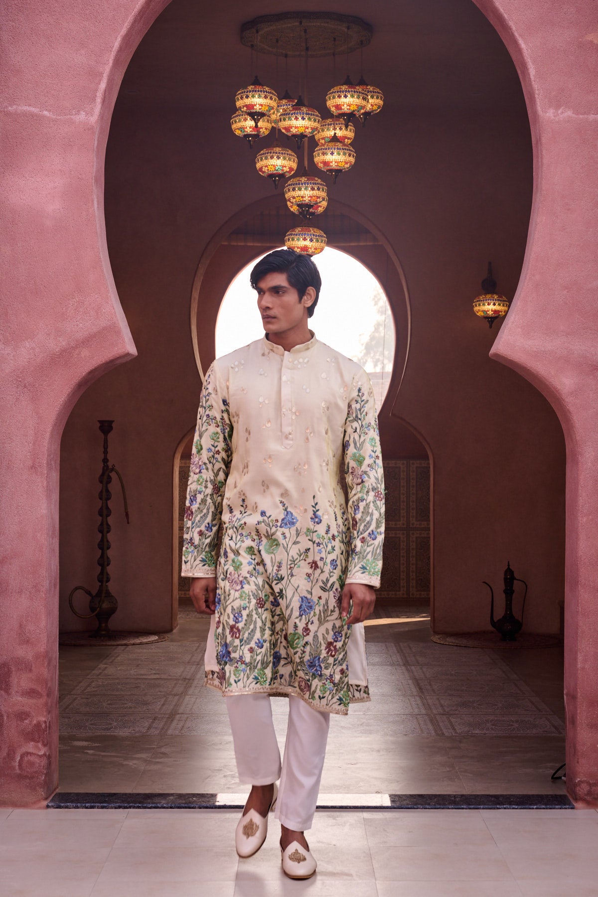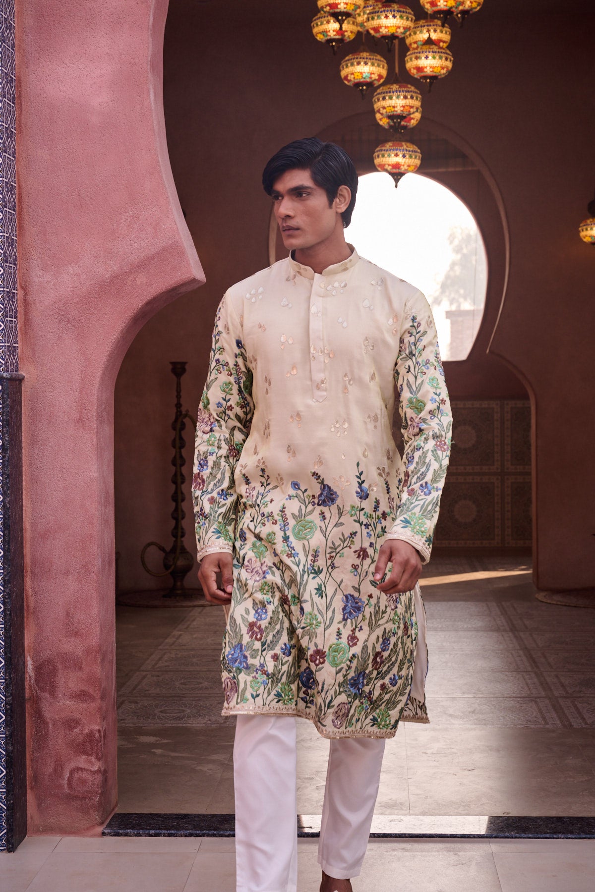 Elevate your festive style with this Cream Tissue Silk Kurta Set, adorned with intricate golden zari thread and multicolour thread work embroidery. Featuring a mandarin collar, full sleeves, and a knee-length silhouette with side slits, this kurta is a perfect blend of elegance and comfort. Paired with a straight pant, this ensemble is ideal for festive celebrations.