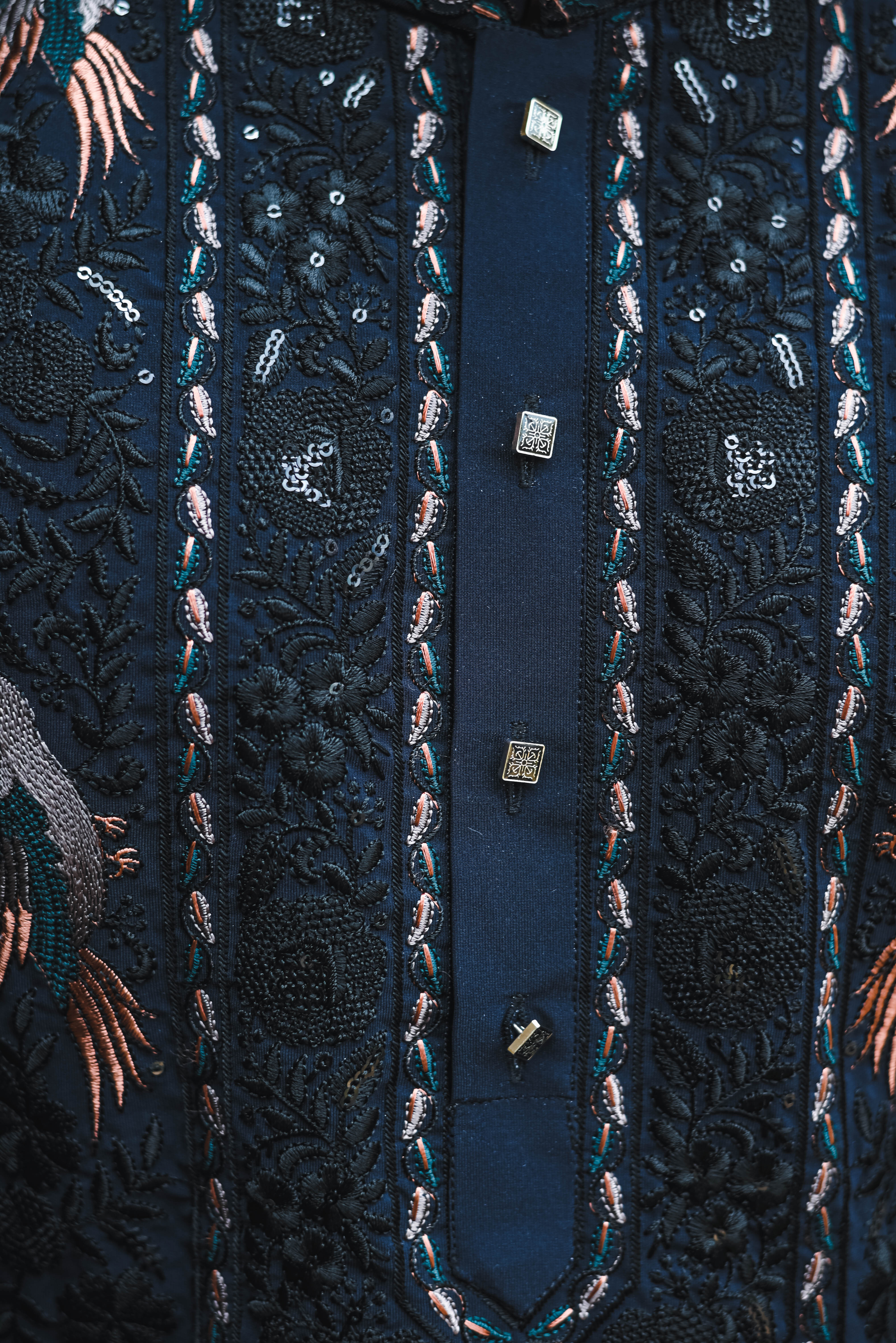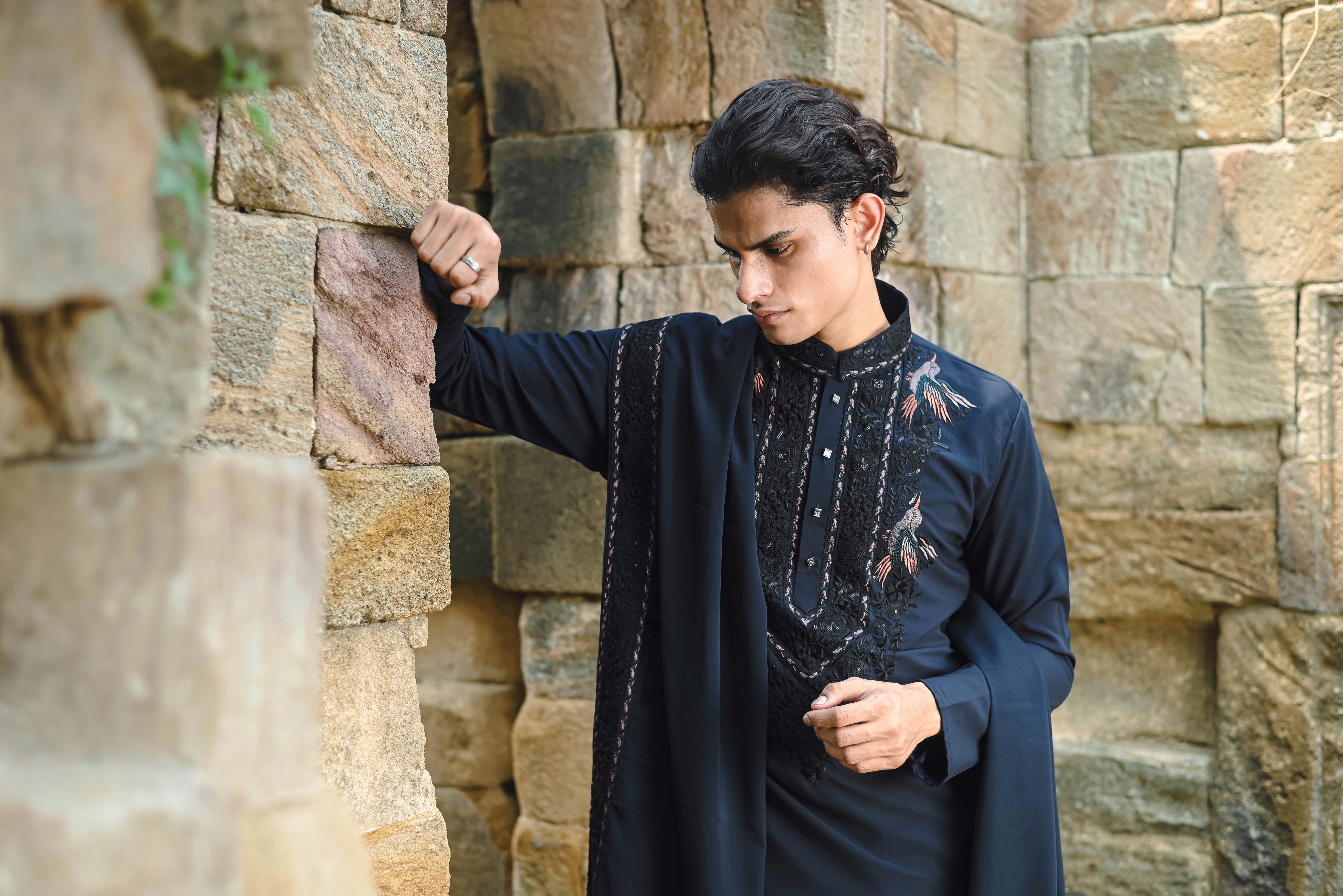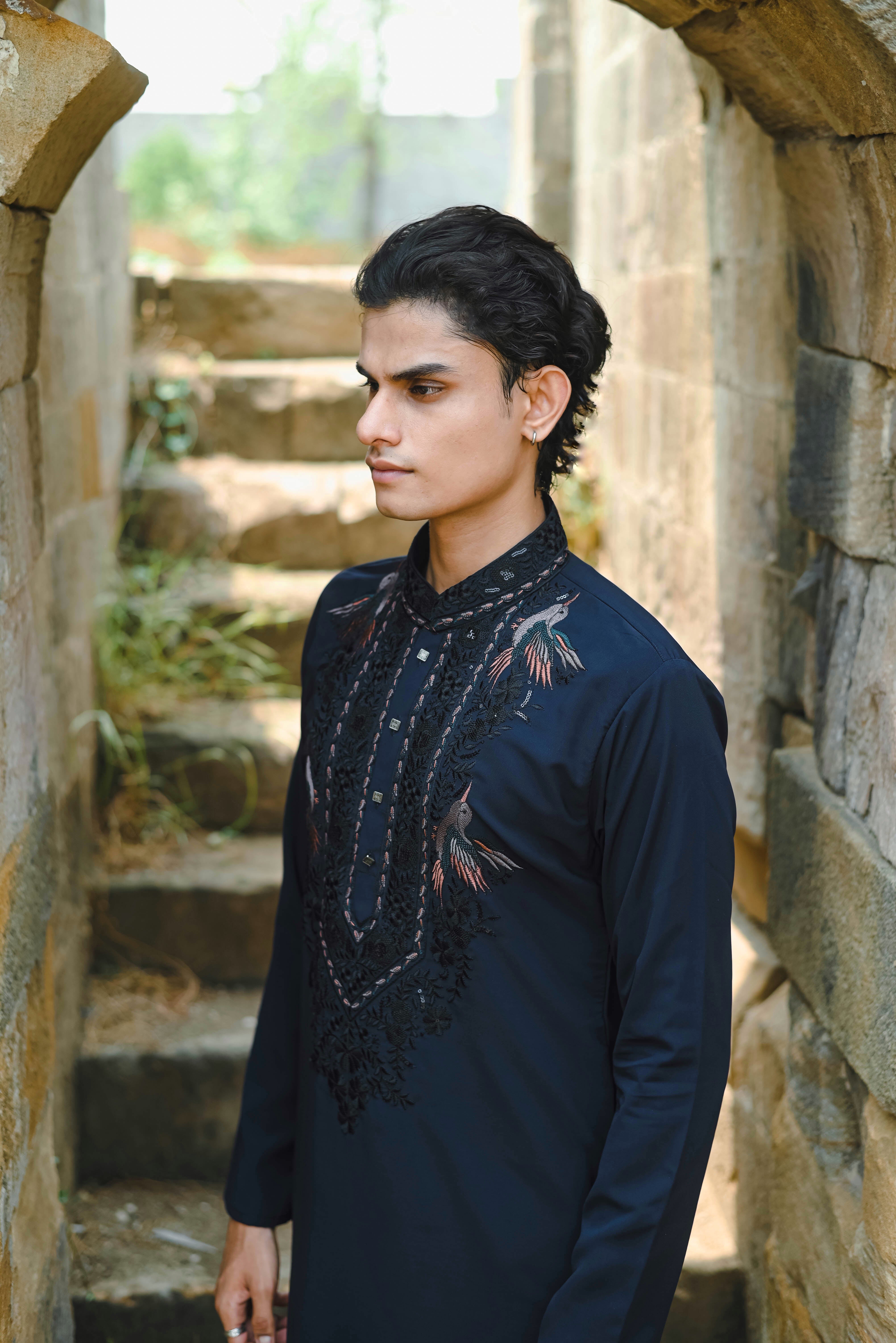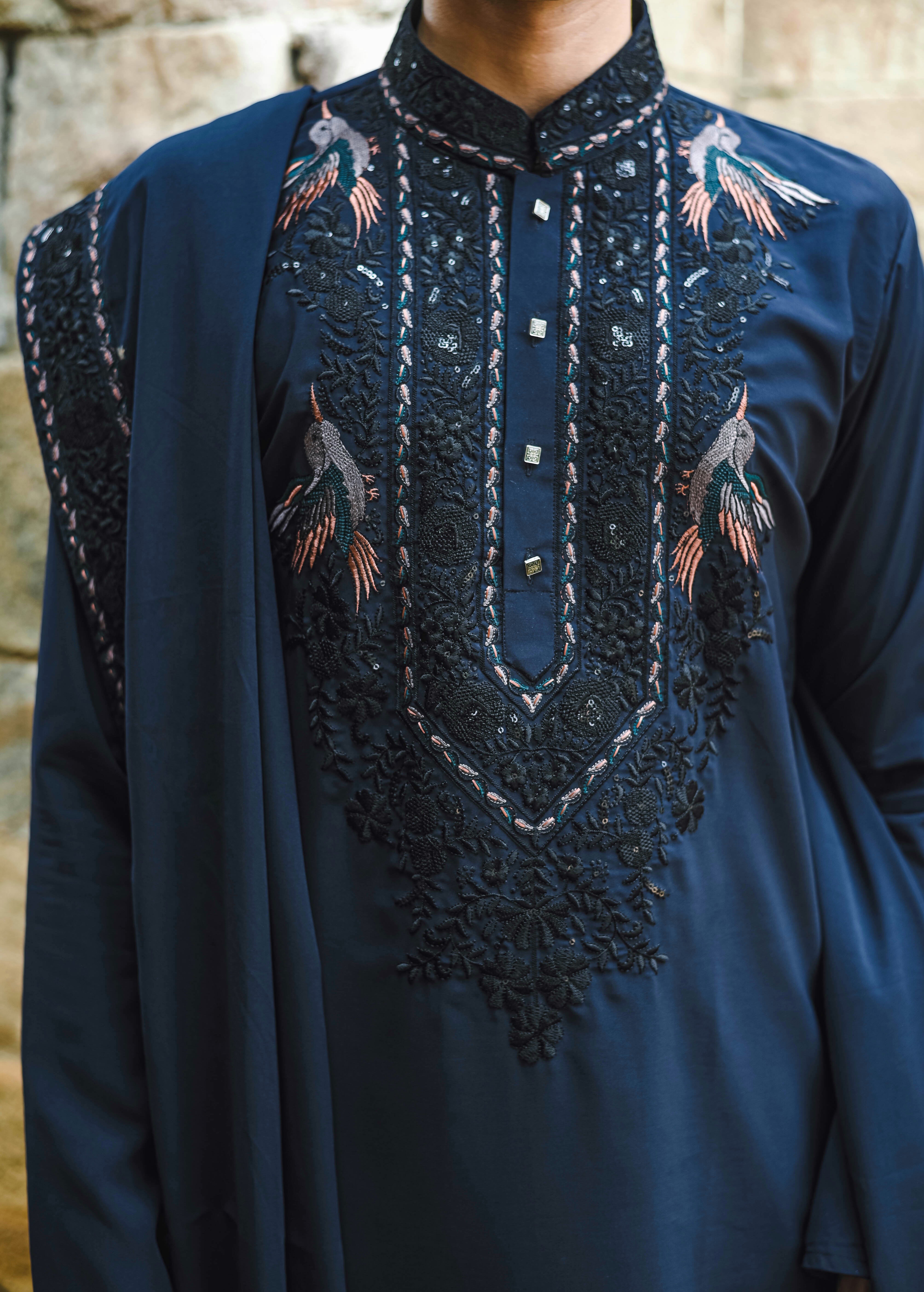 Make a graceful statement in this Men’s Dark Blue Kurta Set, designed with fine thread work embroidery that adds timeless charm. This elegant set features a full-sleeve kurta with a mandarin collar, a knee-length straight silhouette, and side slits for easy movement. Crafted for festive occasions, it comes complete with a matching bottom and a coordinated dupatta, making it a well-rounded look for traditional celebrations and cultural events.