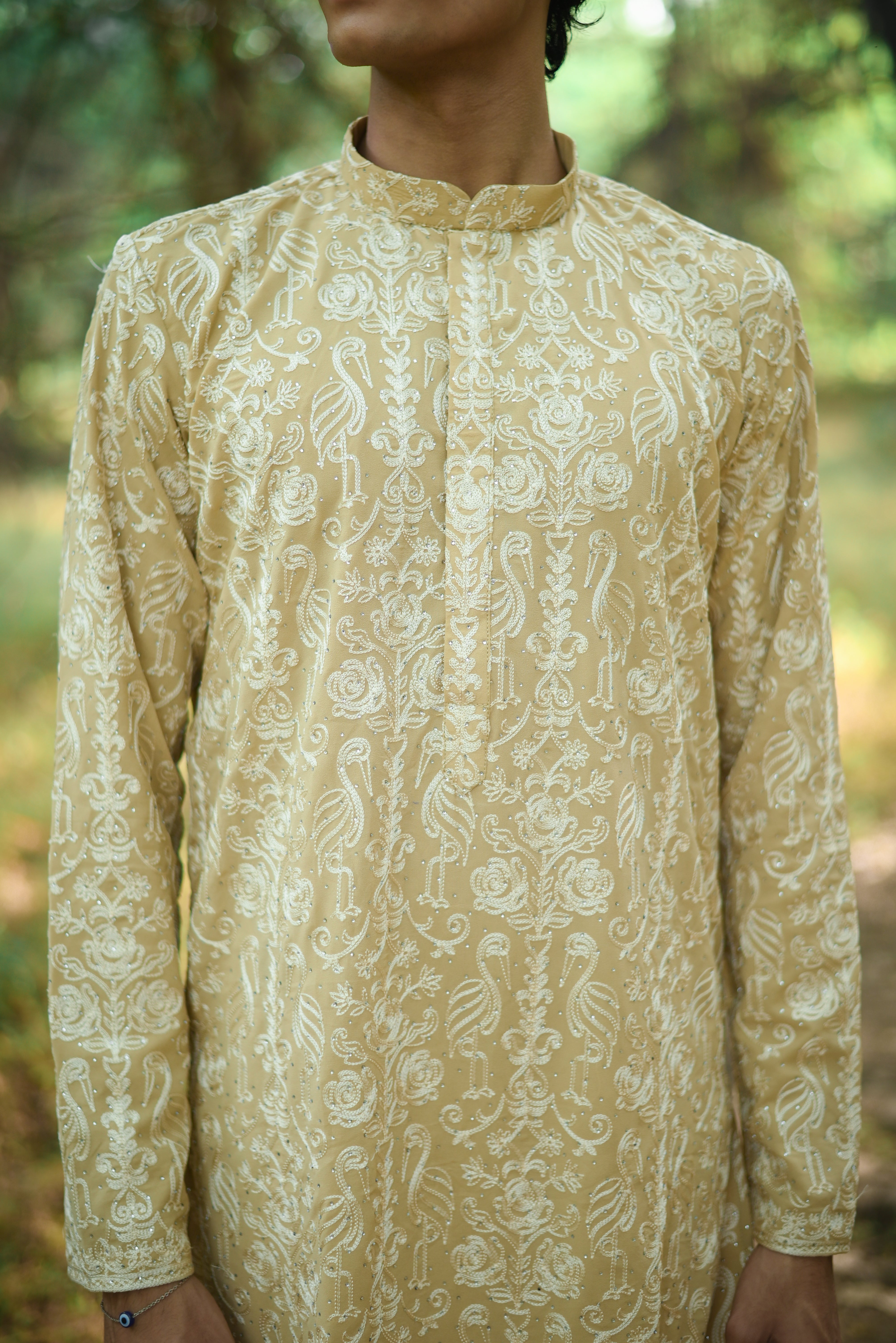 Add a refined touch to your festive collection with this Men's Fawn Crepe Kurta Set. The kurta showcases exquisite thread work embroidery, full sleeves, and a mandarin collar for a classic yet contemporary look. The knee-length design with side slits ensures effortless movement, while the straight-cut fit offers timeless elegance. Paired with a matching straight pant, this ensemble is perfect for festive gatherings.
