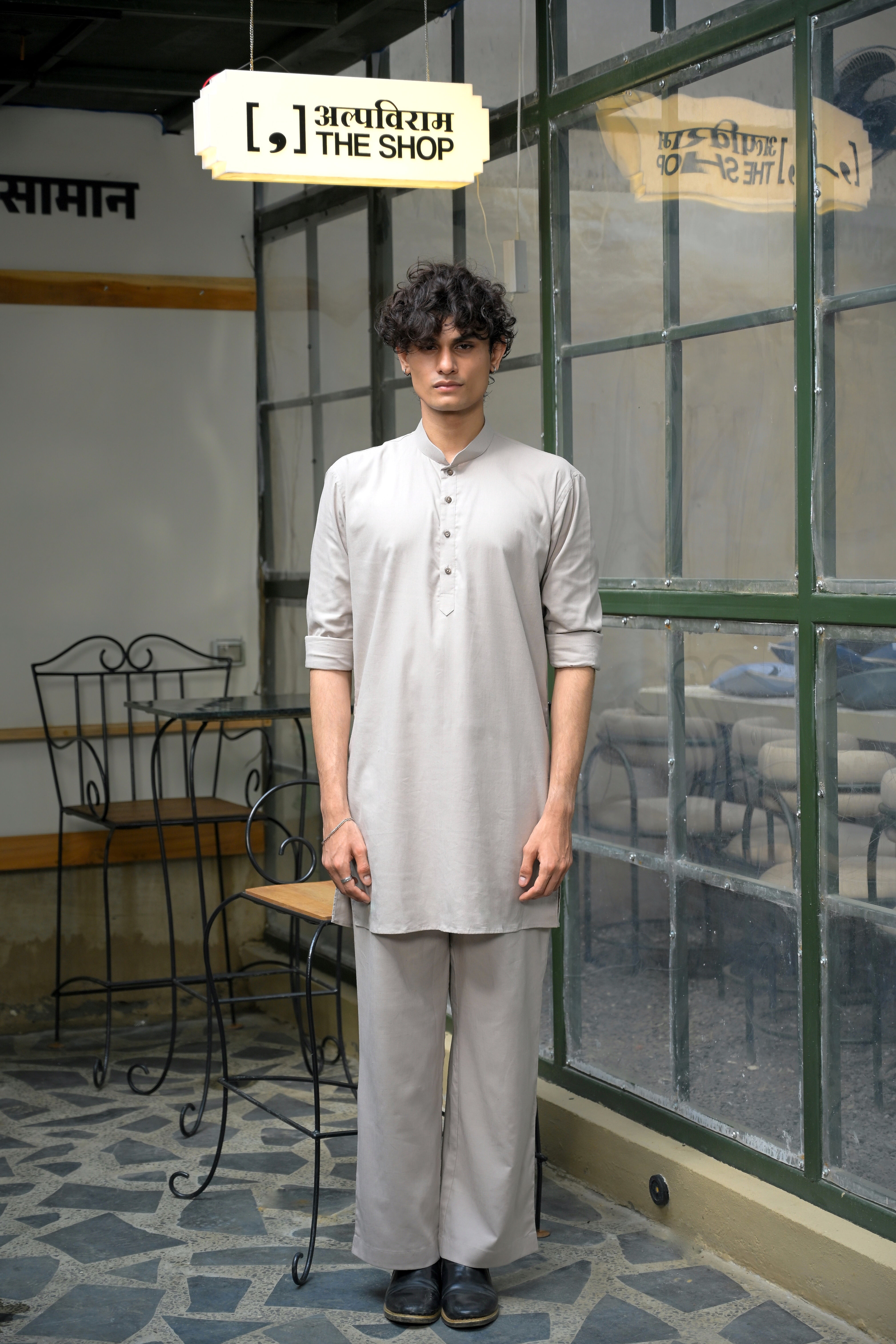 Enhance your festive and everyday wardrobe with this Men's Grey 5 Blend Linen Short Kurta Set. Crafted from a premium blend of linen fabrics, this kurta offers a soft, breathable texture and a refined look. Designed with a mandarin collar, full sleeves, and a straight hemline, this above-knee kurta combines comfort with understated elegance. Paired with matching straight pants, it is a versatile choice for both regular wear and festive occasions.