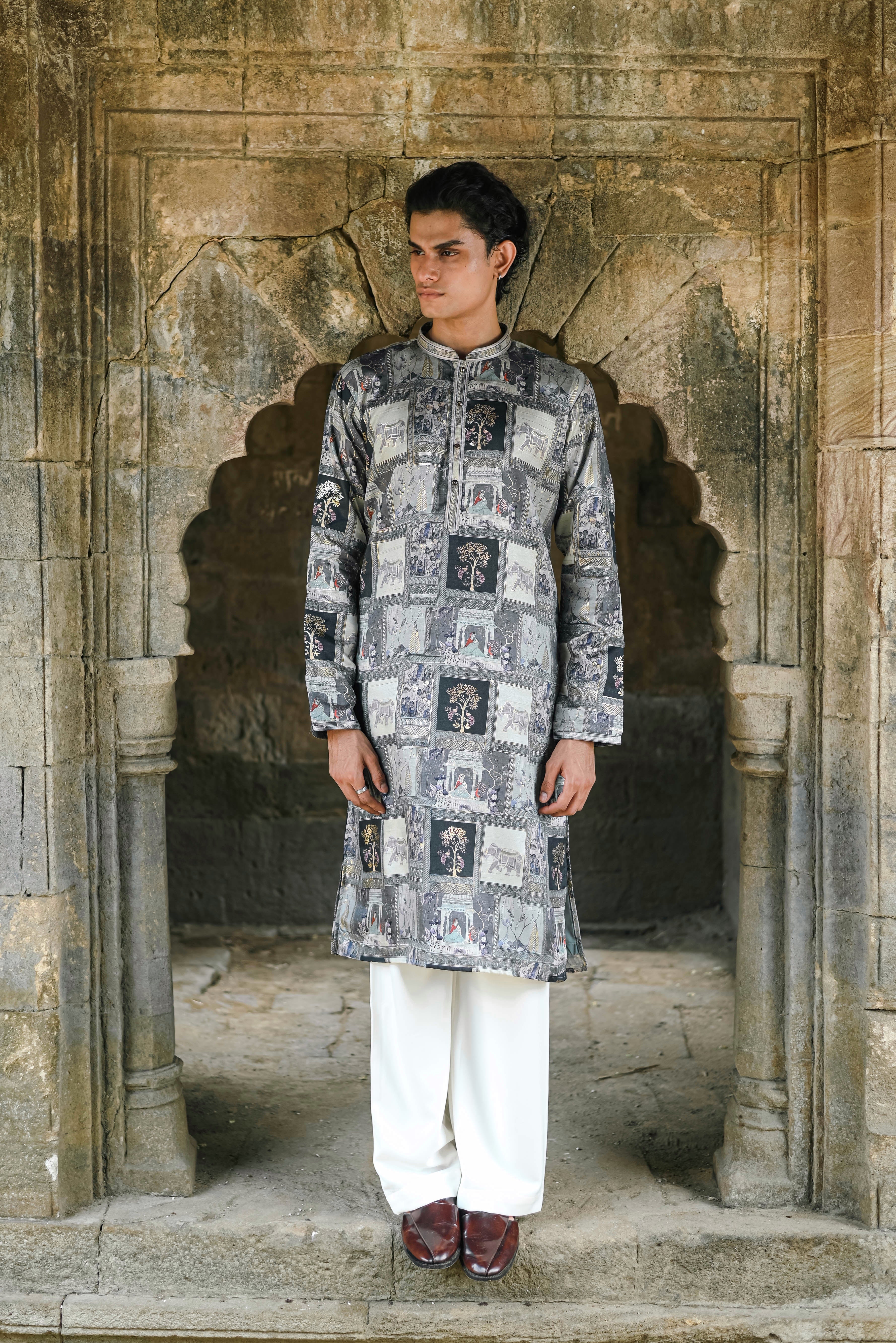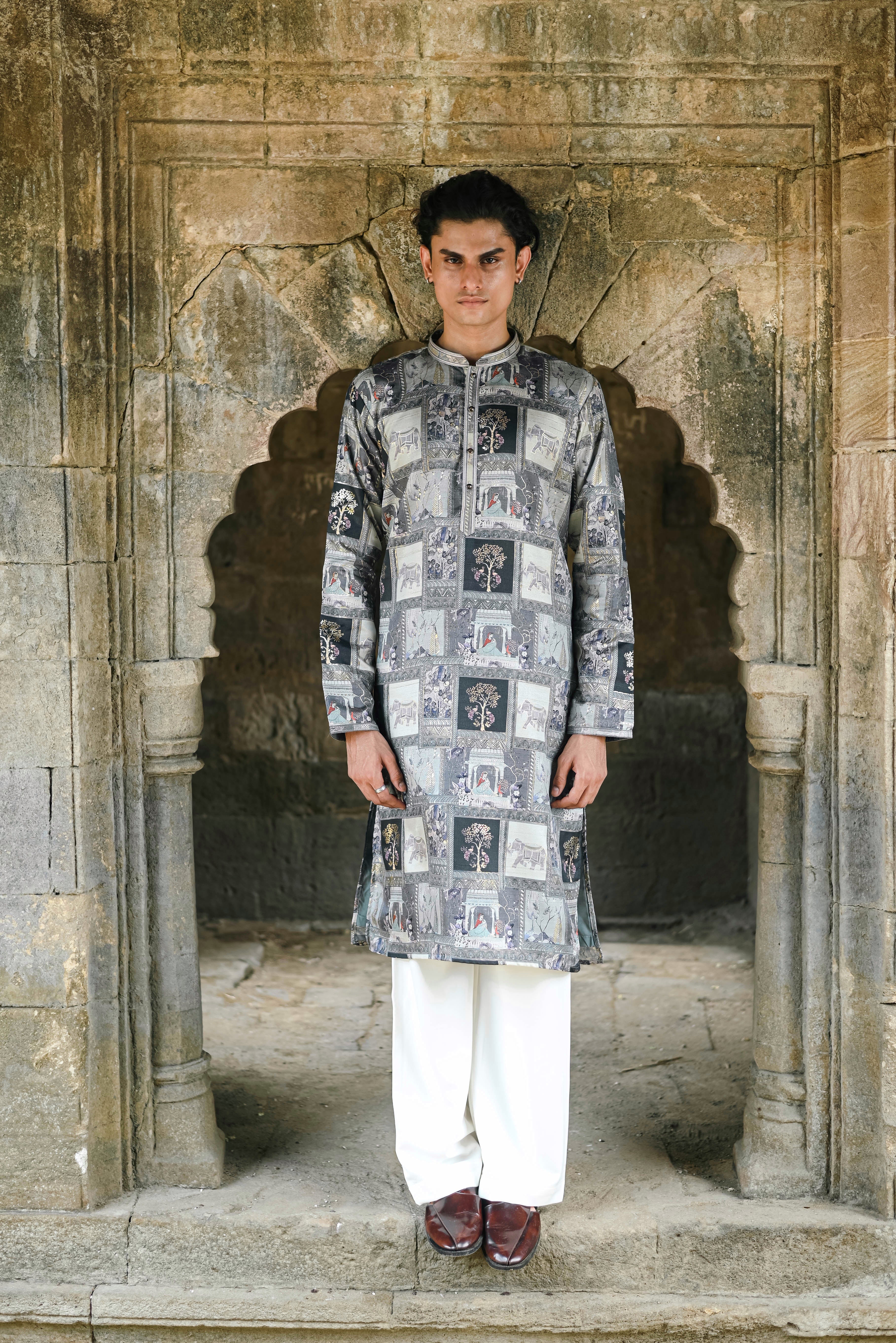 Step out in style with this elegant Men’s Grey Silk Kurta. Made from smooth silk fabric, it features eye-catching digital prints paired with subtle foil work that adds just the right amount of shine. Designed with full sleeves, a neat mandarin collar, and a comfortable knee-length straight cut with side slits, this kurta balances tradition and modern flair perfectly. The matching bottom completes the look, making it a great choice for festive occasions and celebrations.