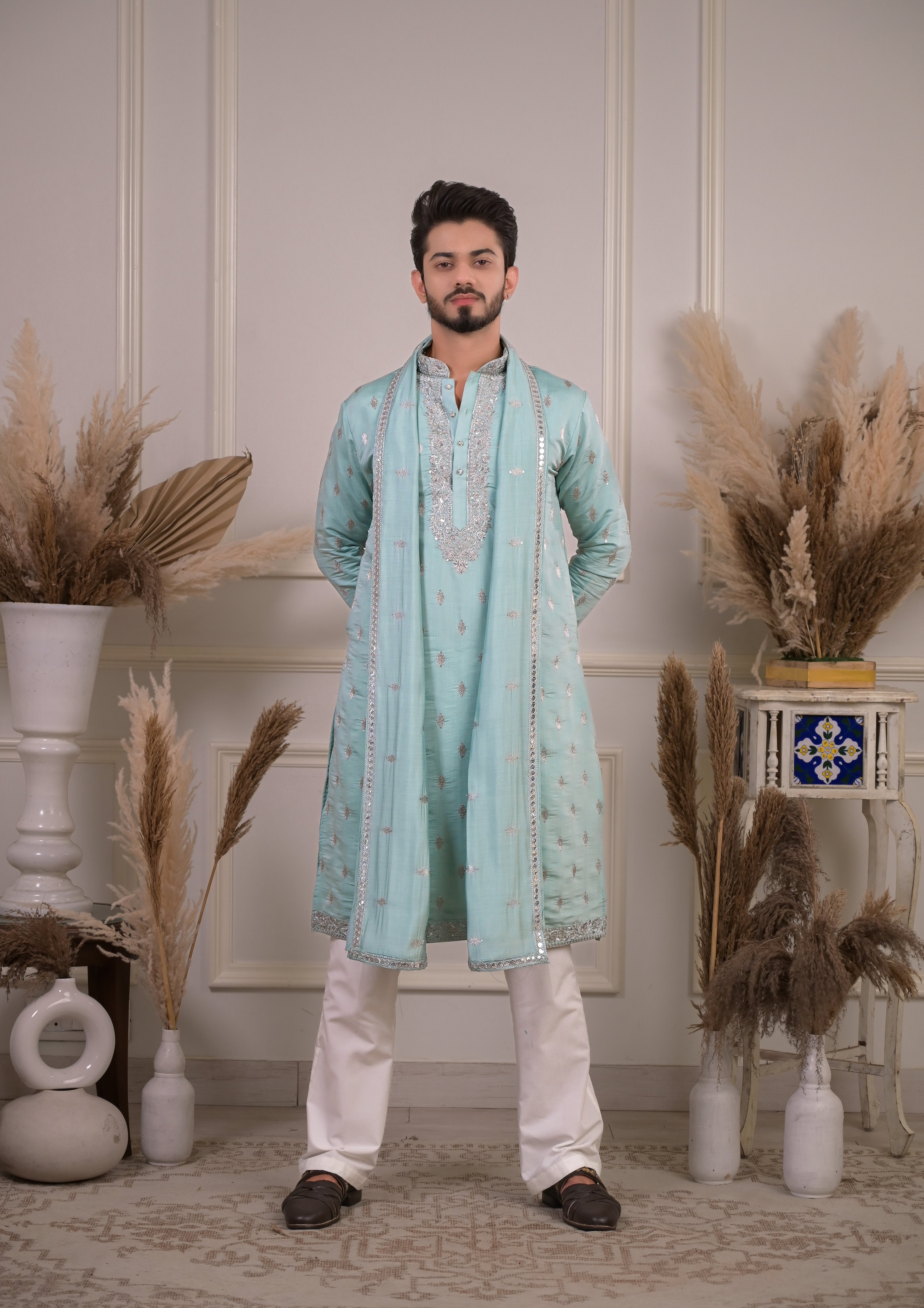 Elevate your festive wardrobe with this light blue kurta set made from luxurious silk, adorned with silver zari and sequins embroidery. The kurta features full sleeves and a mandarian collar, offering a sophisticated and timeless appeal. The knee-length design with side slits ensures both style and comfort, making it an ideal choice for festive celebrations.
