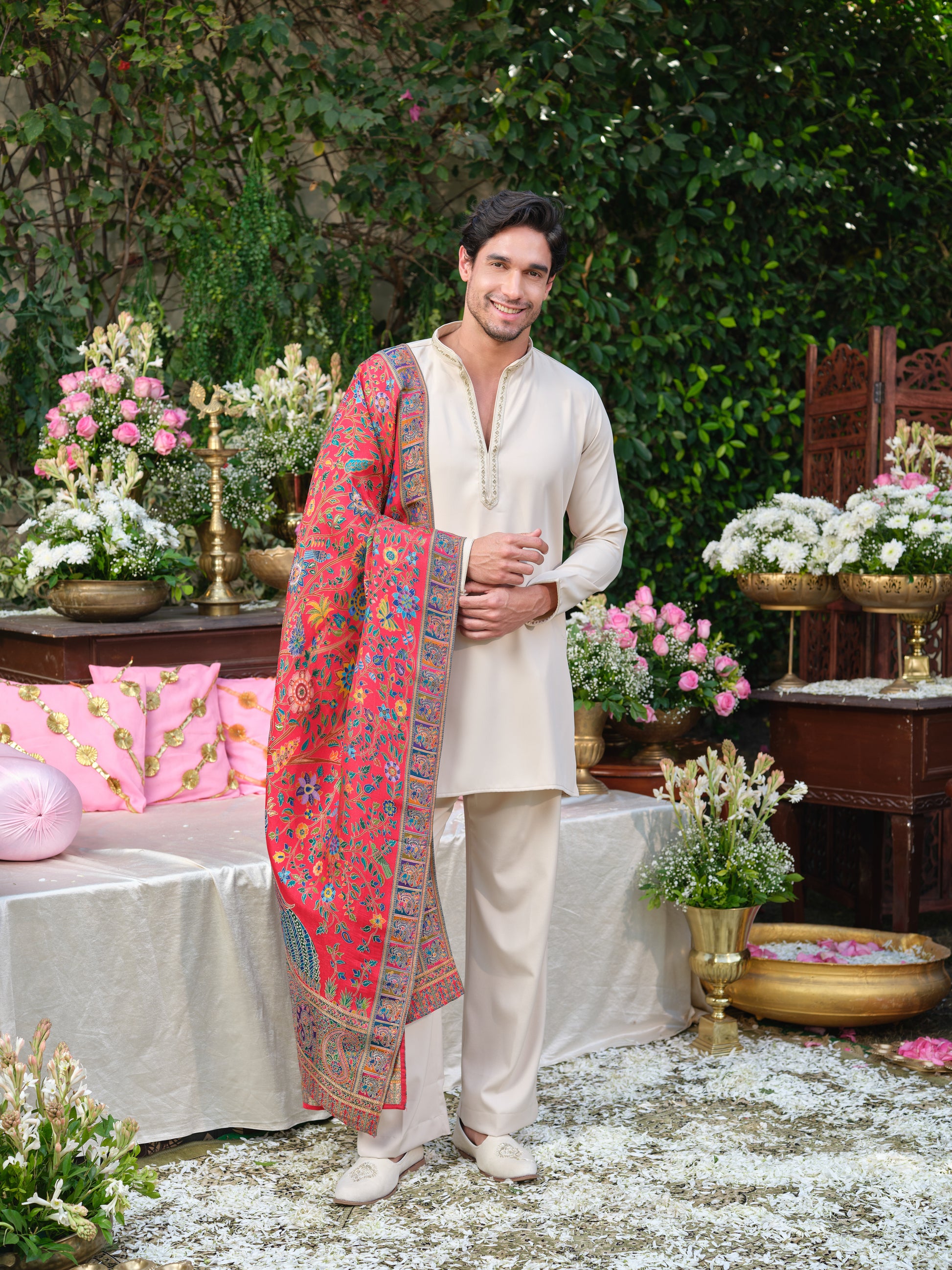 Elevate your festive style with this Men’s Beige Armani Kurta–Bottom Set with Handcrafted Detailing & Jacquard Dupatta from Rochaldas Sons. Crafted from premium Armani fabric, the kurta features elegant hand work that adds depth and artisanal charm to its timeless beige tone. Designed to balance tradition and comfort, this ensemble is ideal for refined festive dressing.