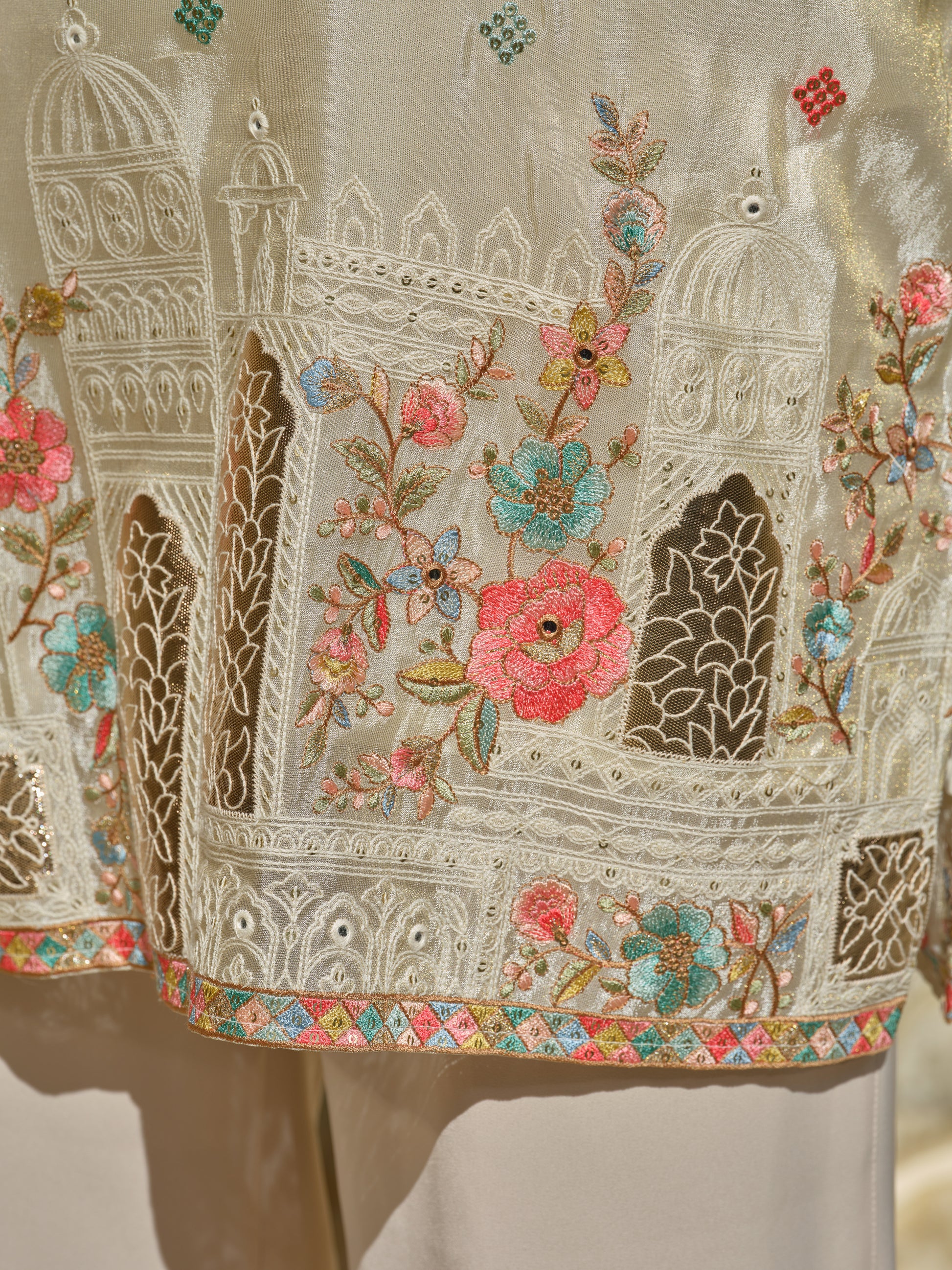 Beige Tissue Kurta–Bottom Set with Thread & Foil Embroidery
