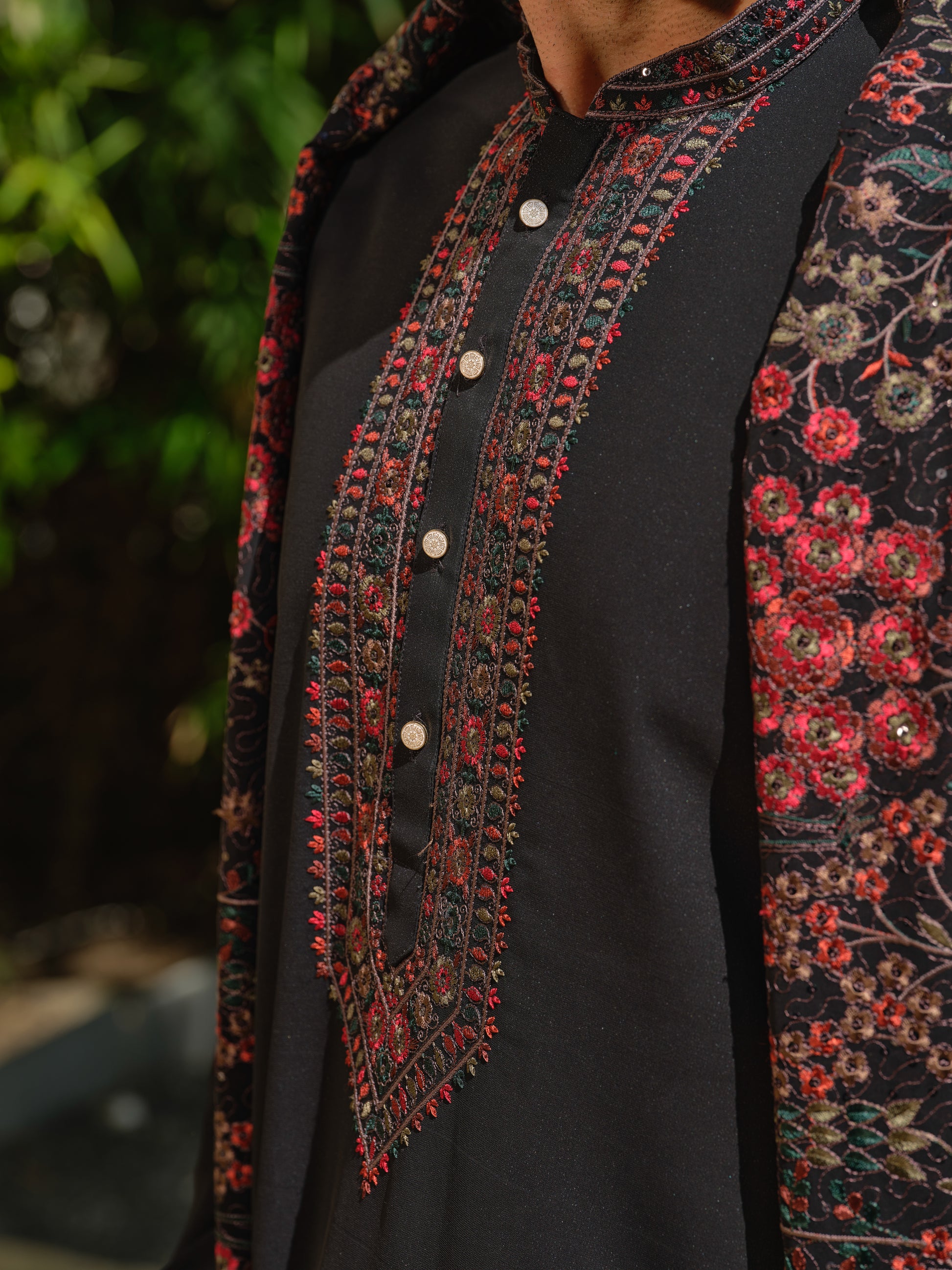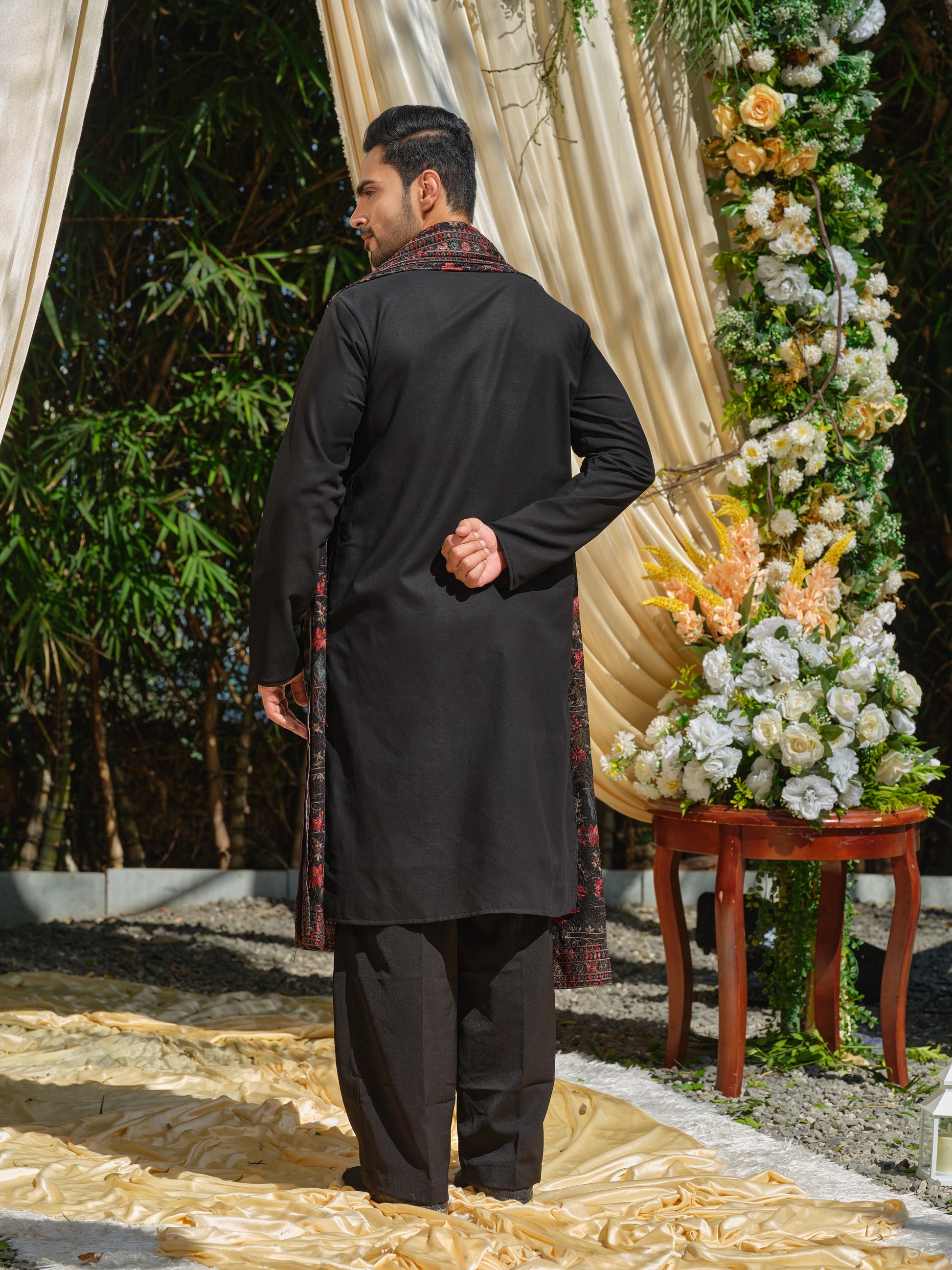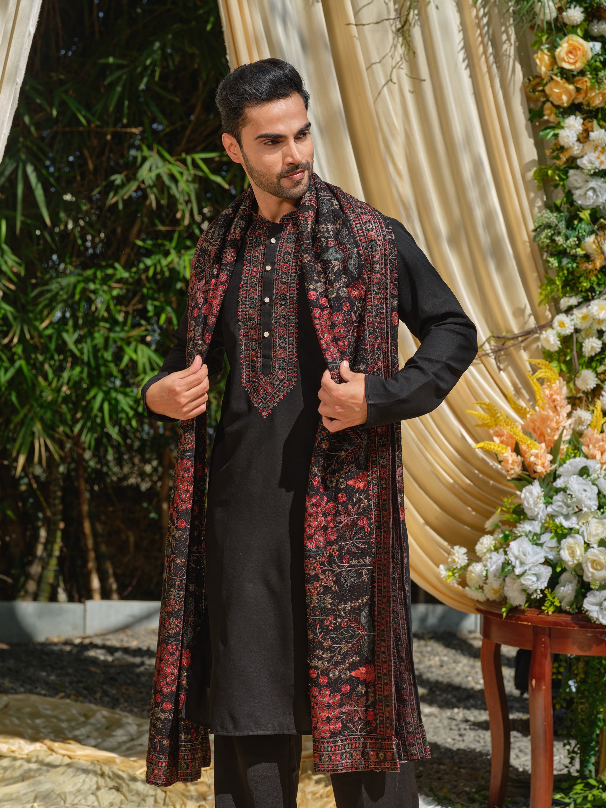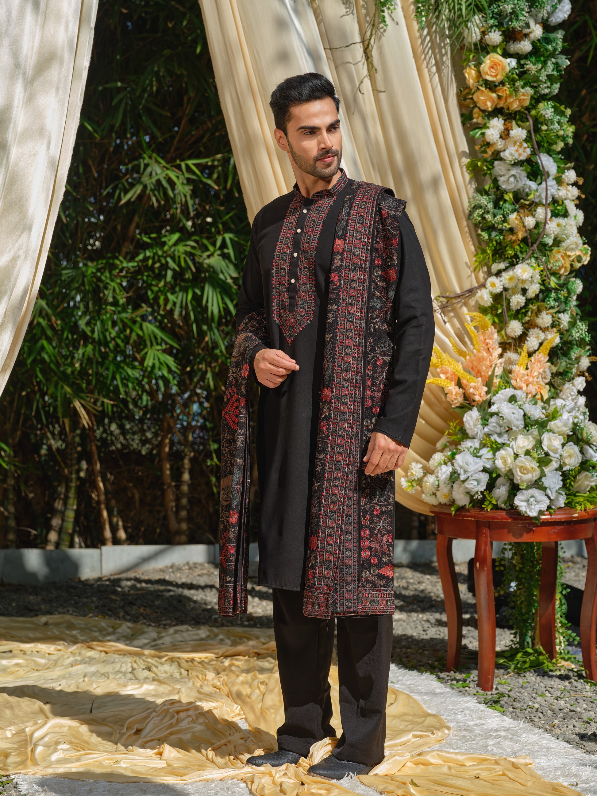 Command dramatic festive allure with this Men’s Black Georgette Kurta–Bottom–Dupatta Set with Multicolour Thread Work Embroidery from Rochaldas Sons. Sheer georgette fabric comes alive with vibrant multicolour thread work embroidery, creating striking contrast against the sophisticated black base. The ensemble radiates bold elegance and artistic flair.