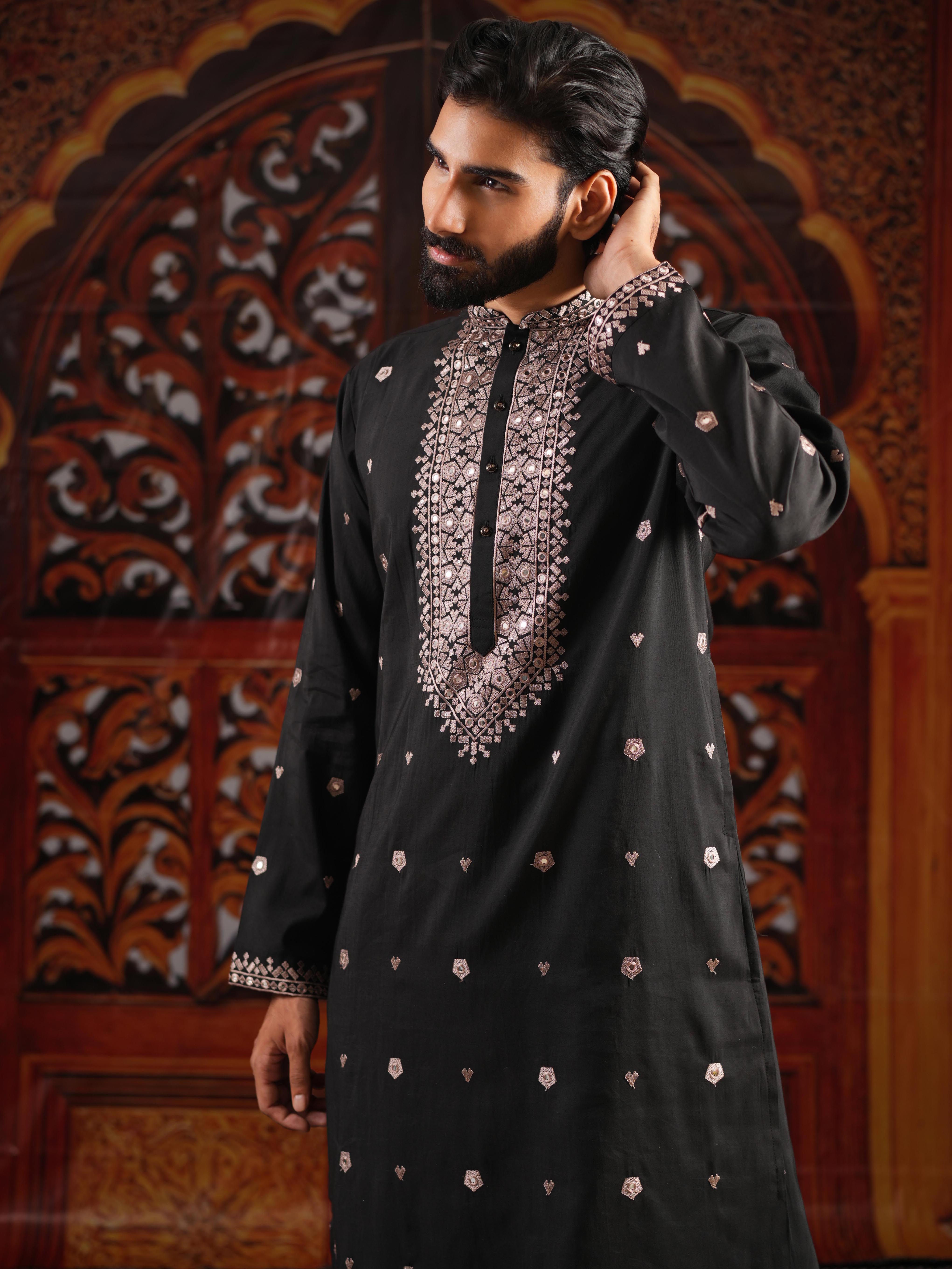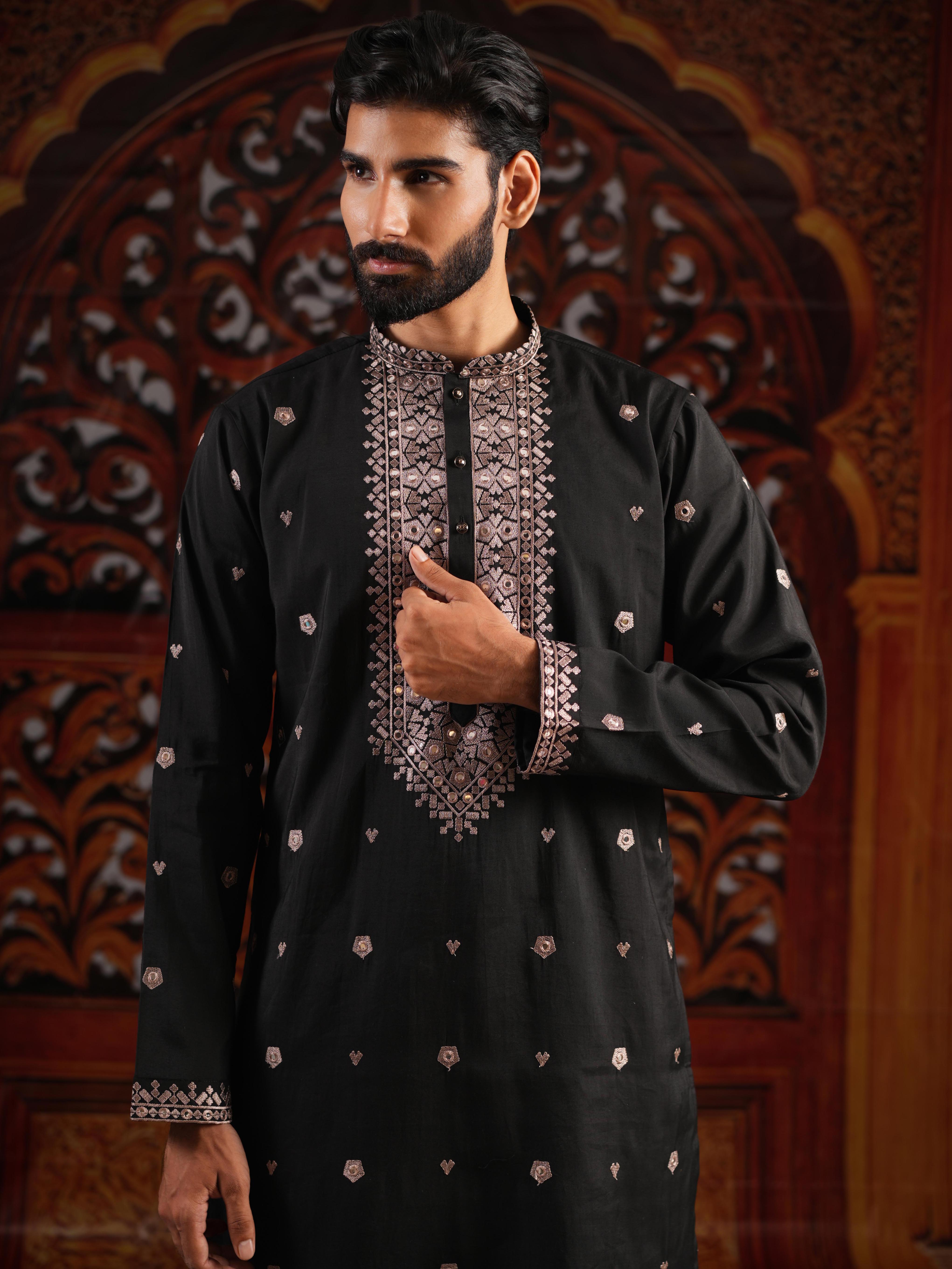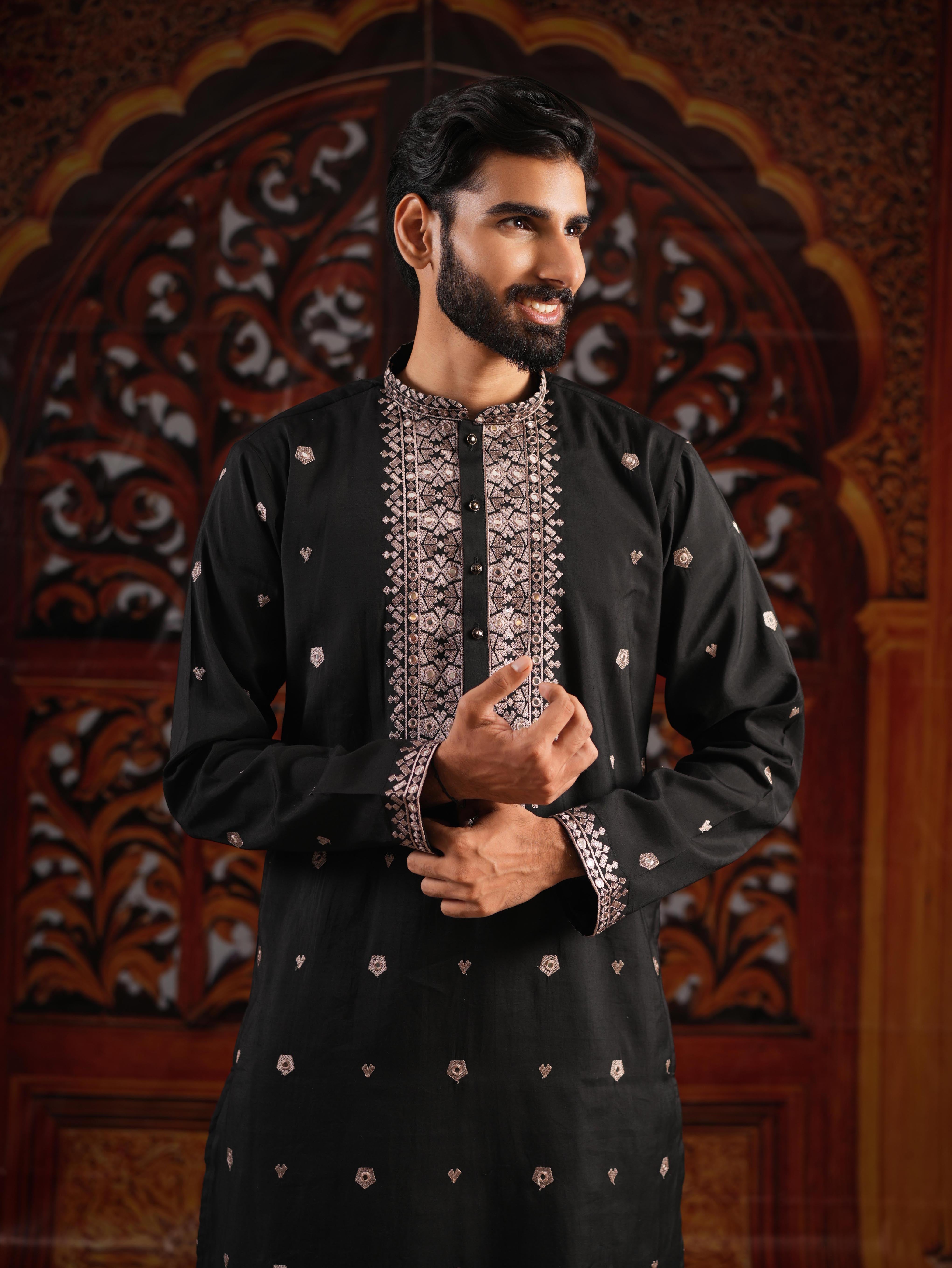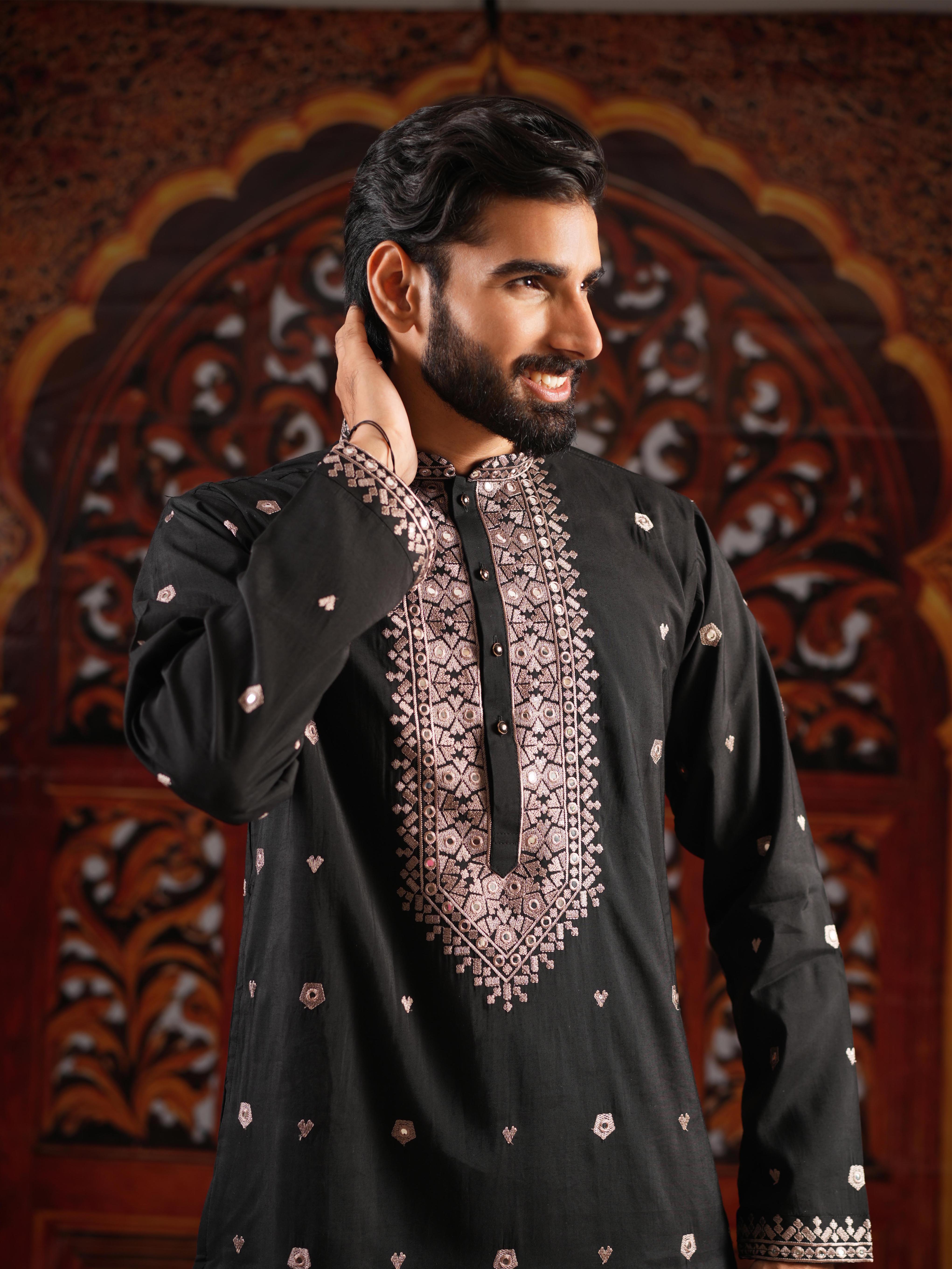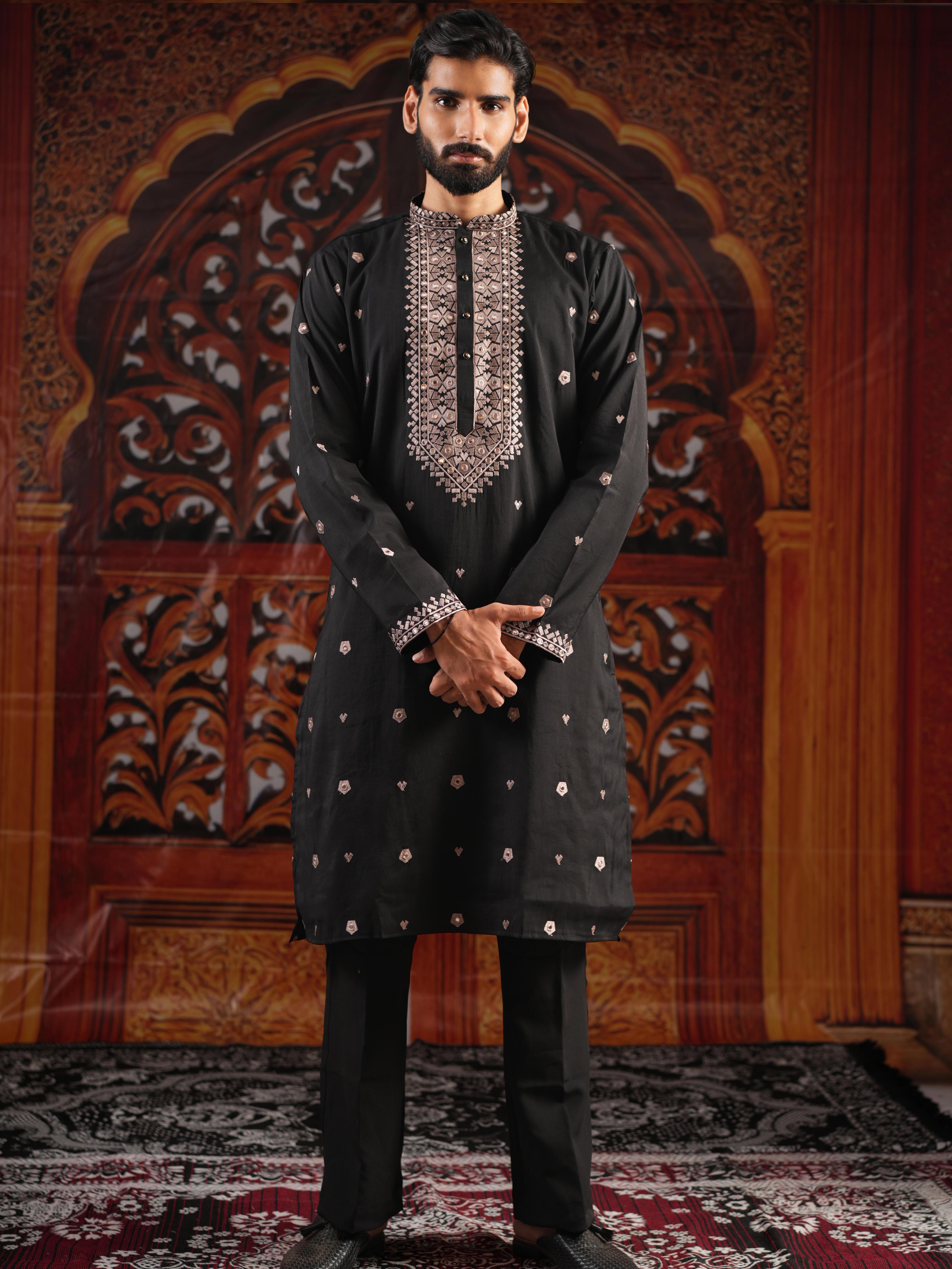 Make a refined style statement with this Men’s Black Silk Kurta Set, crafted from a luxurious silk base for a rich and elegant appeal. The kurta is adorned with intricate sequins and mirror work embroidery along the neck, adding a subtle yet striking festive touch. Featuring a mandarin collar, full sleeves, a knee-length straight cut, and side slits, it ensures both comfort and sophistication. Paired with matching bottoms (pyjama or parallel), this set is an ideal choice for festive celebrations, weddings, and cultural occasions.