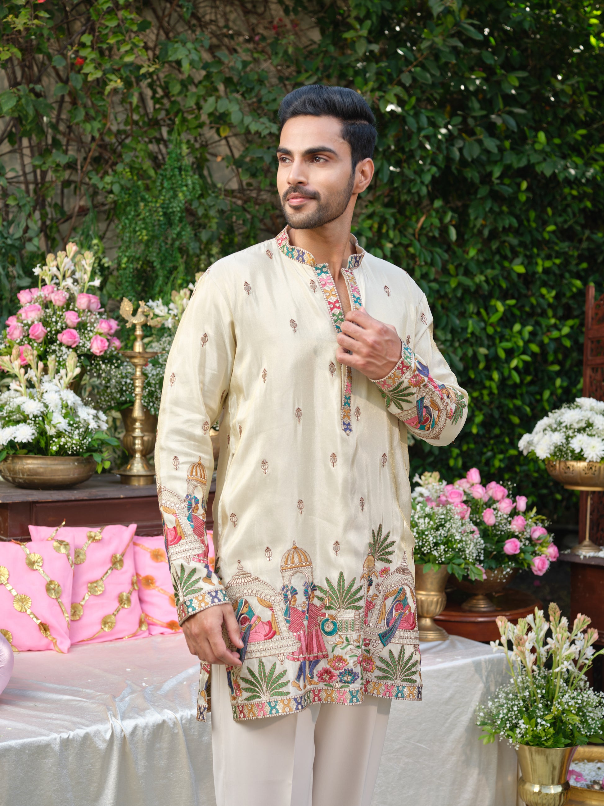 Add a touch of graceful festive elegance to your ethnic wardrobe with this Men’s Cream Shimmer Tissue Kurta–Bottom Set with Multicolour Thread Embroidery from Rochaldas Sons. Crafted from premium shimmer tissue fabric, the kurta features delicate multicolour thread work embroidery that enhances its festive charm with a subtle sheen. The soft cream tone gives it a refined and versatile appeal, perfect for special occasions.