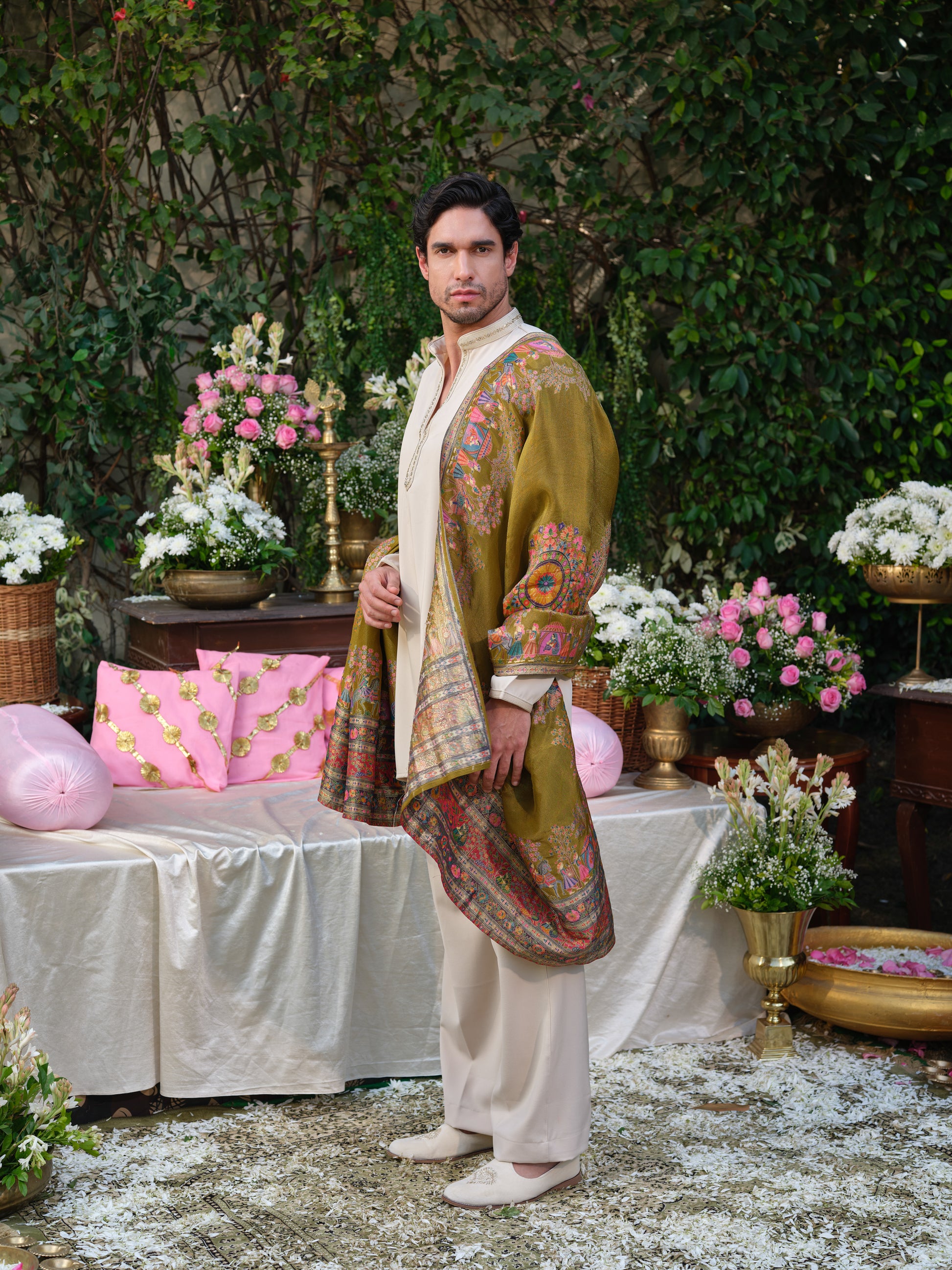 Festive Beige Armani Kurta Ensemble with Handcrafted Detailing