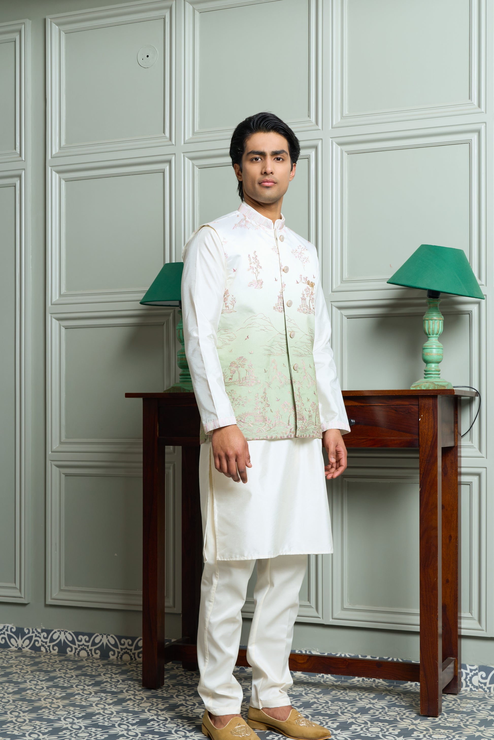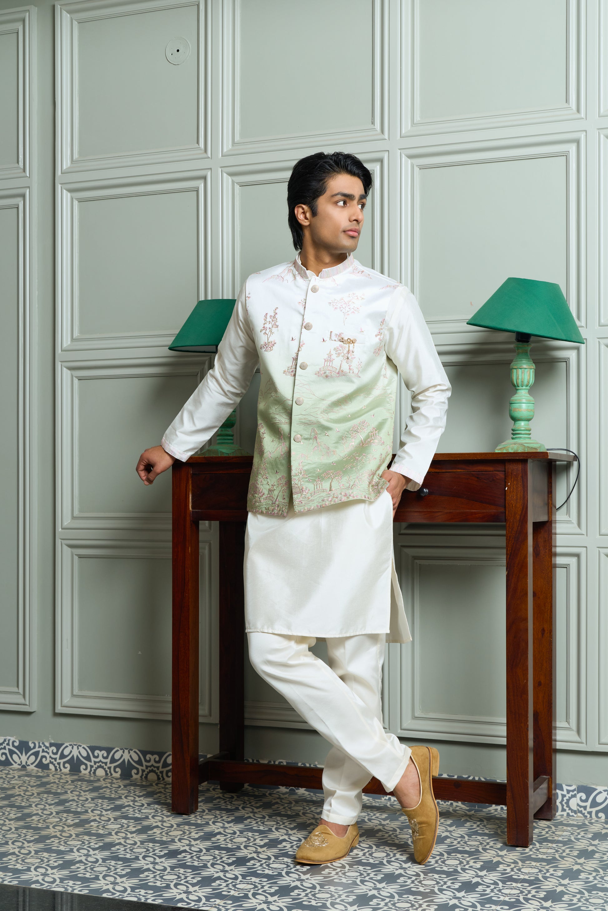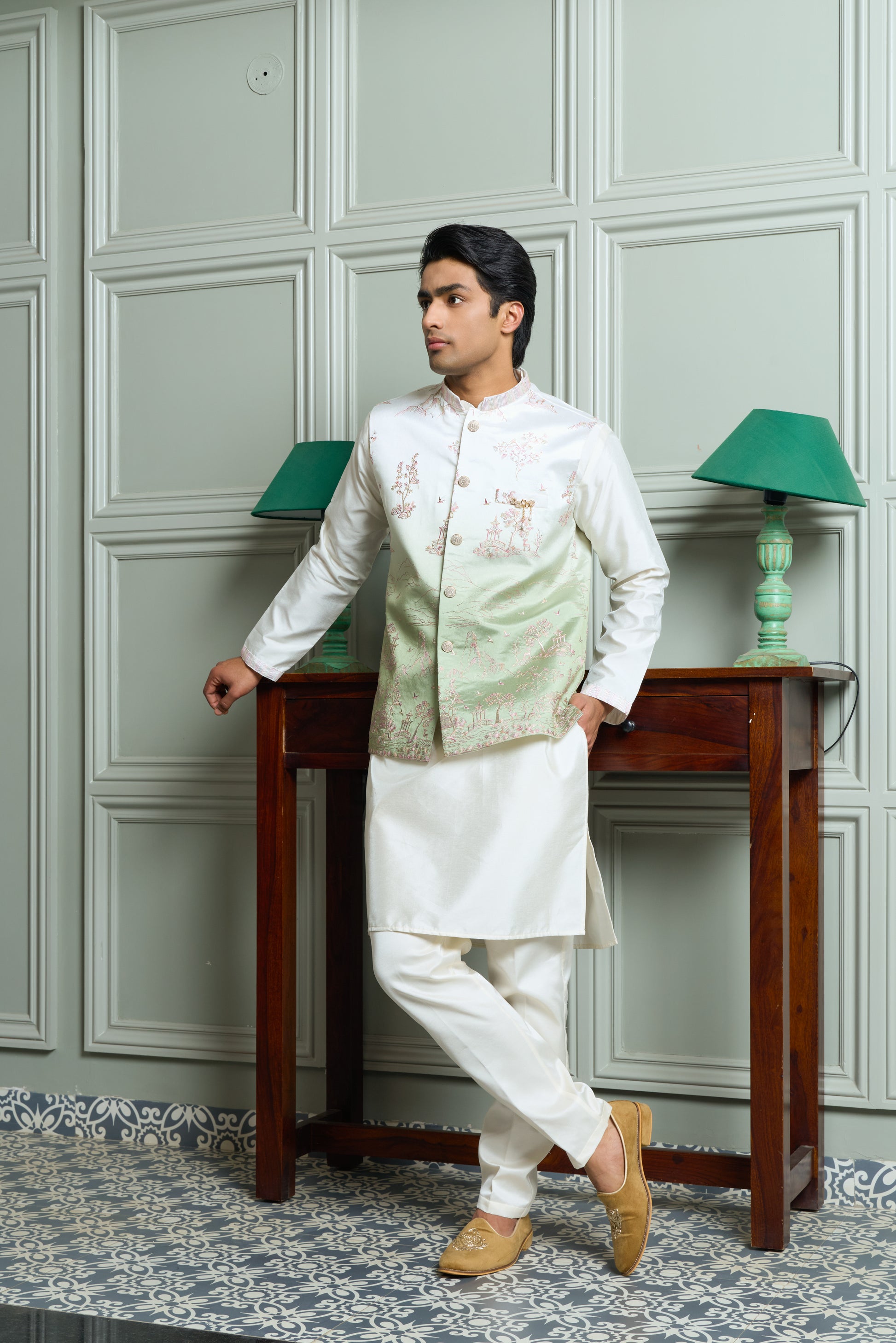 Infuse vibrant festive vitality with this Men’s Green SS Silk Jacket-Kurta-Bottom Set with Ombre Effect, Zari & Thread Work Embroidery from Rochaldas Sons. SS silk features a stunning ombre fade, accentuated by intricate zari and thread work embroidery, sleeveless jacket, full-sleeve kurta, and straight bottom for dynamic layering. The lush green palette symbolizes prosperity and freshness.