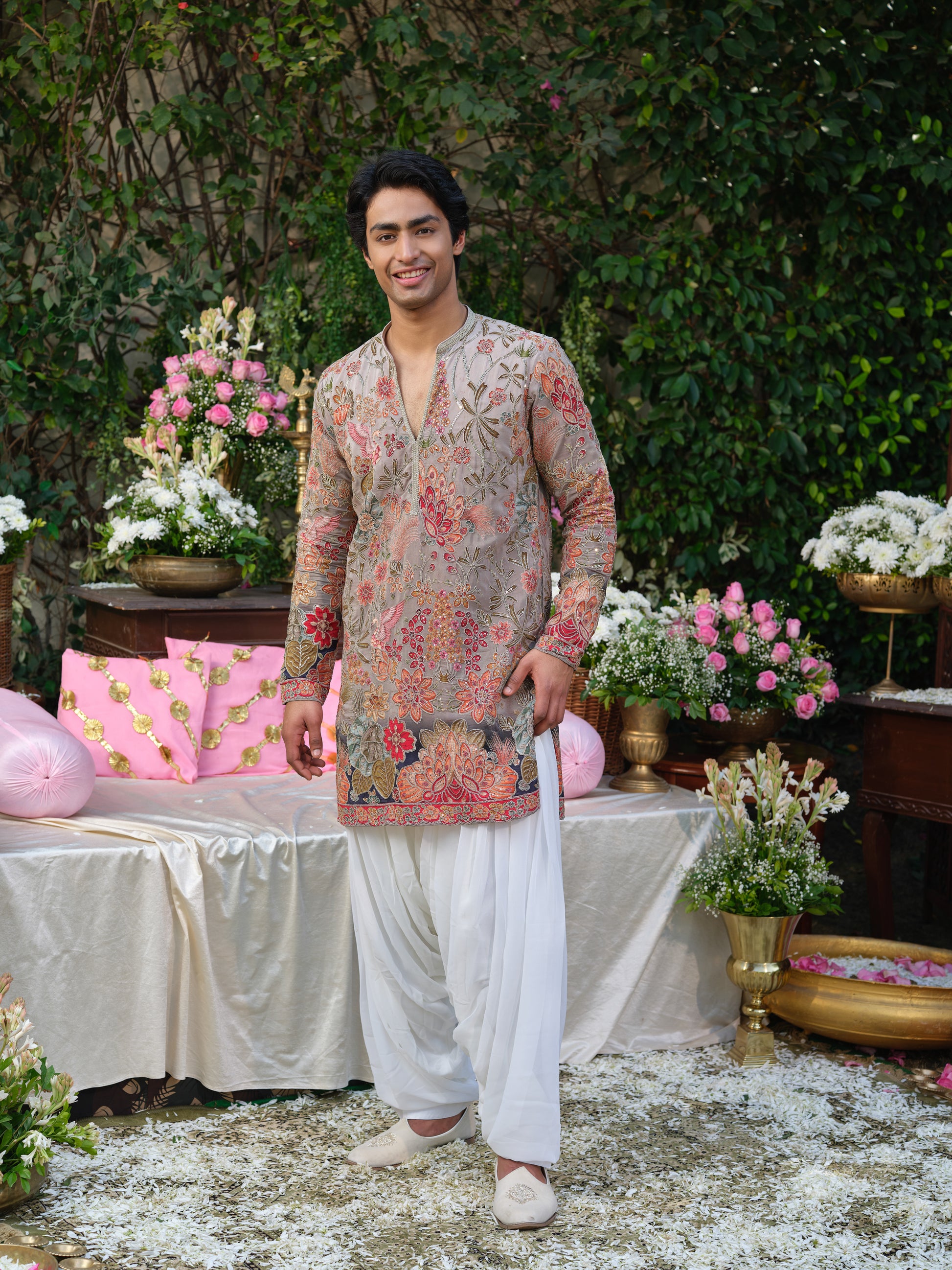 Elevate your festive style with this Men’s Grey Crepe Kurta–Bottom Set with Zari Cord Embroidery from Rochaldas Sons. Crafted from premium natural crepe fabric, the kurta features elegant position print enhanced with refined cording zari embroidery, adding depth and festive richness to the design. The soft drape of the fabric ensures comfort while maintaining a polished ethnic look.