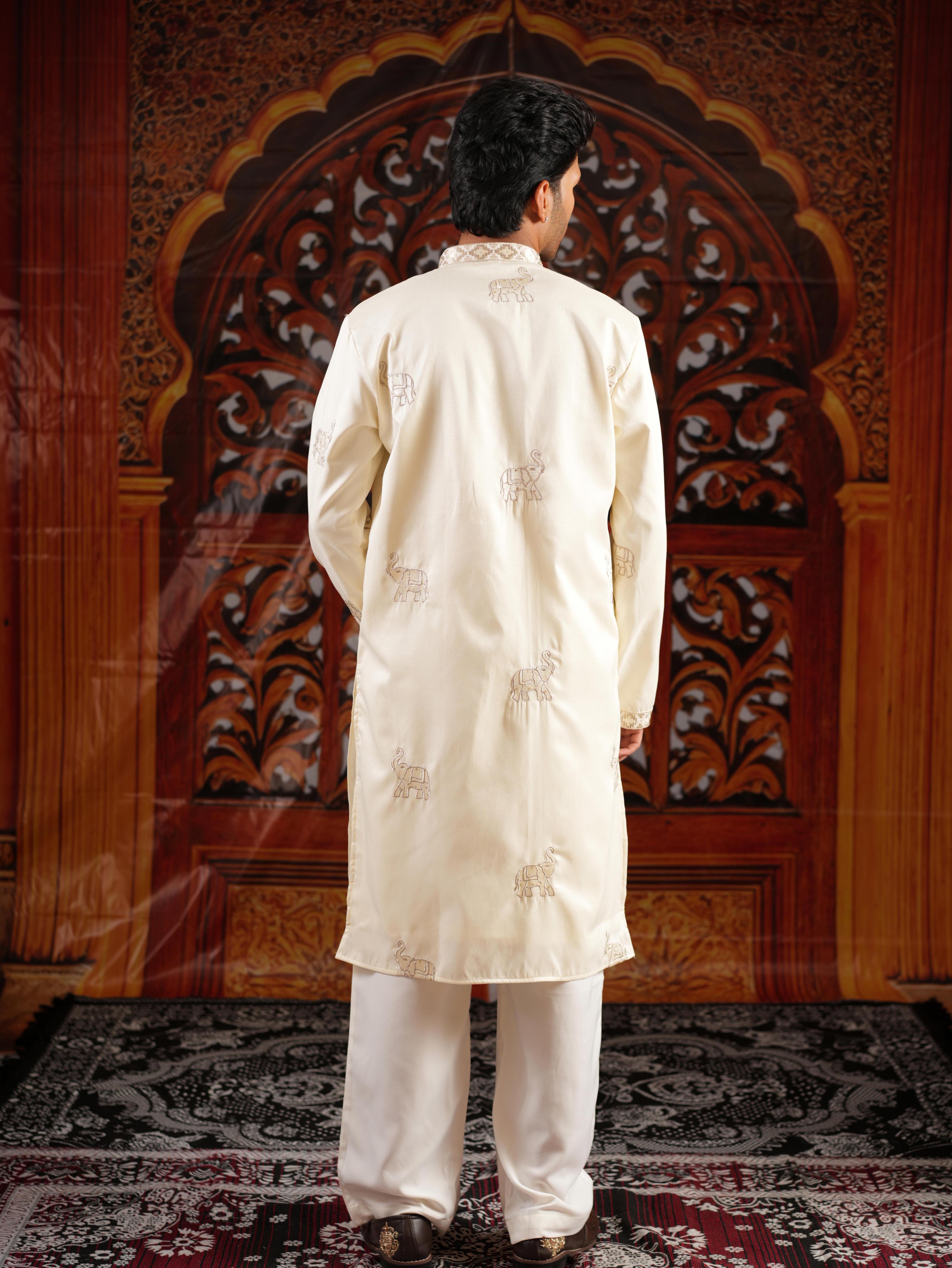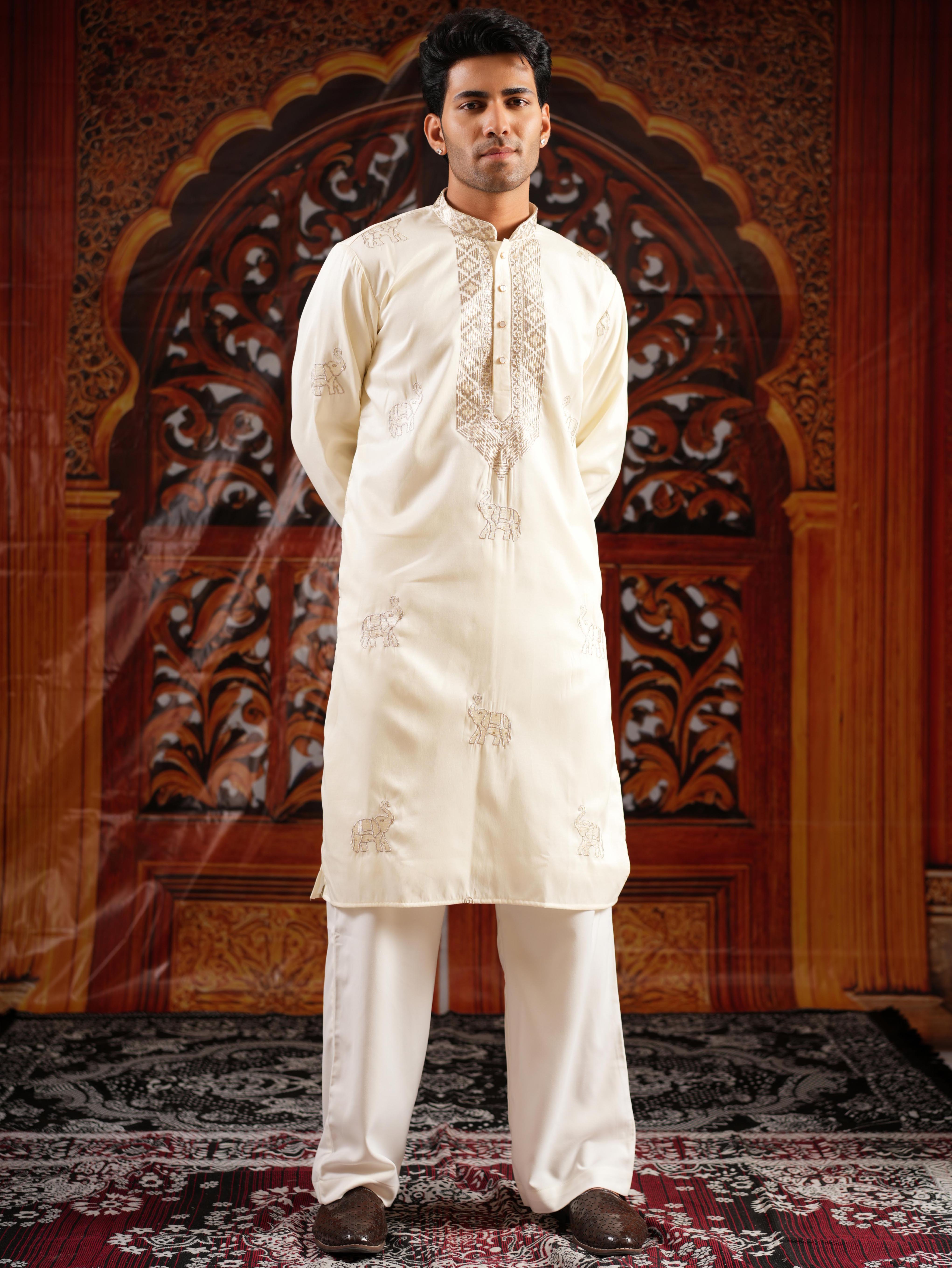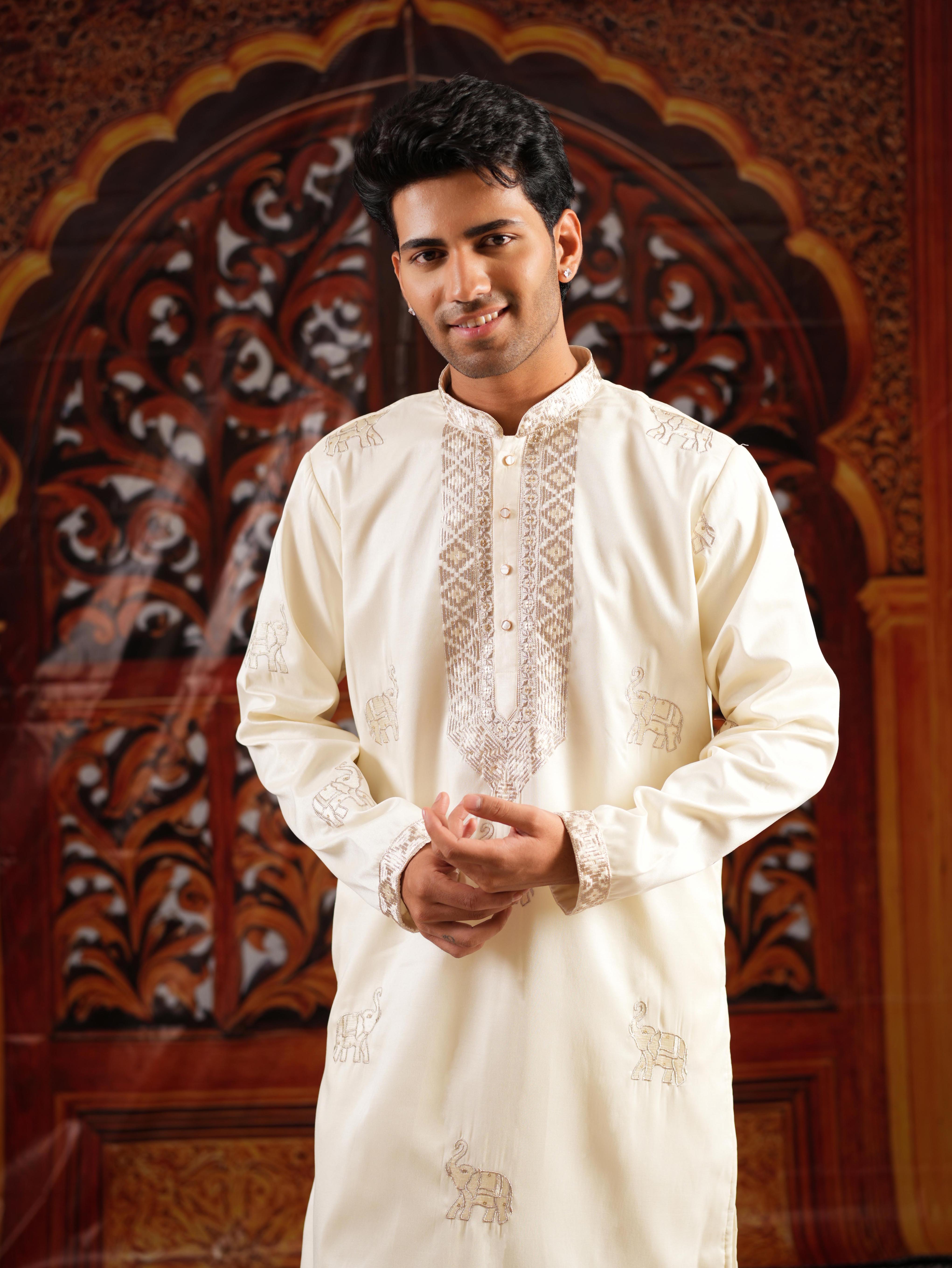 Elevate your festive wardrobe with this Men’s Ivory Silk Kurta Set, adorned with intricate golden zari thread work embroidery that adds a regal charm. Tailored from premium silk fabric, the kurta features a mandarin collar, full sleeves, knee-length cut, and side slits for a timeless straight fit. Paired with matching bottoms (pyjama or parallel), this ensemble is a refined choice for weddings, festive occasions, and cultural celebrations.