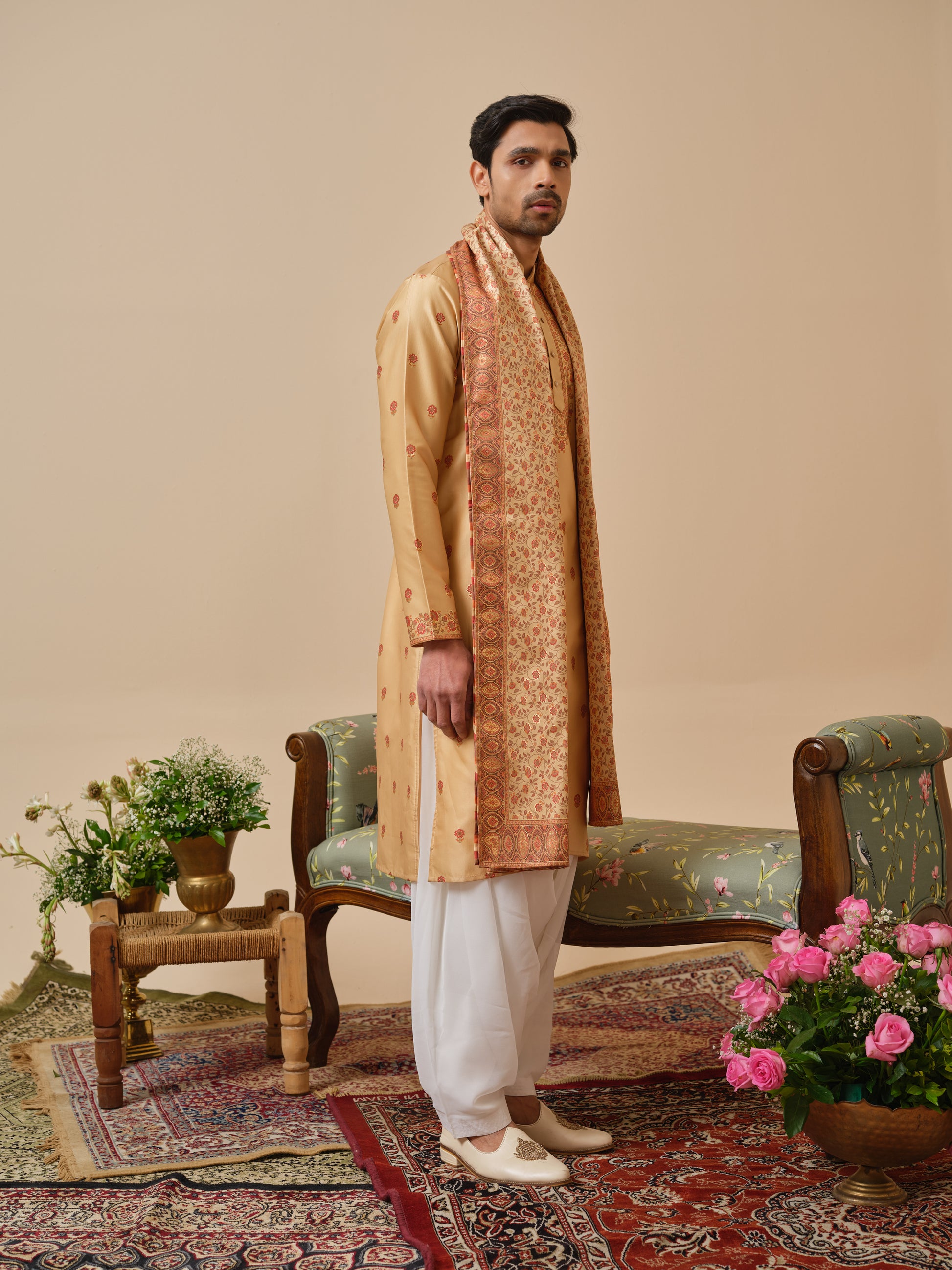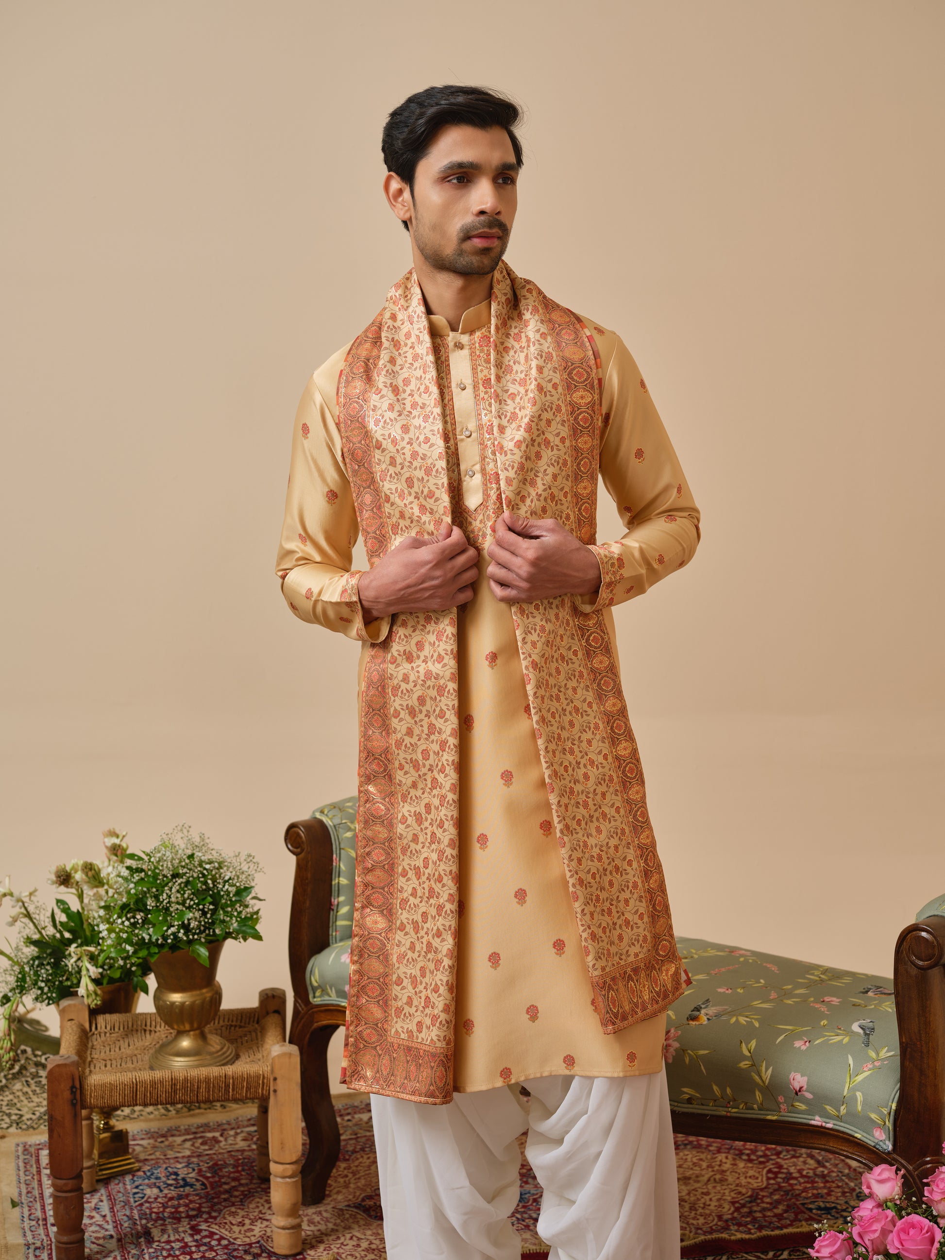Radiate contemporary festive shimmer with this Men’s Linen Satin Kurta–Bottom–Dupatta Set with Foil Work & Digital Print from Rochaldas Sons. Luxurious linen satin fabric gleams with metallic foil detailing over sophisticated digital prints, creating a modern artisanal fusion. The ensemble delivers striking visual depth and texture.
