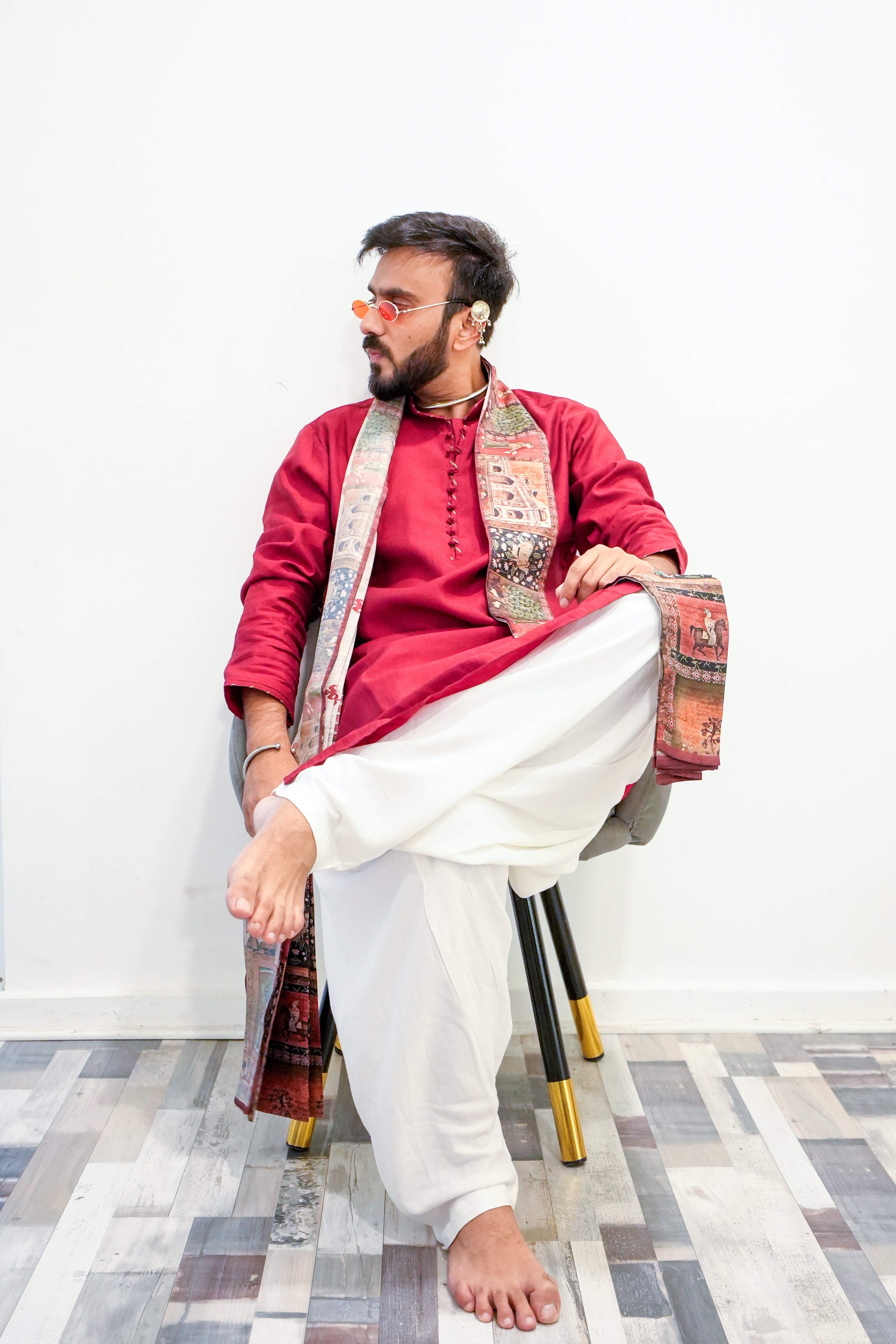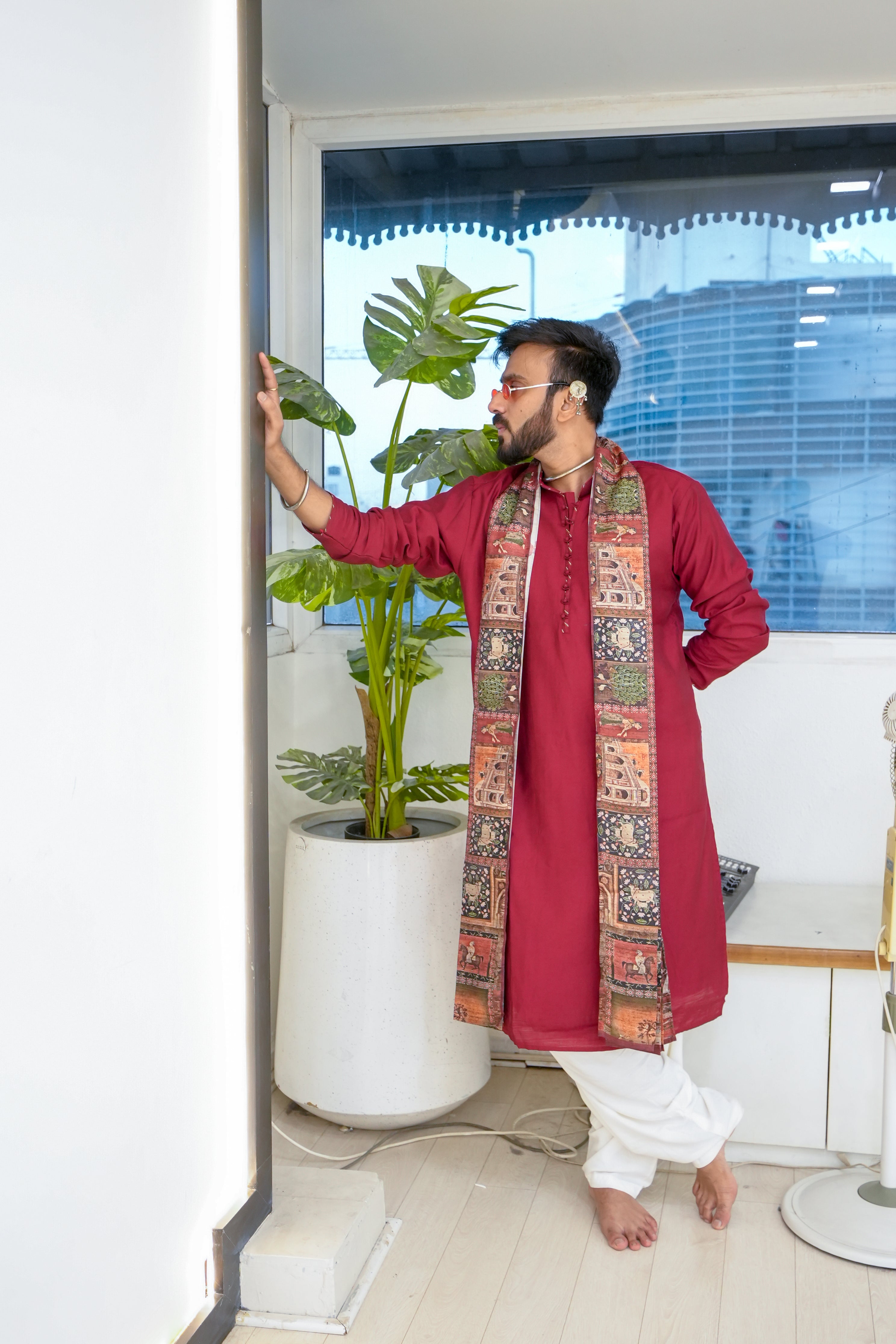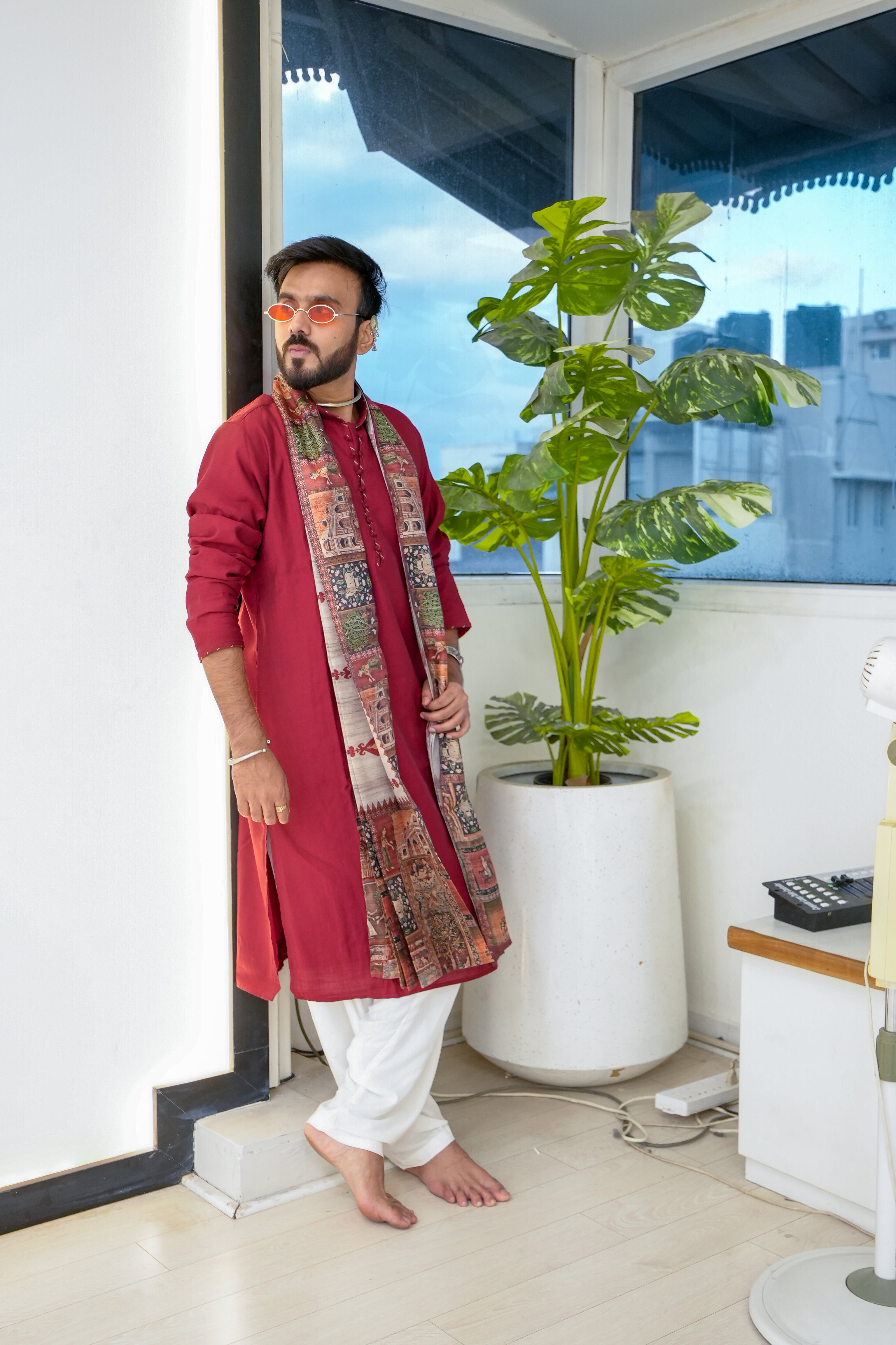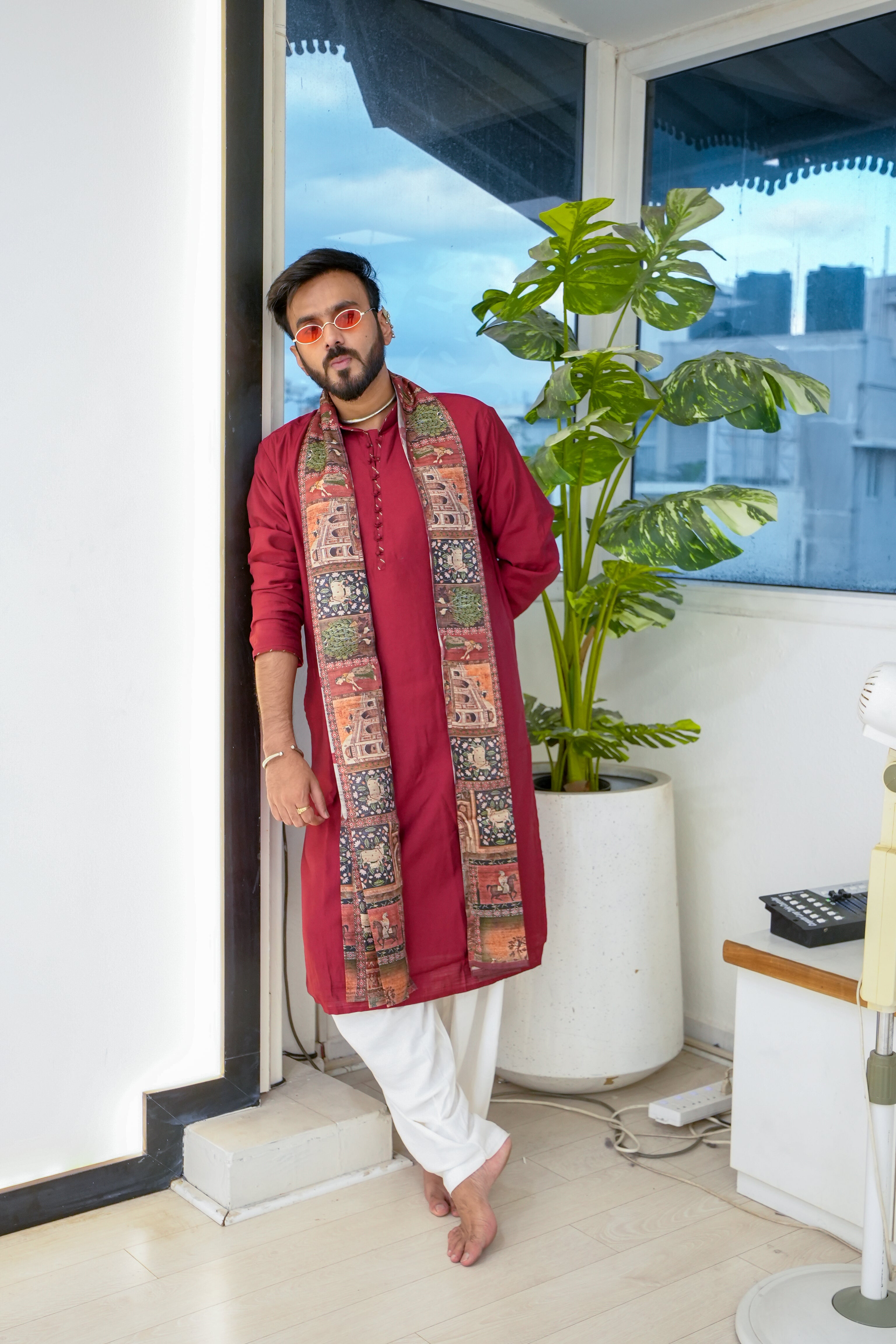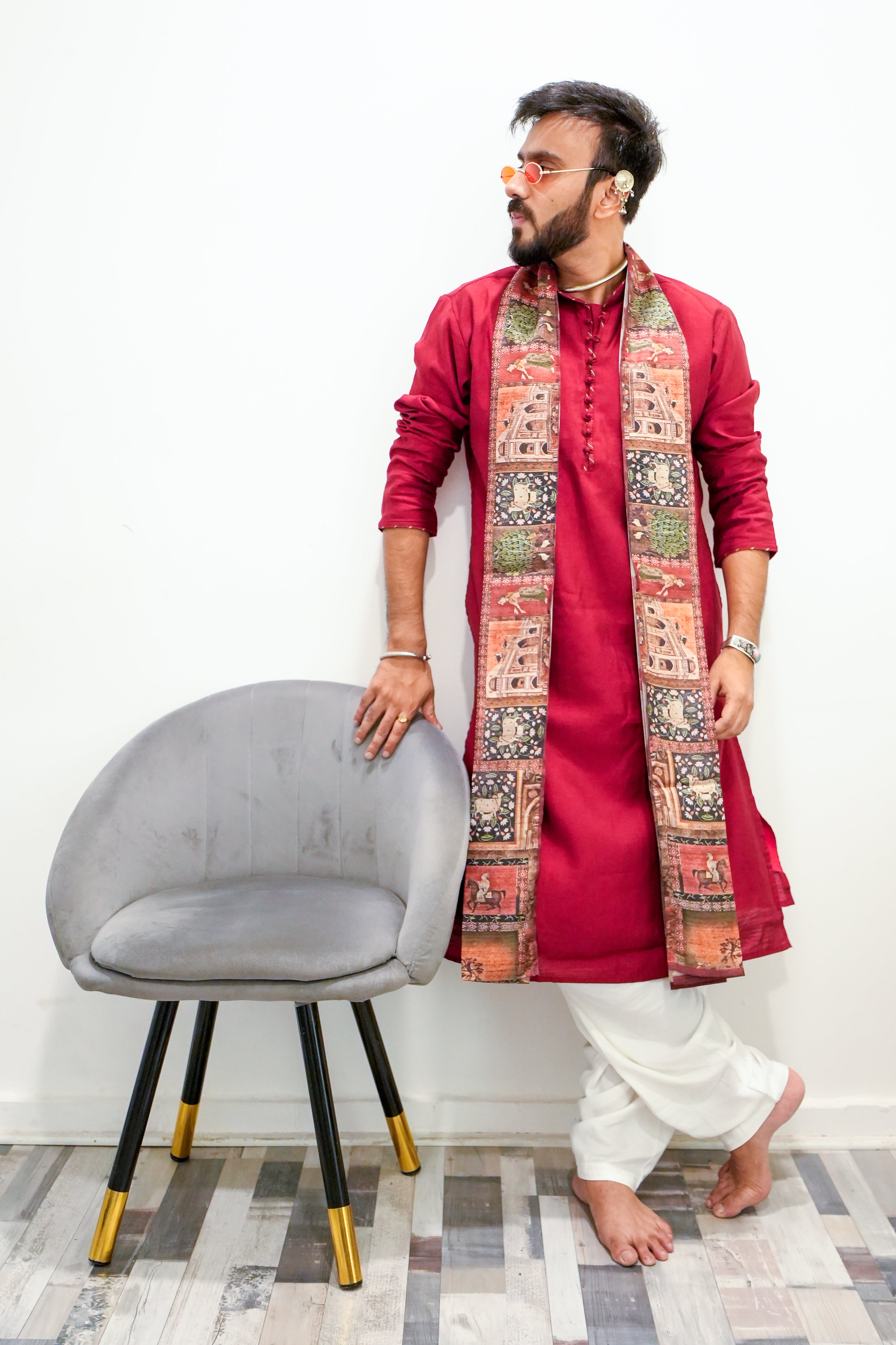 Make a sophisticated statement with this Men’s Maroon Sigma Silk Kurta Set from Rochaldas Sons. Crafted in fine sigma silk, the kurta features a plain, elegant design with a mandarin collar, full sleeves, and straight silhouette. The knee-length kurta with side slits ensures a refined fit and ease of movement. Paired with a matching bottom (straight or Patiala) and a digitally printed dupatta, this set blends minimal elegance with a touch of modern artistry, making it an ideal choice for festive and celebratory occasions.