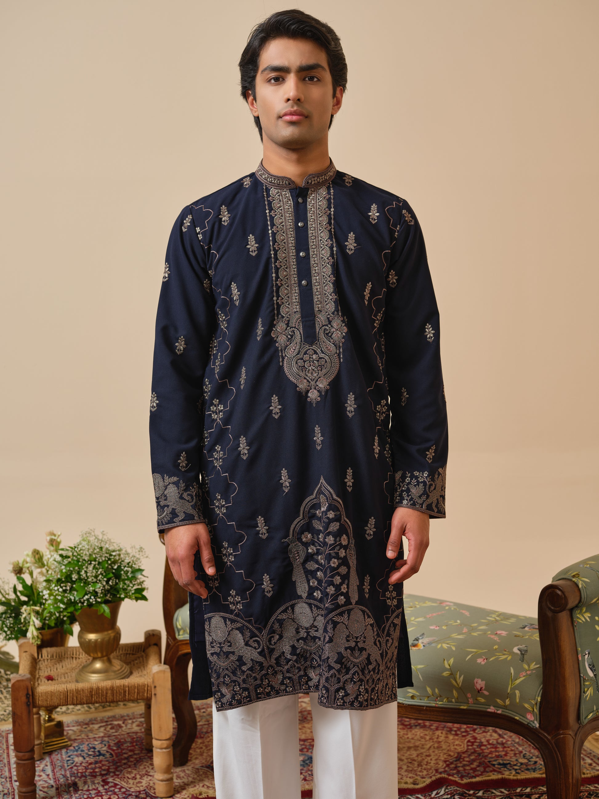 Mandarin collar, knee length, full sleeves, and side slits define the straight-fit kurta, paired with straight bottom for balanced comfort and poise. Perfect for evening weddings, gala receptions, and distinguished ethnic occasions.