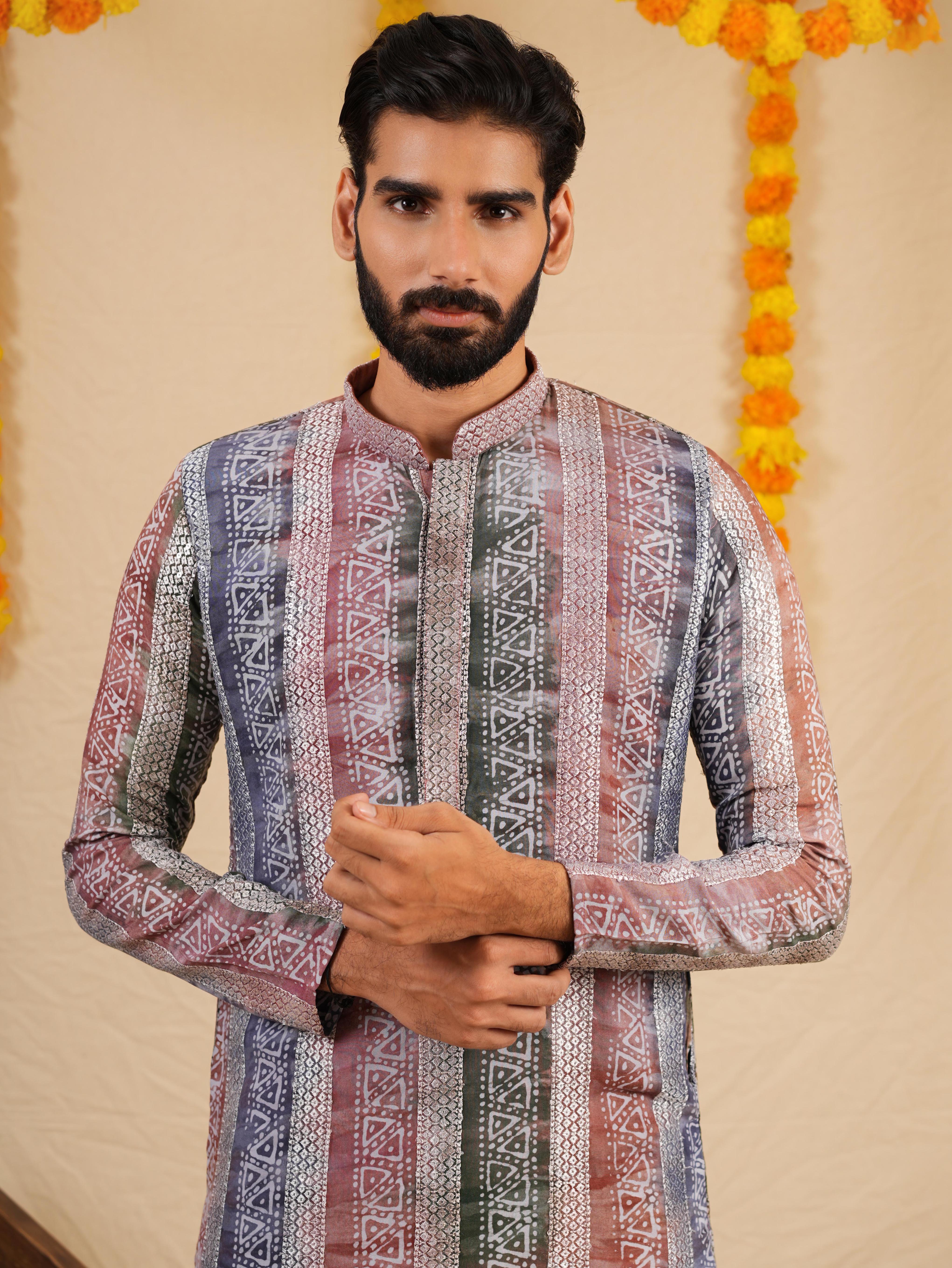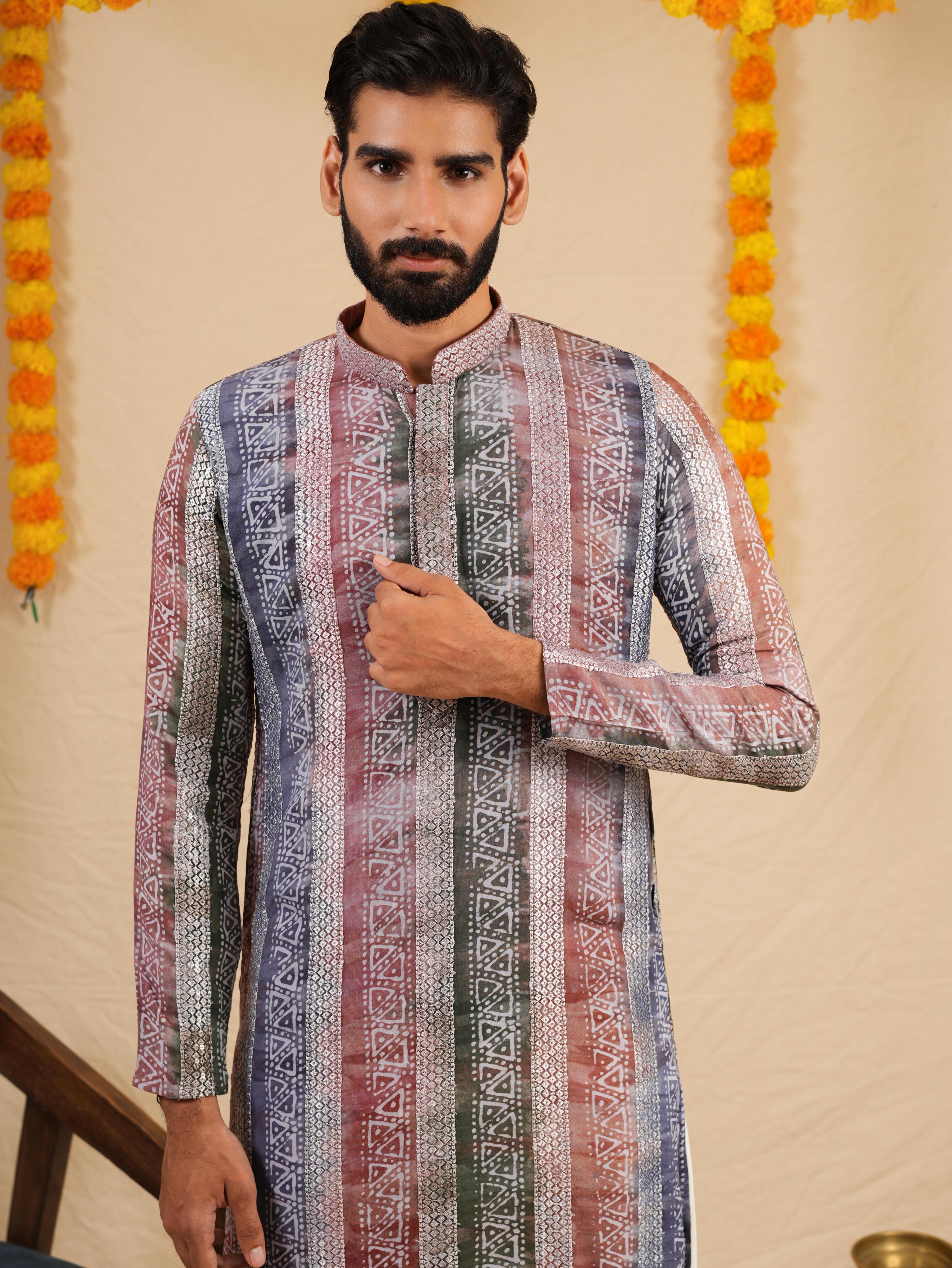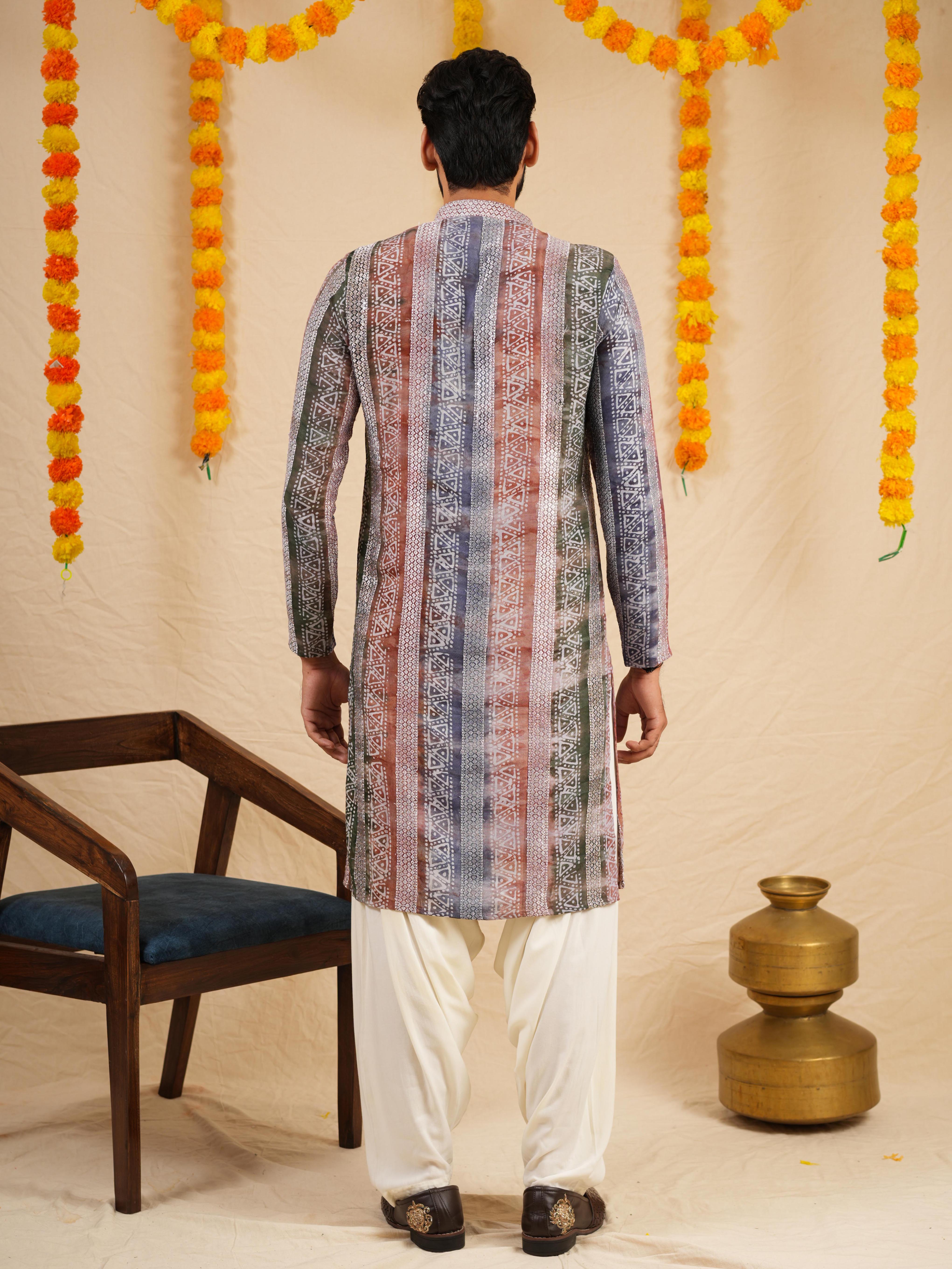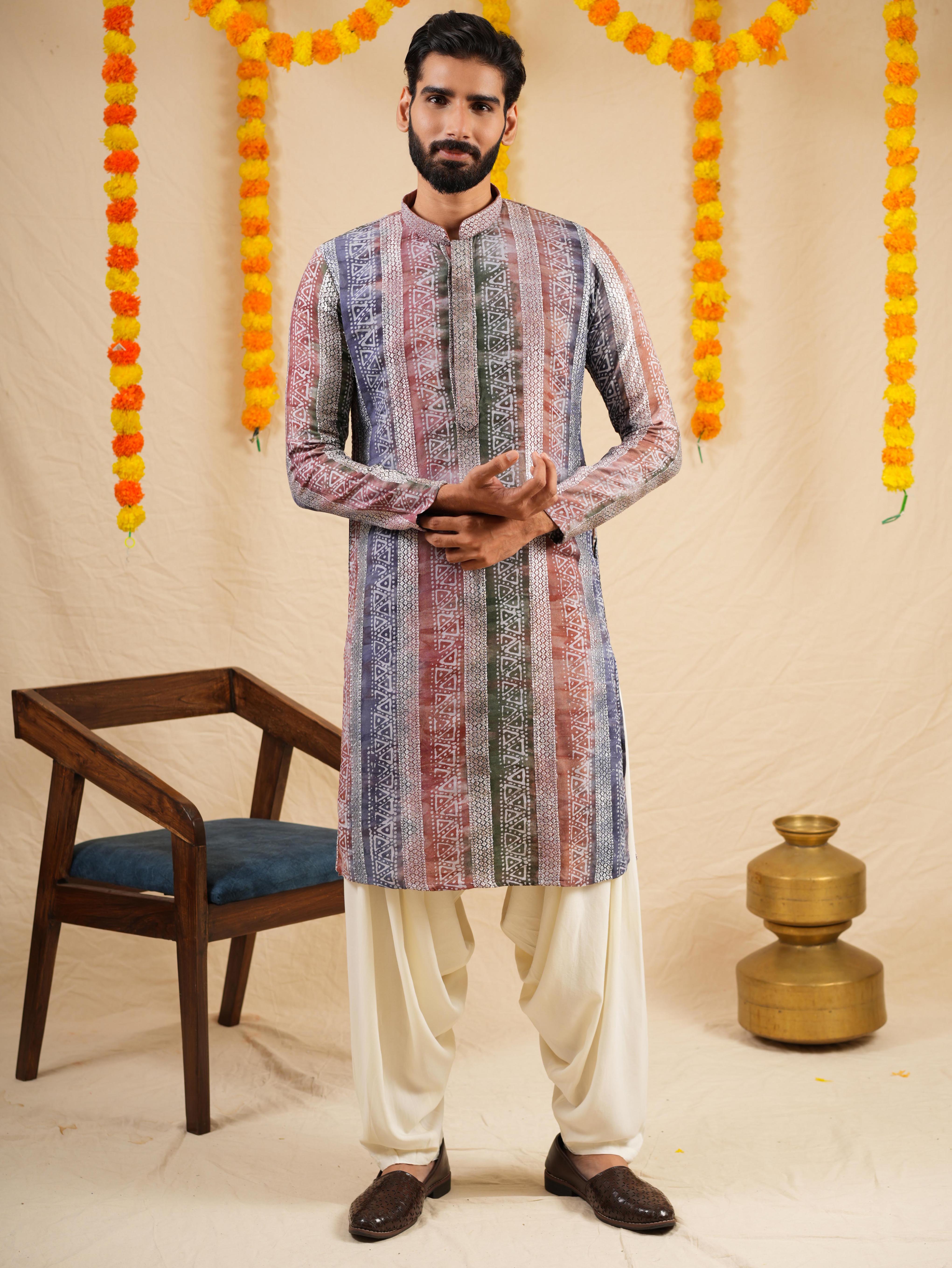 Add a splash of color to your festive wardrobe with this Men’s Multicolour Rayon Kurta Set. Crafted from soft rayon fabric with a striking tie and dye effect, the kurta is enhanced with delicate thread work embroidery and shimmering sequins that give it a rich, festive appeal. Designed with a mandarin collar, full sleeves, a straight knee-length cut, and side slits for ease of movement, it combines comfort with elegance. Paired with matching bottoms (pyjama or Patiala), this set blends traditional artistry with contemporary style, making it a perfect choice for cultural functions, festive gatherings, or special occasions.