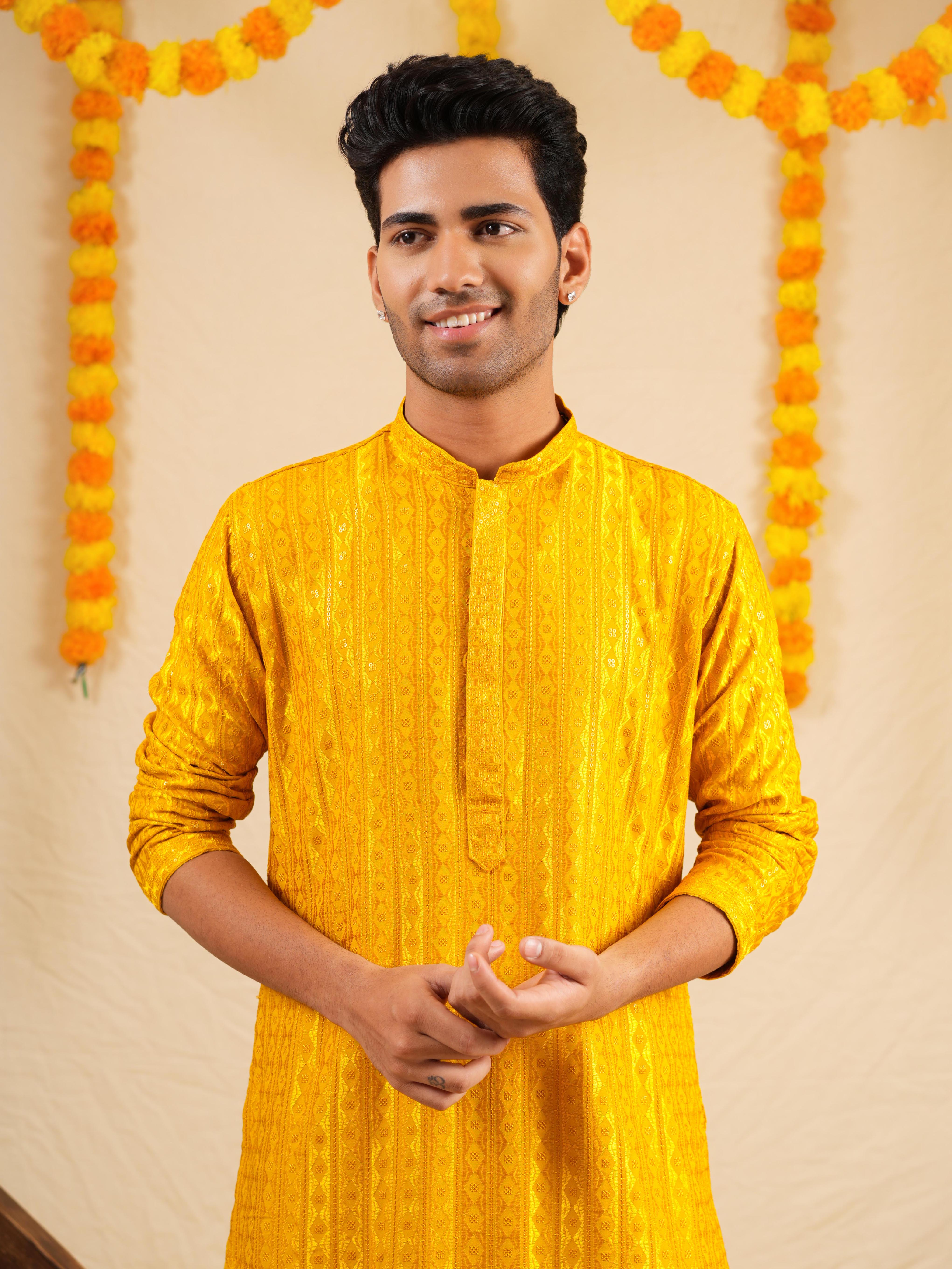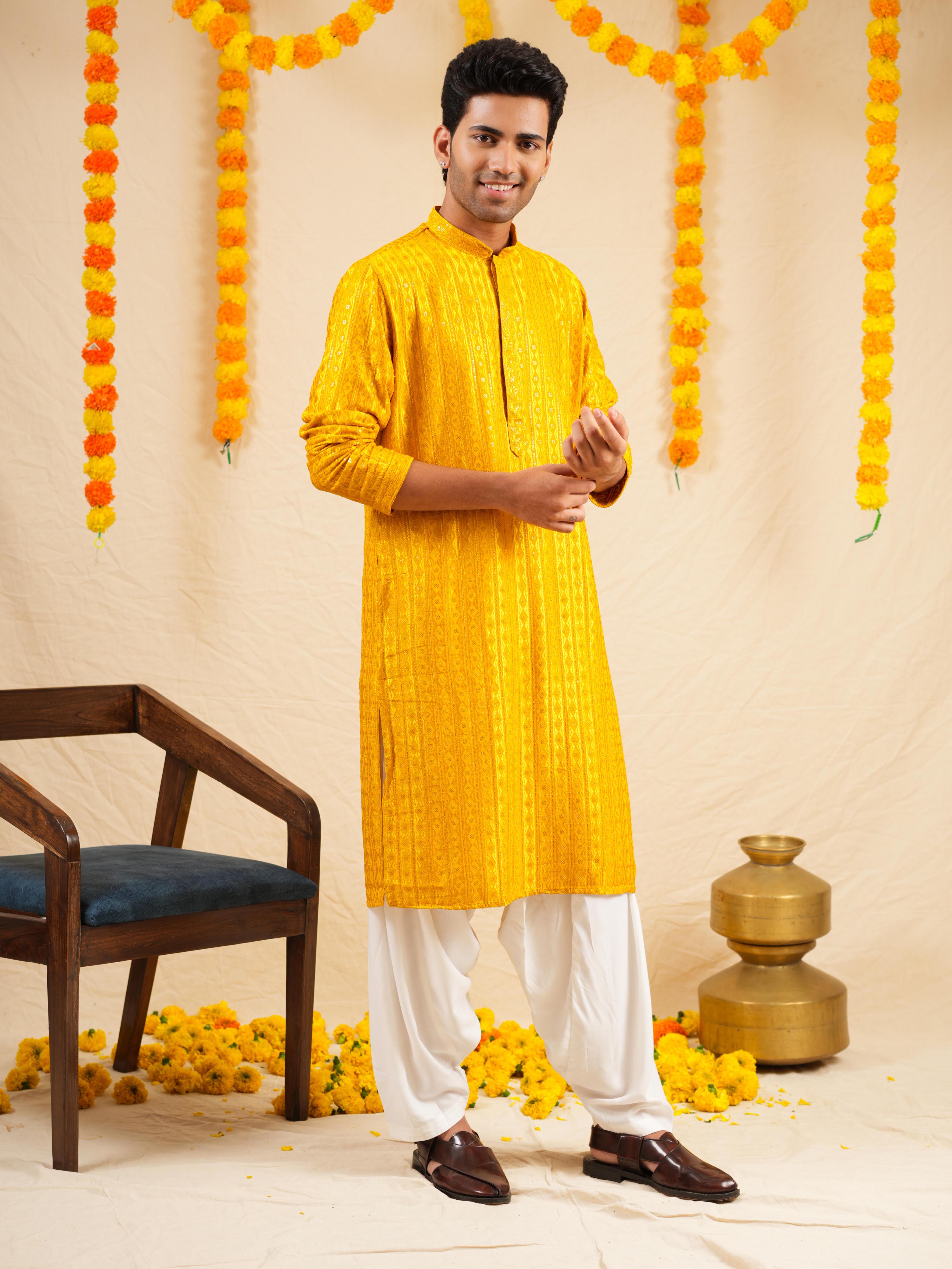 Bring charm and sophistication to your festive look with this Men’s Mustard Rayon Kurta Set. Tailored from soft rayon fabric, it is beautifully embellished with intricate thread work embroidery and shimmering sequins that add a refined festive appeal. Designed with a mandarin collar, full sleeves, a knee-length straight cut, and side slits, this kurta offers both comfort and style. Paired with matching bottoms (pyjama or Patiala), it makes the perfect choice for festive gatherings, cultural celebrations, or special occasions.