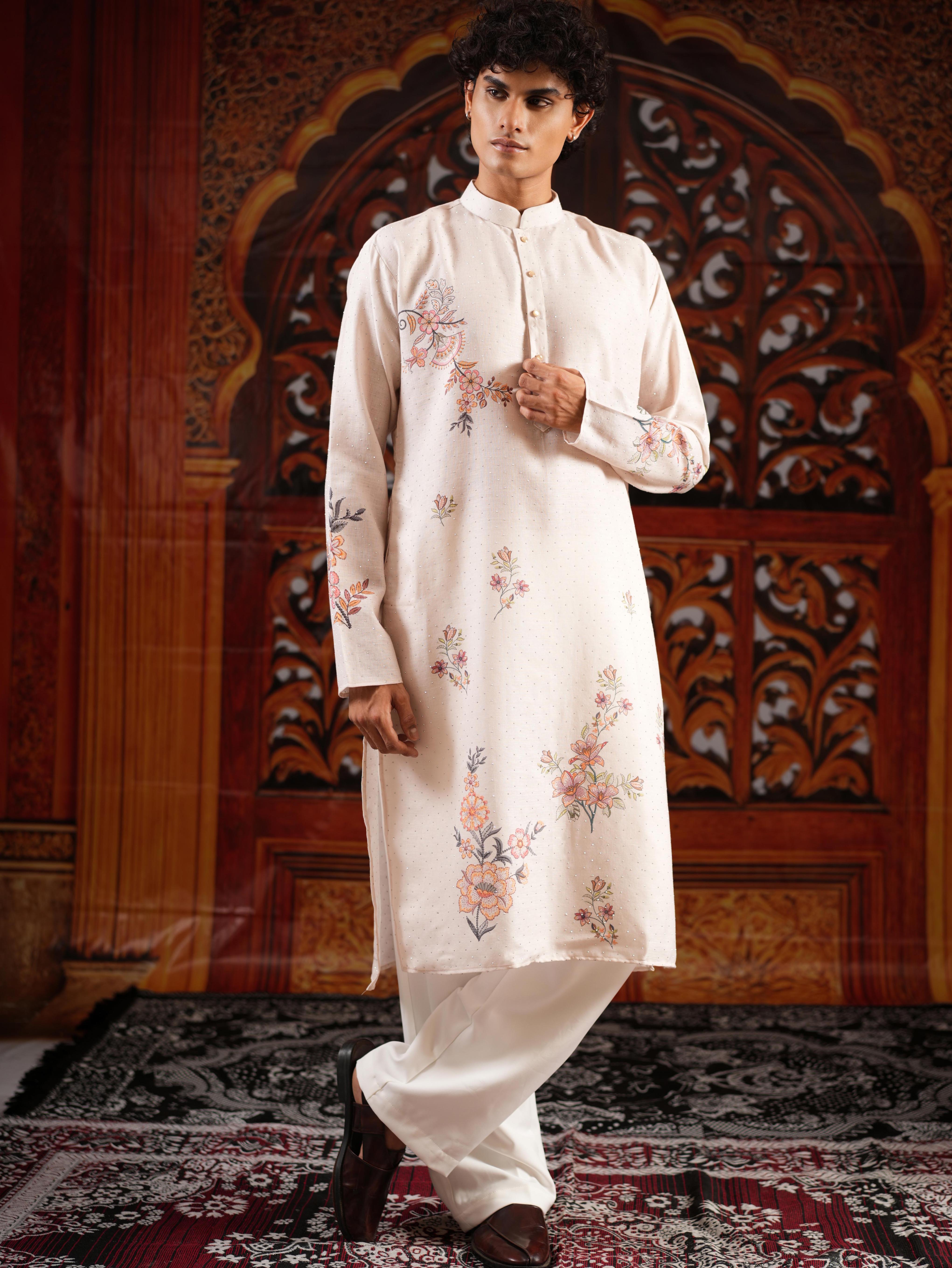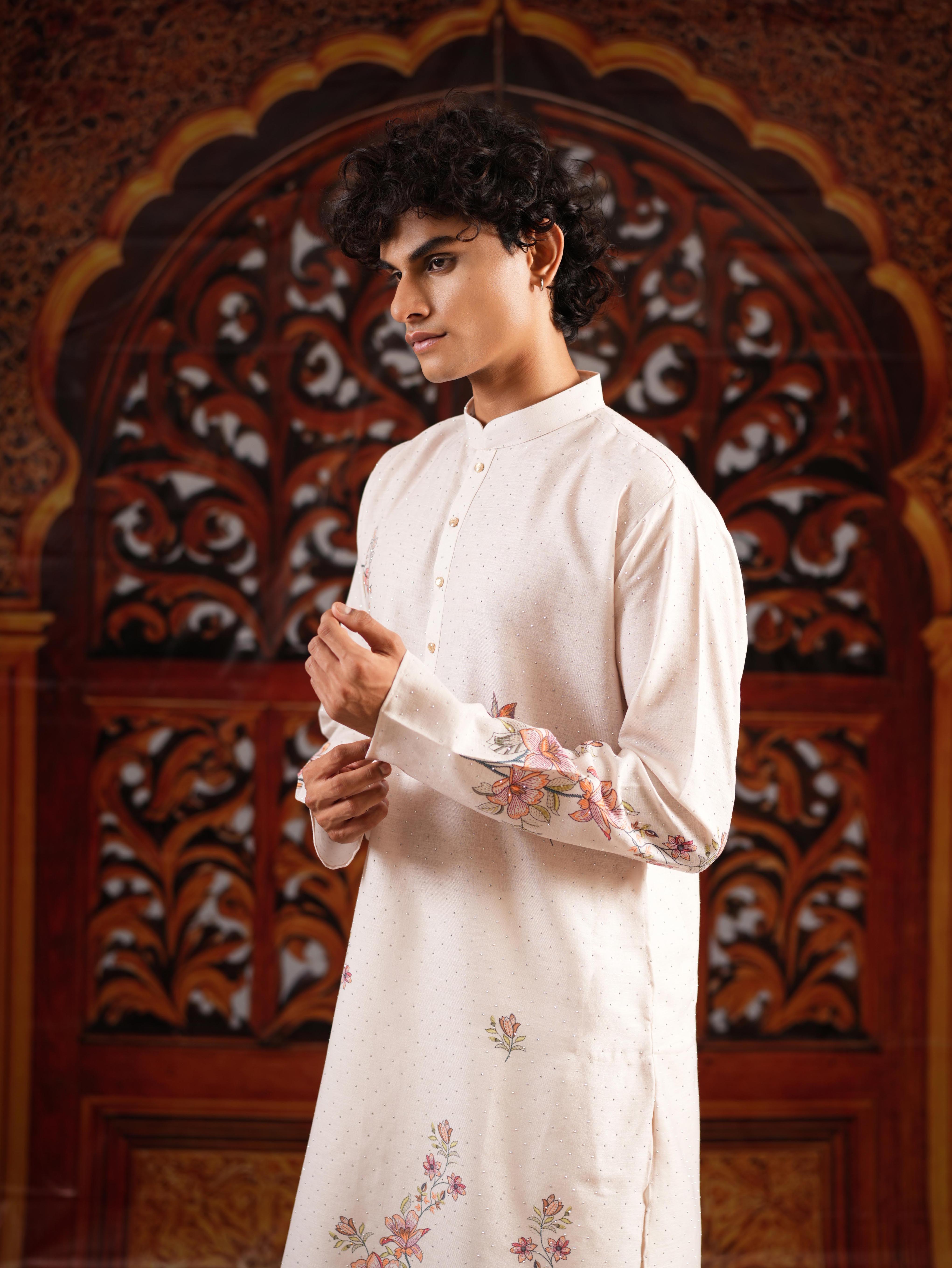 Add a touch of luxury to your festive wardrobe with this Men’s Off-White Linen Blend Kurta Set. Crafted from premium linen blend fabric, the kurta features an elegant digital print highlighted with all-over Swarovski stone work, bringing refined sparkle and sophistication to your look. Styled with a mandarin collar, full sleeves, a straight knee-length cut, and side slits, it ensures both comfort and timeless elegance. Paired with matching bottoms (pyjama or parallel) and a coordinated dupatta, this ensemble is a perfect choice for weddings, receptions, and festive occasions.