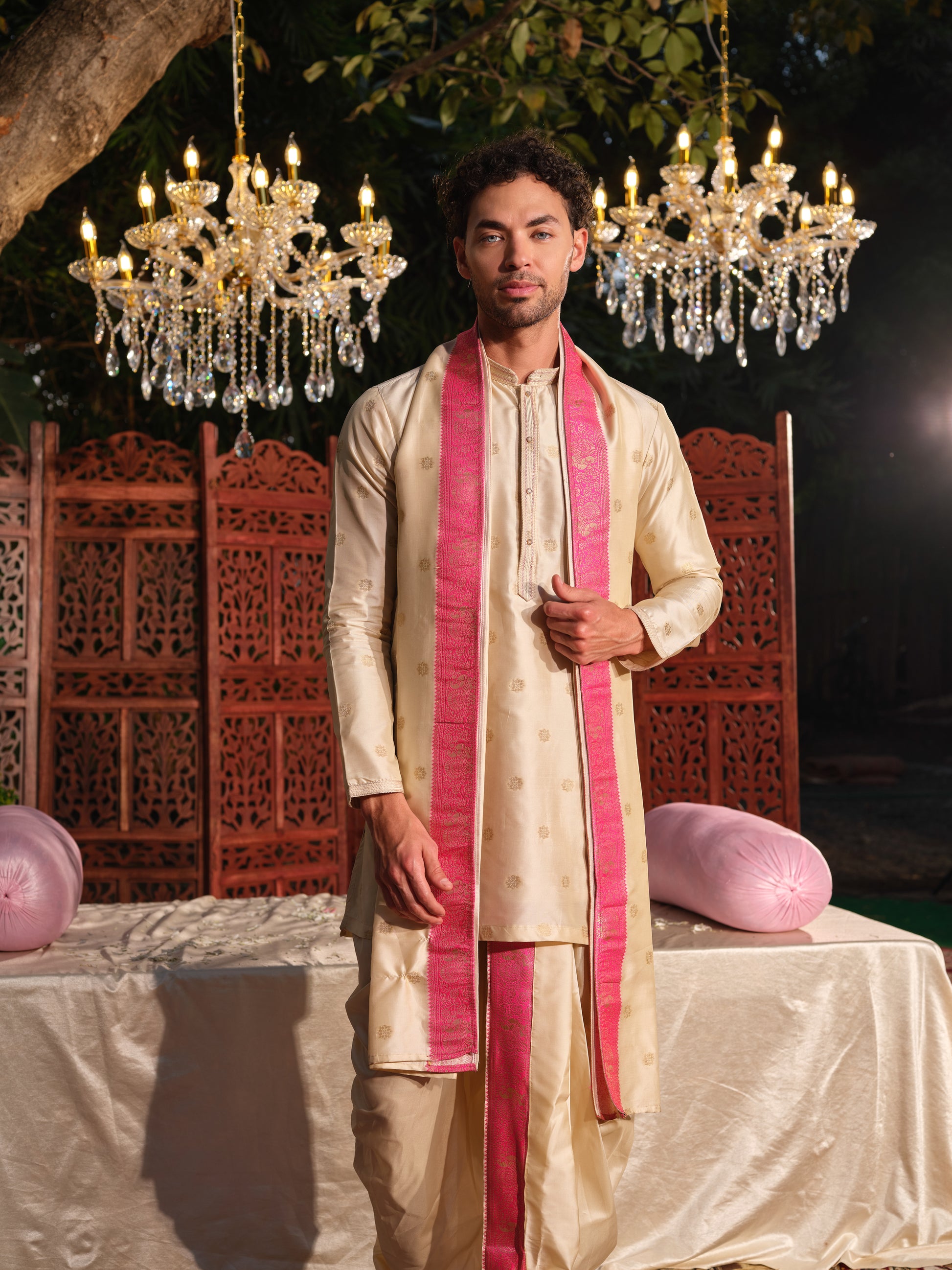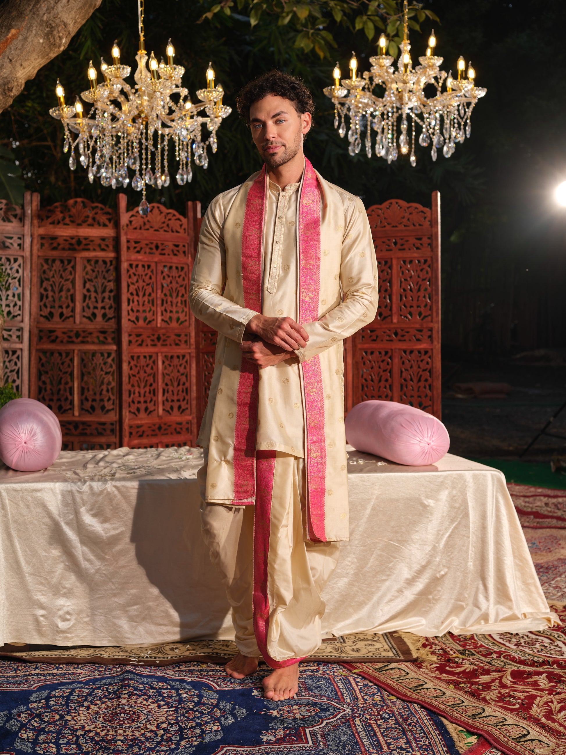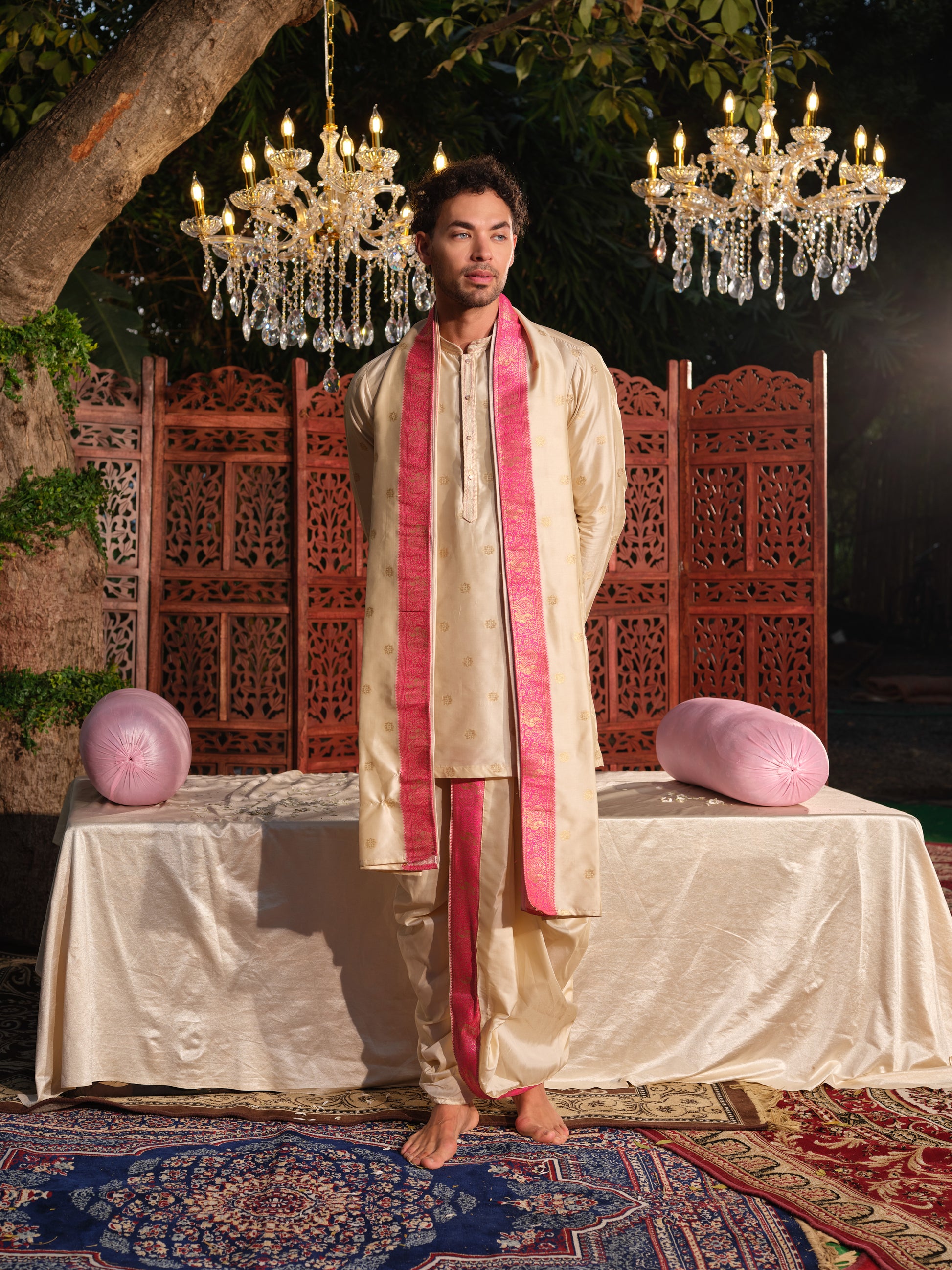 Offwhite–Pink Jacquard Kurta Set with Dhoti & Dupatta