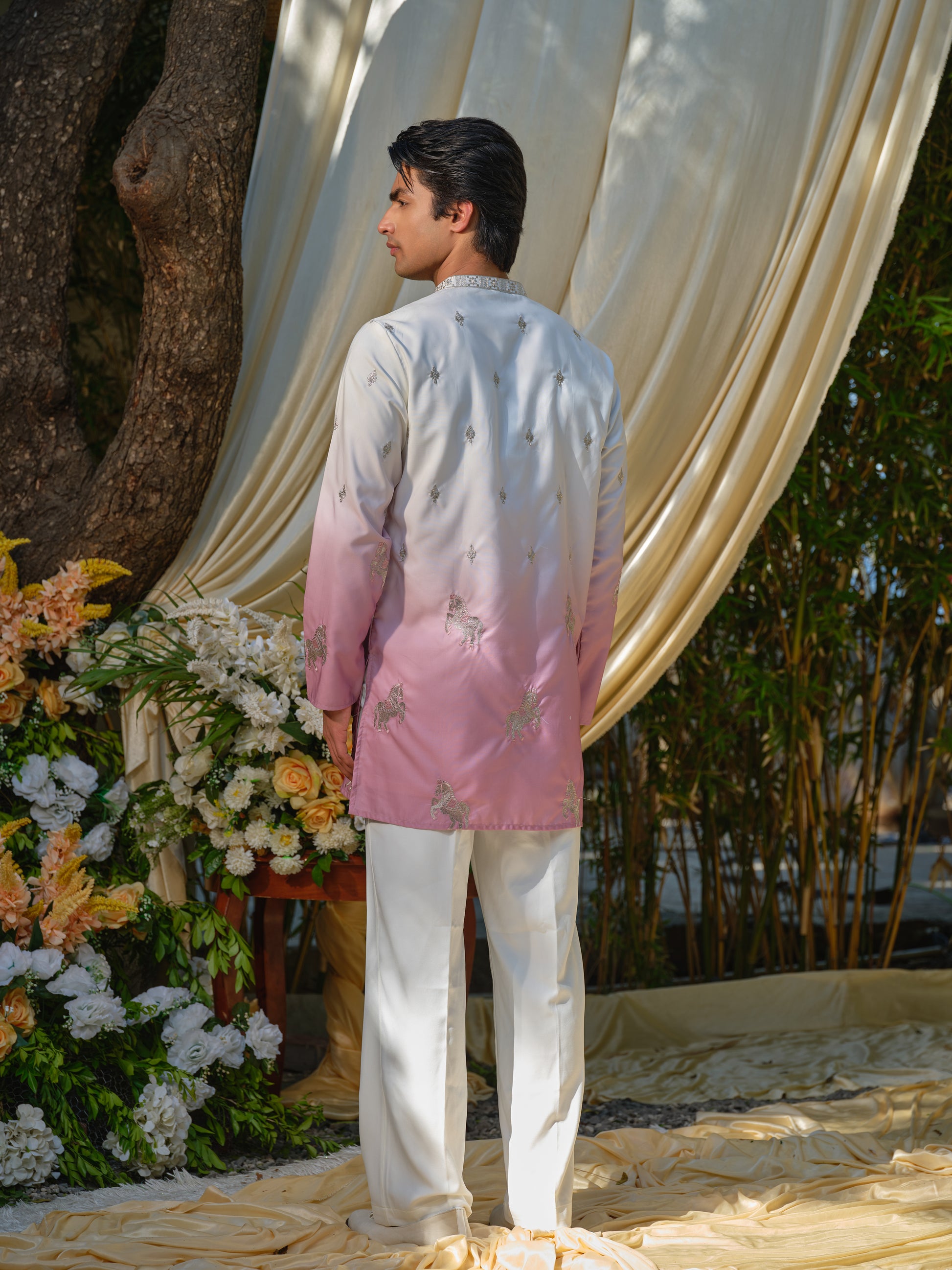 Radiate luxurious festive opulence with this Men’s Pink Silk Kurta–Bottom Set featuring Zari Embroidery from Rochaldas Sons. Sumptuous silk fabric shimmers with golden zari embroidery, creating intricate patterns that catch the light beautifully. The vibrant pink hue blends romance with celebratory grandeur for standout ethnic appeal.