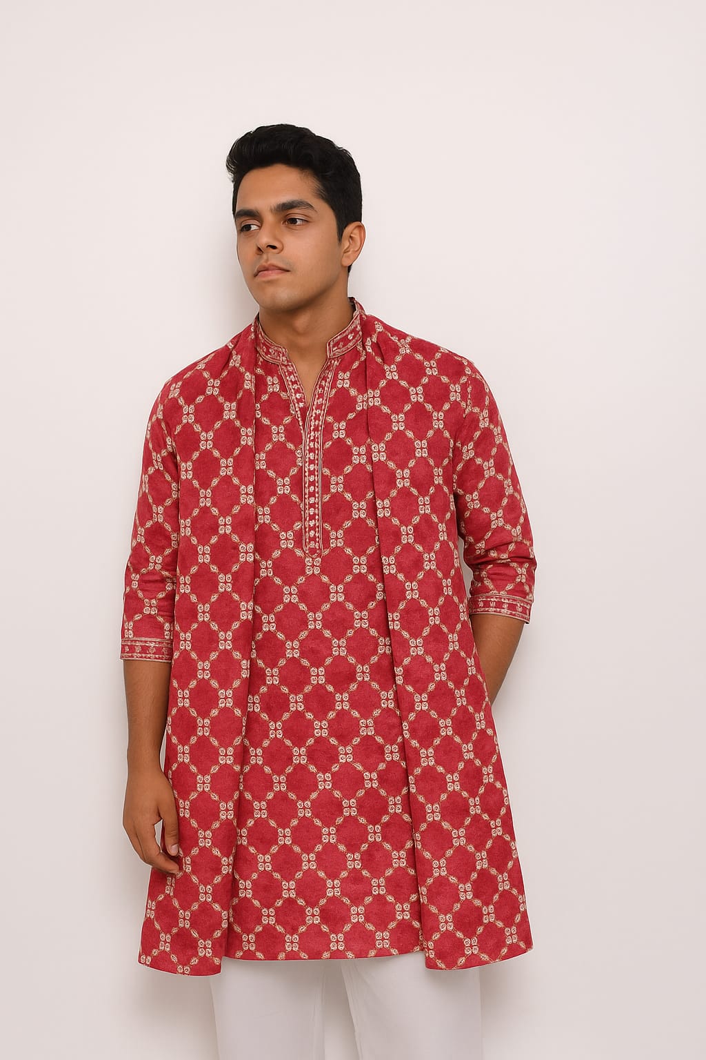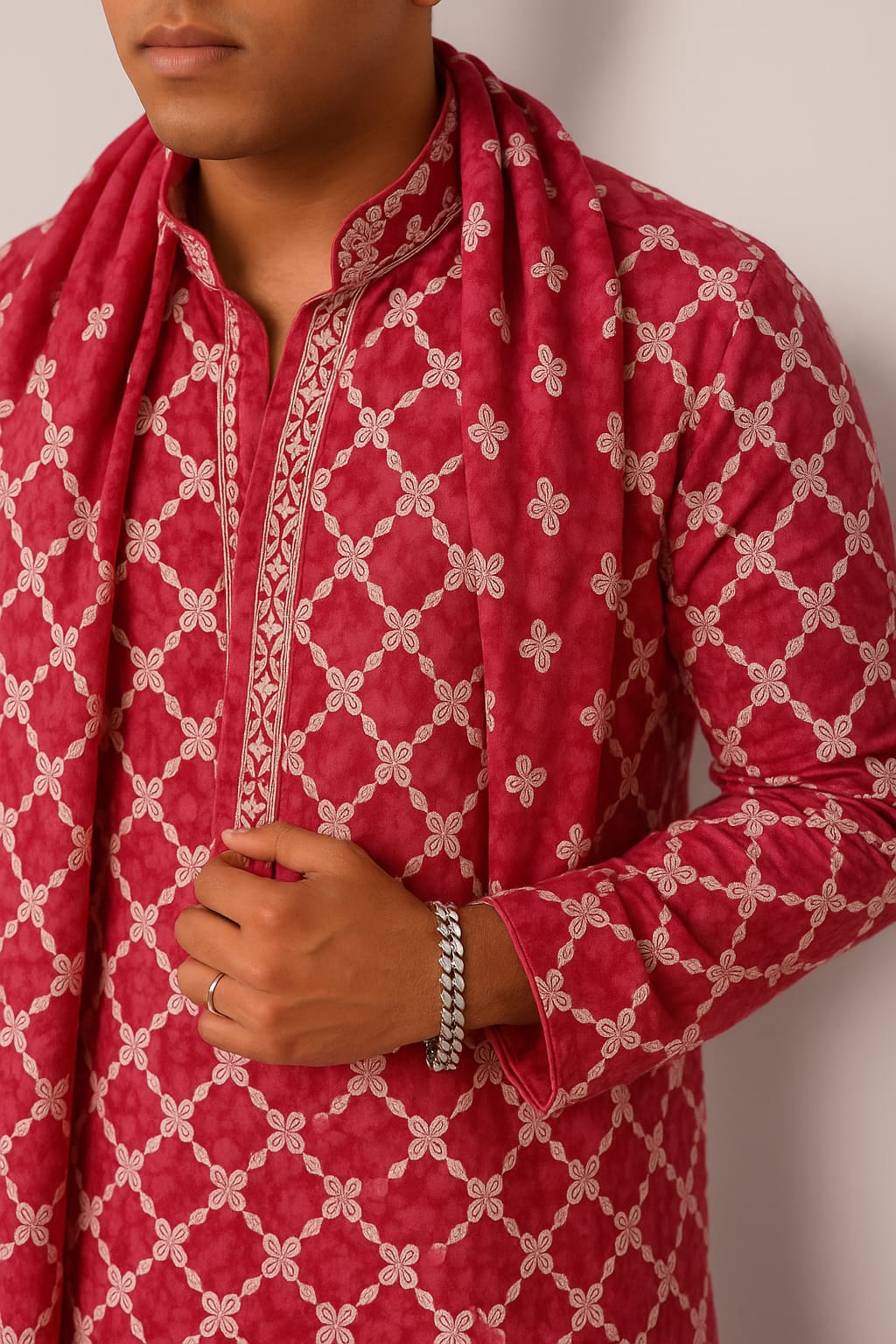 Refresh your festive style with this Men's Pink Rayon Kurta Set, designed with an eye-catching tie-and-dye effect that adds a modern twist to traditional attire. Crafted from soft rayon fabric, the kurta is enhanced with elegant sequins and mirror work embroidery, bringing subtle shimmer and sophistication. Featuring a mandarin collar, full sleeves, knee-length silhouette, and side slits, it offers a perfect blend of comfort and refinement. Complete with matching bottoms (parallel or pajama) and a coordinating dupatta, this ensemble is ideal for festive gatherings, weddings, and cultural celebrations.