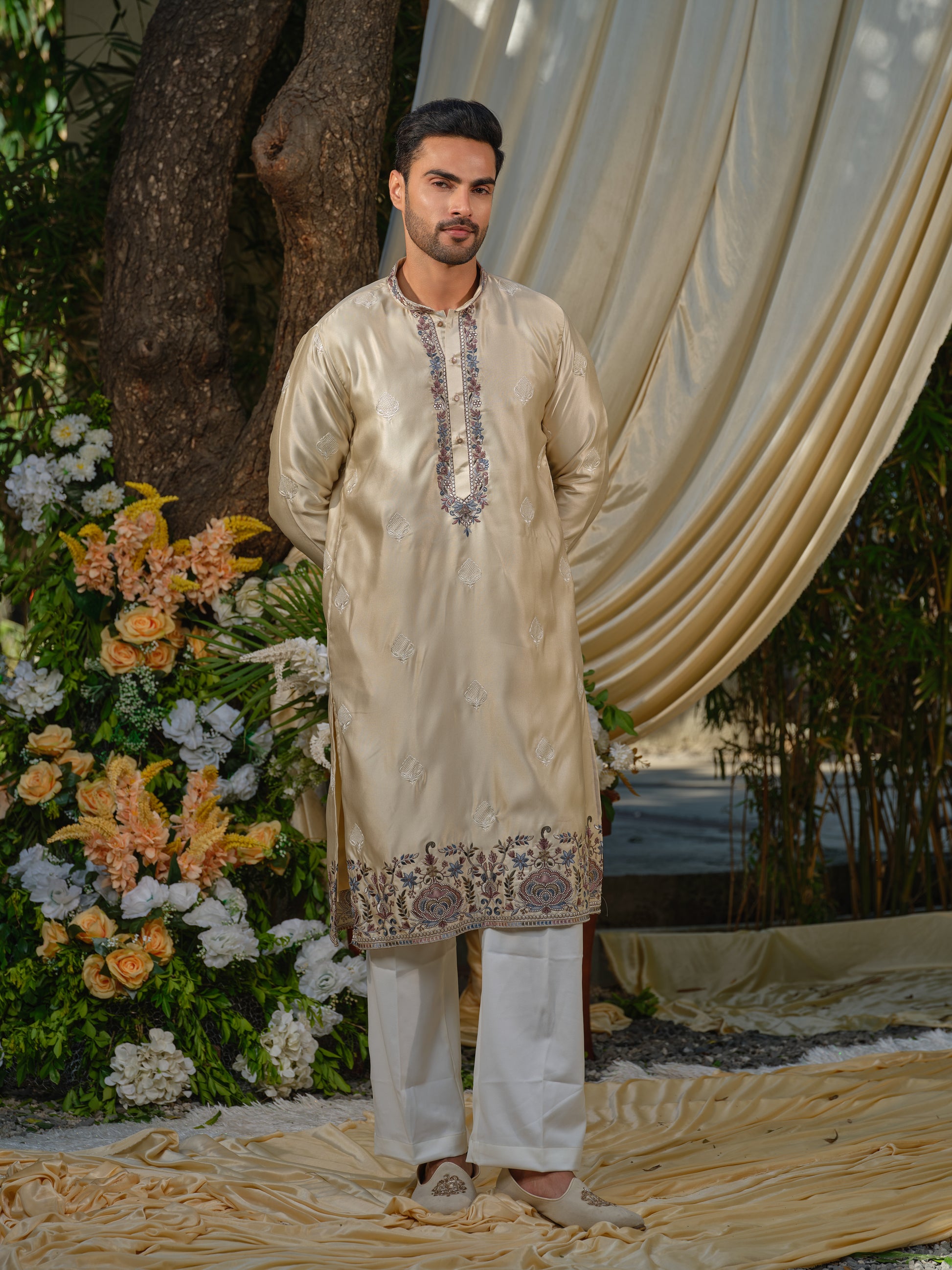 Men’s Silk Kurta–Bottom Set with Thread Work Embroidery