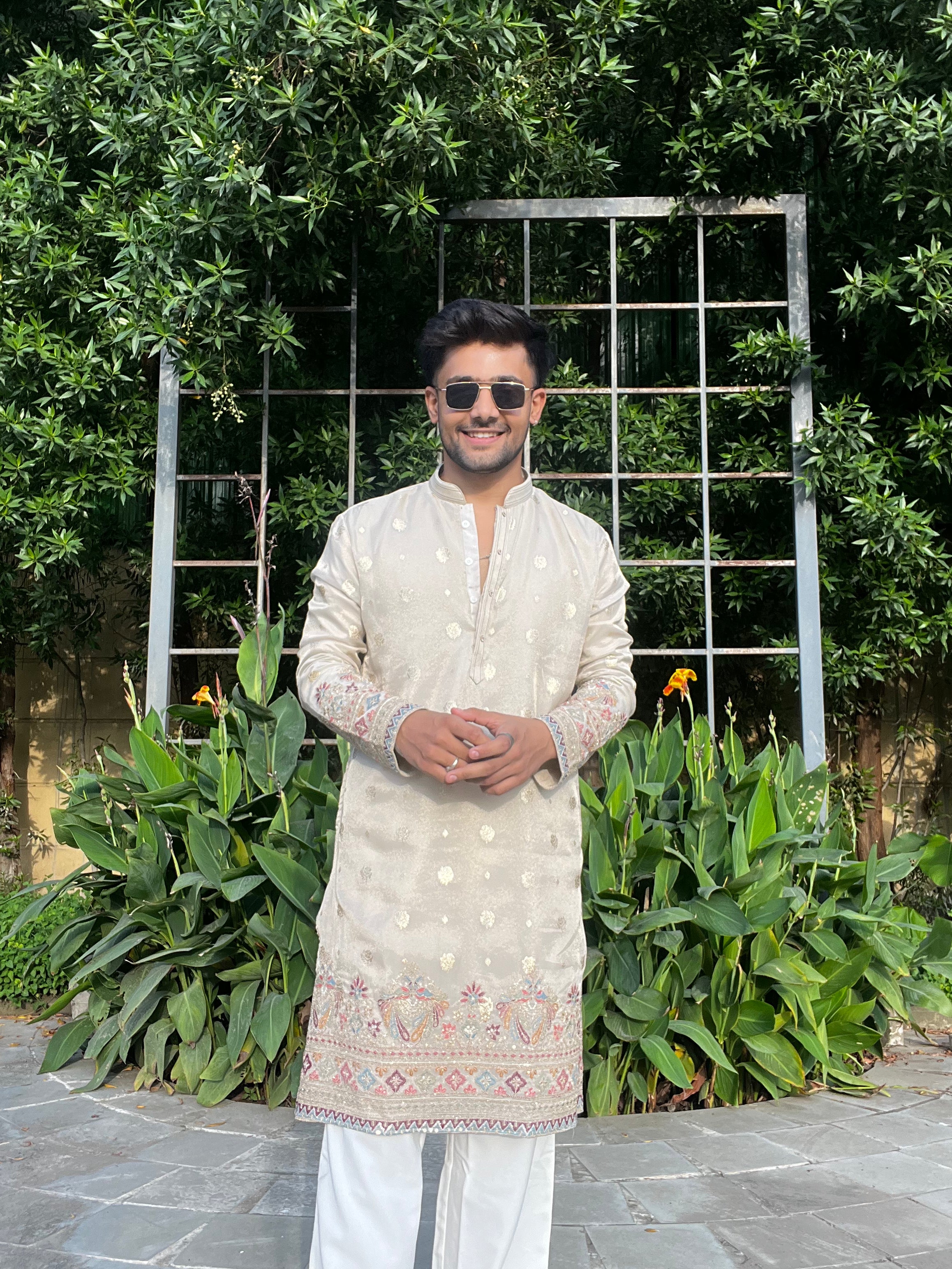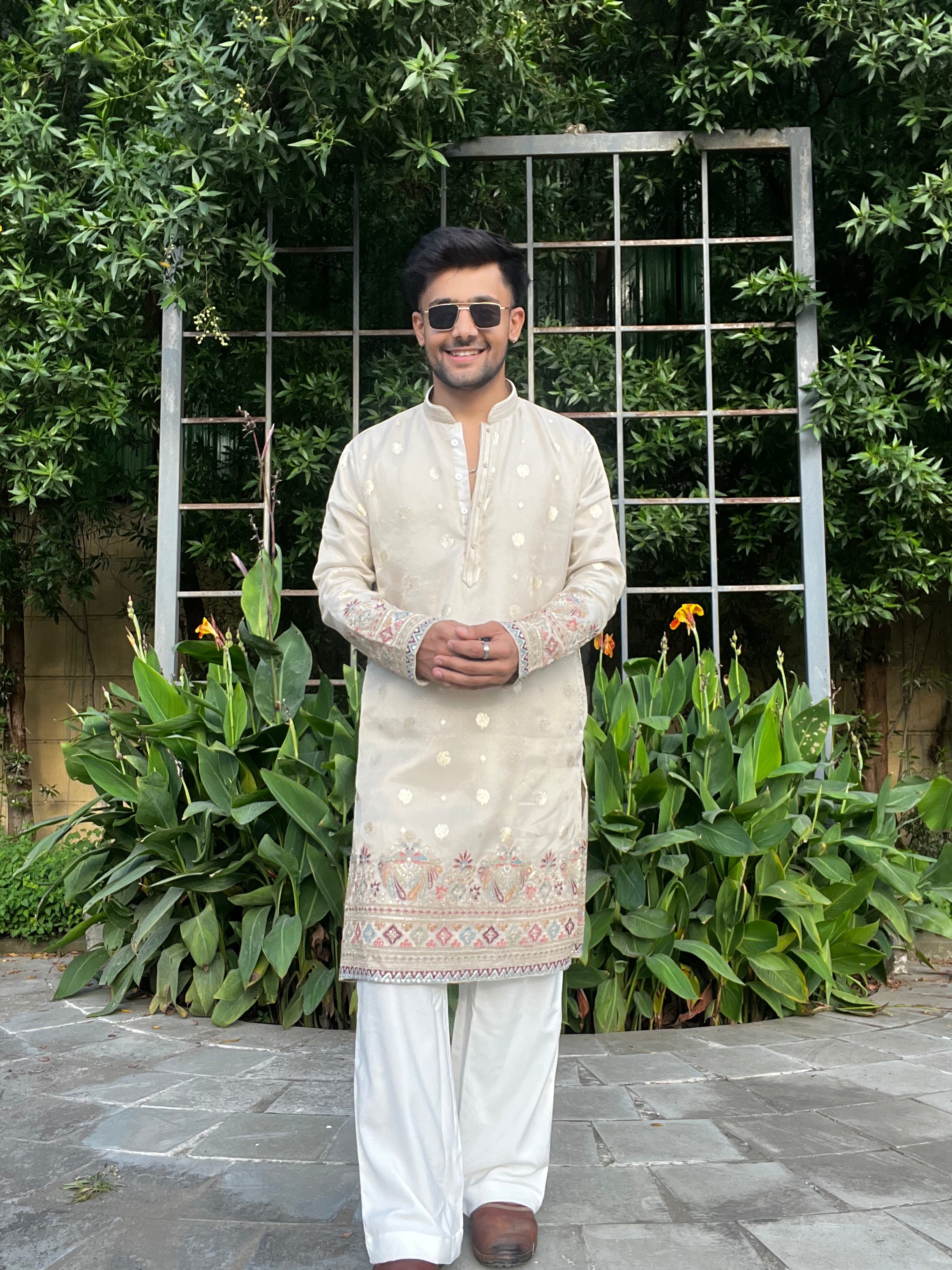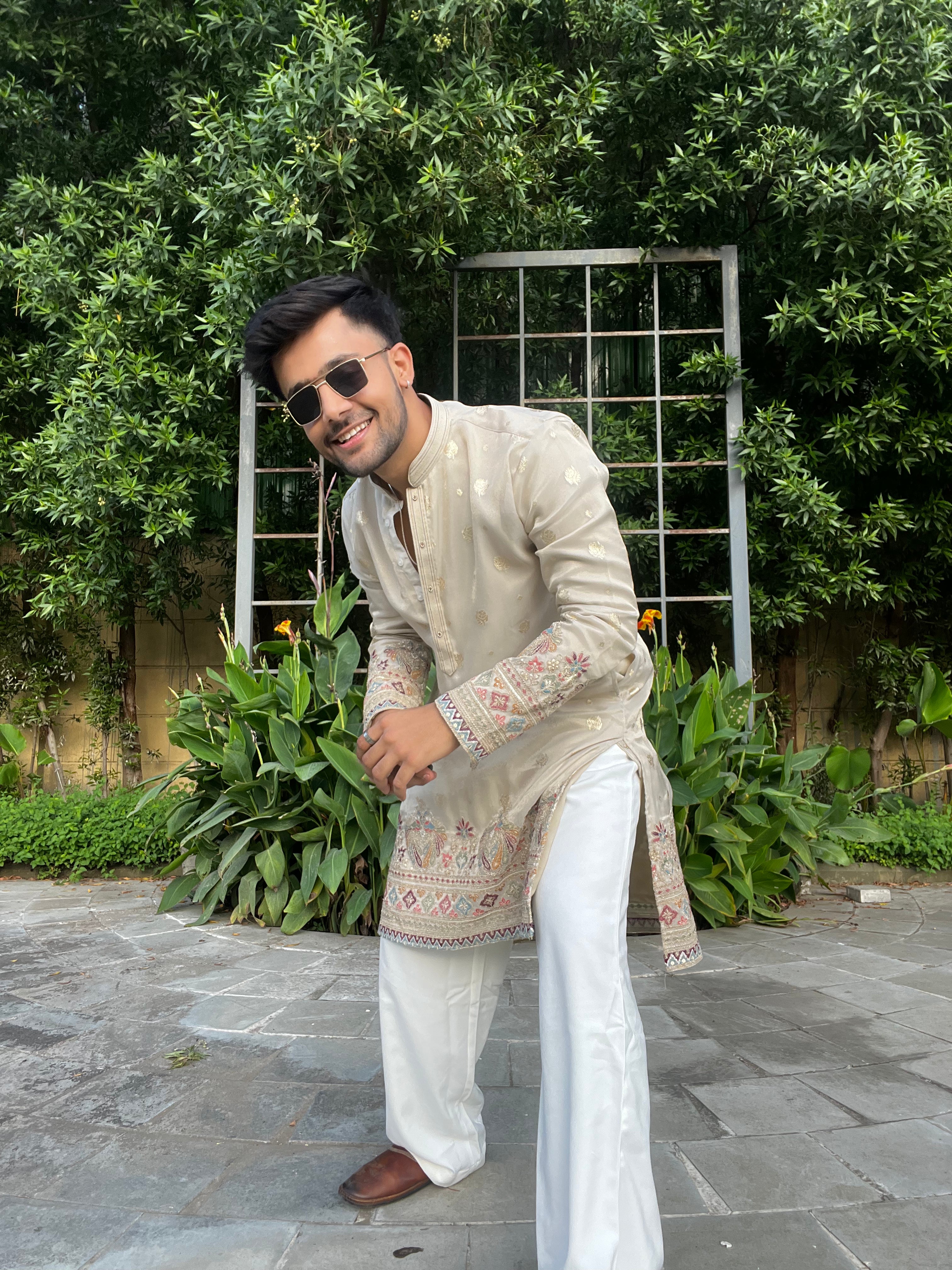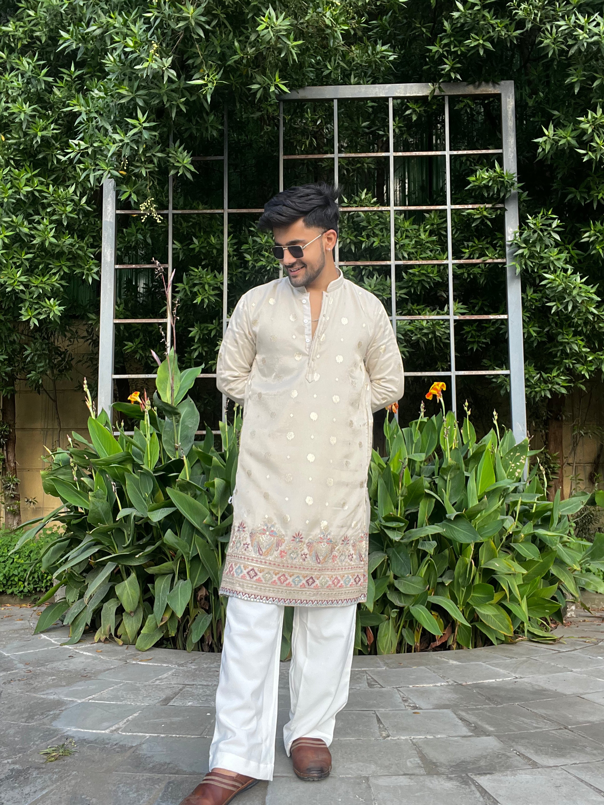 Refine your festive look with this Men’s Beige Tissue Jacquard Kurta Set from Rochaldas Sons. Crafted in luxurious tissue jacquard fabric, this kurta features intricate cording and thread embroidery with elegant pintex detailing on the placket. Designed with a mandarin collar, full sleeves, and a straight silhouette, the knee-length kurta is enhanced with side slits for effortless comfort and movement. Paired with a matching bottom (pyjama or parallel), this set is a timeless addition to your festive and wedding wardrobe.