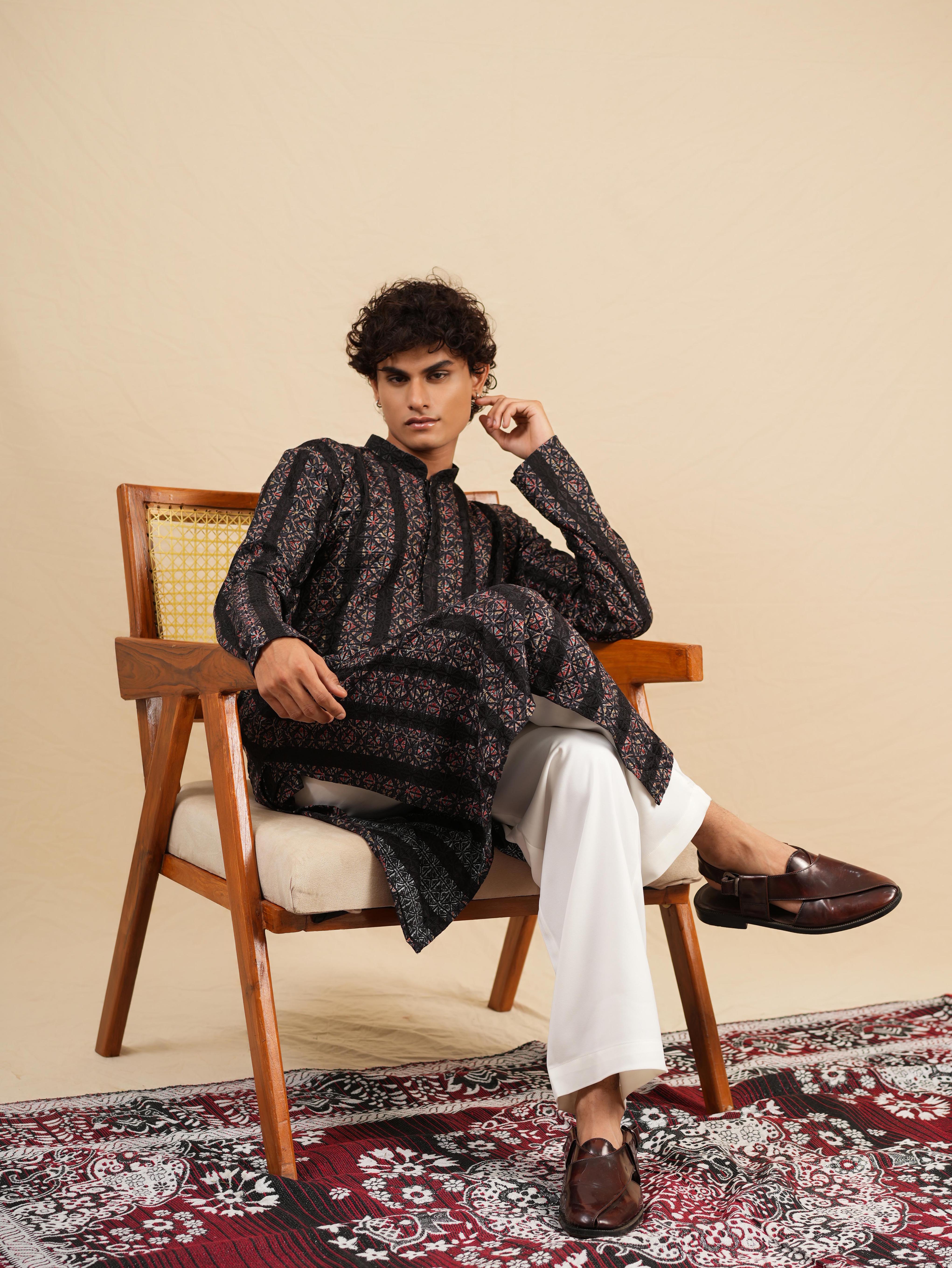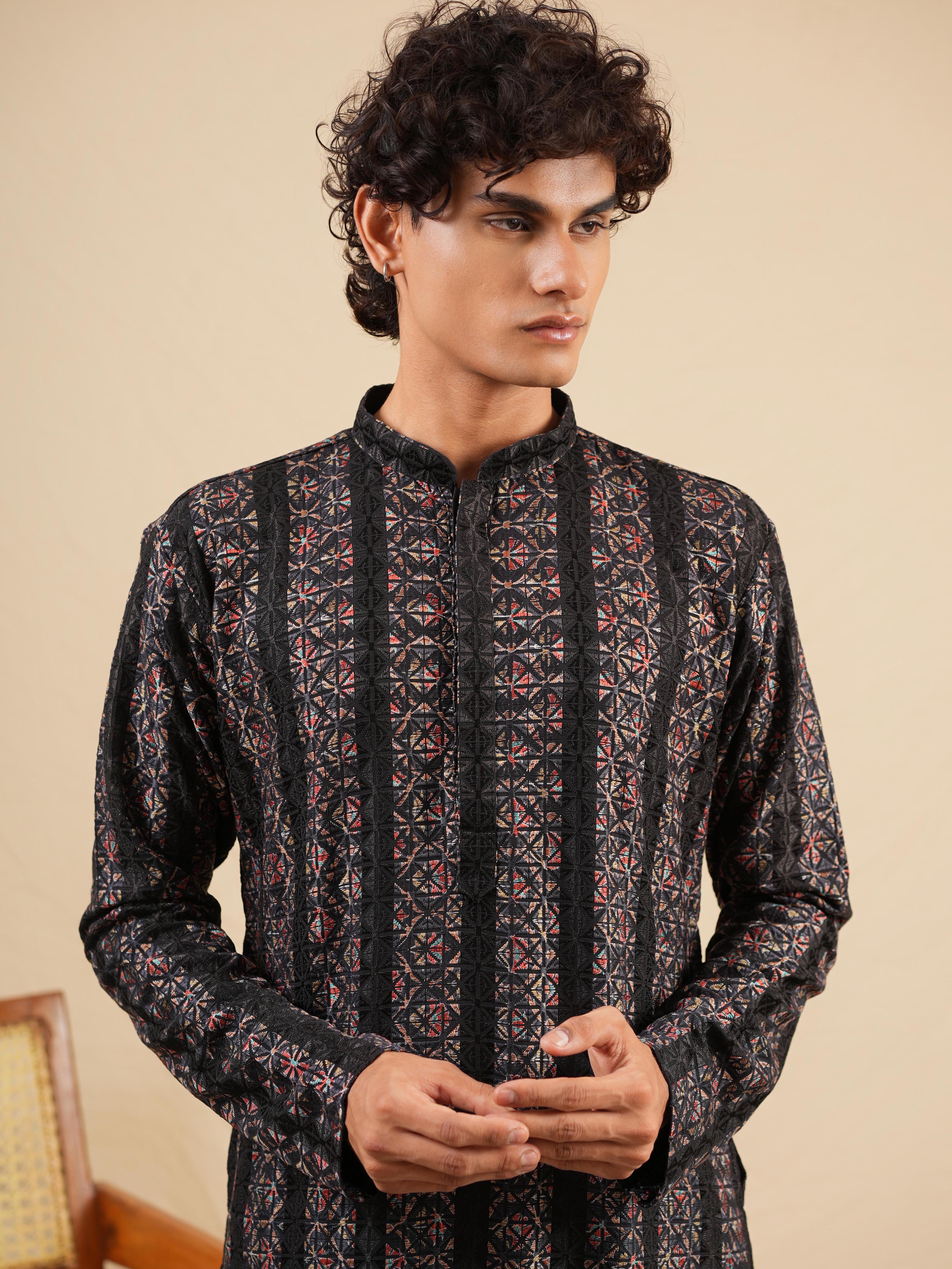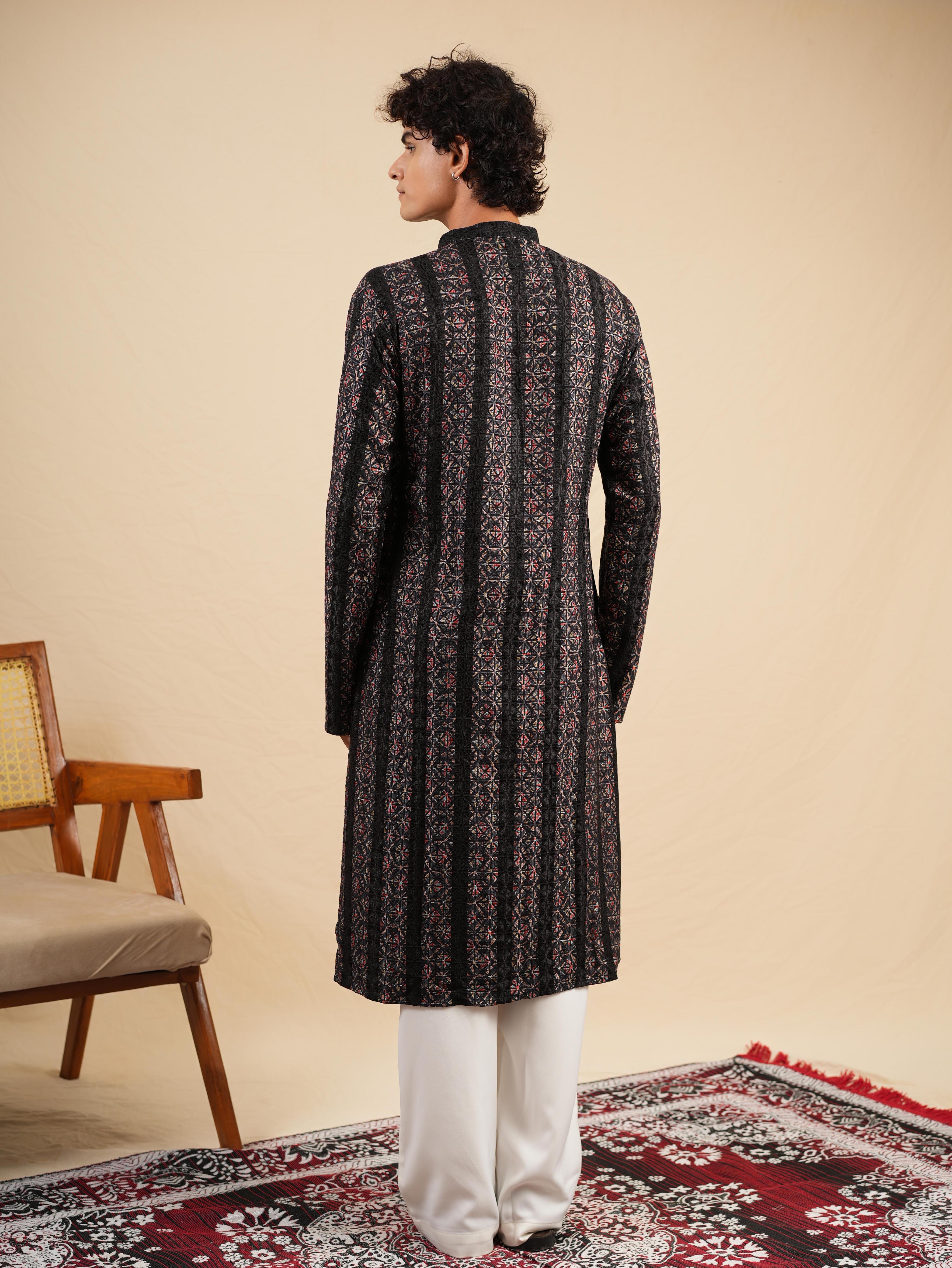 Description: Make a striking statement with this Men's Black Rayon Kurta Set, beautifully adorned with elegant thread work embroidery. Crafted from soft rayon fabric, it offers both comfort and style, making it perfect for festive occasions. Designed with a mandarin collar, full sleeves, and a knee-length straight cut with side slits, this kurta blends timeless tradition with refined modern appeal. Paired with a matching bottom (pajama or parallel), itβs an ideal outfit for weddings, festivals, and cultural celebrations.