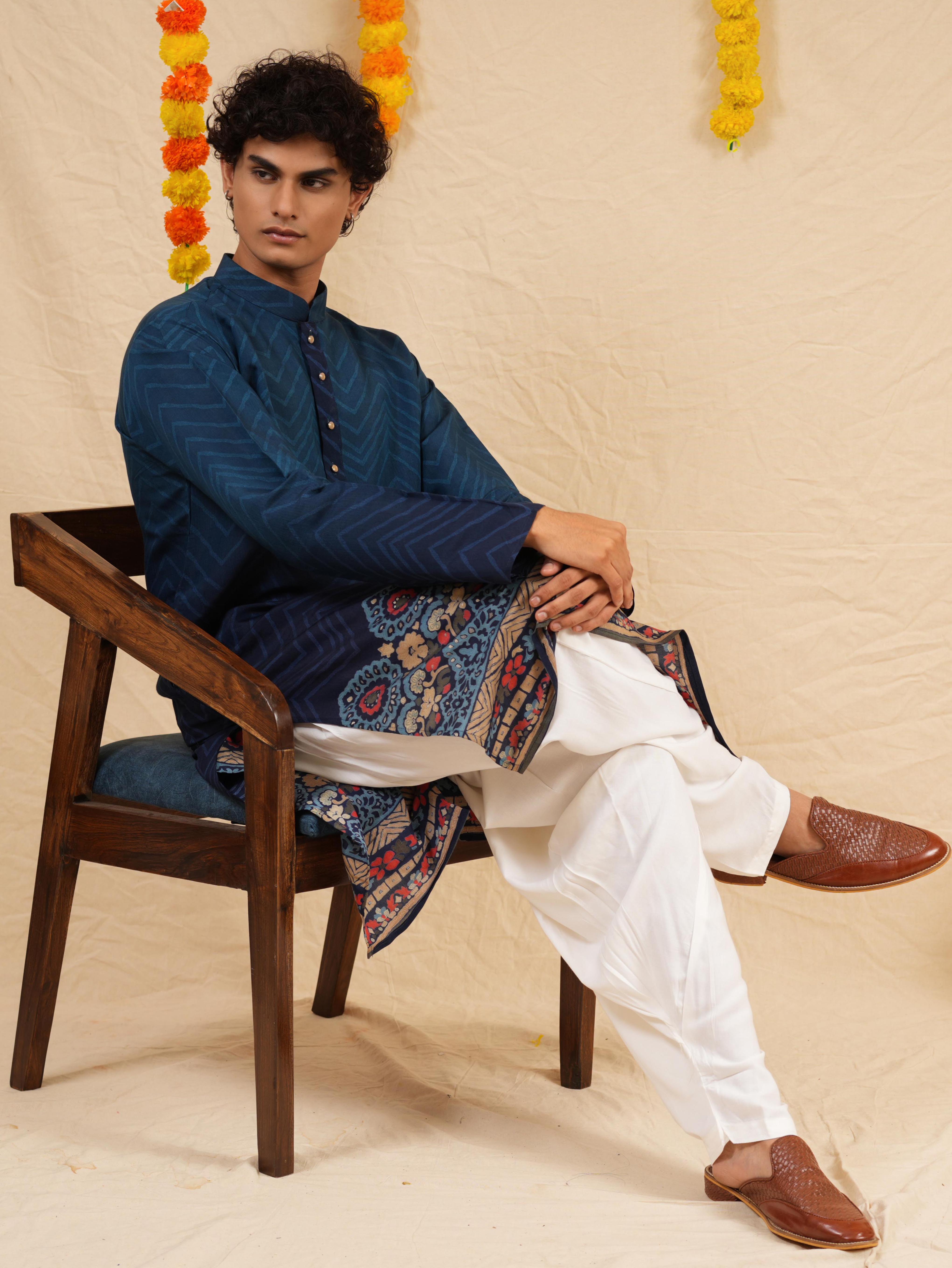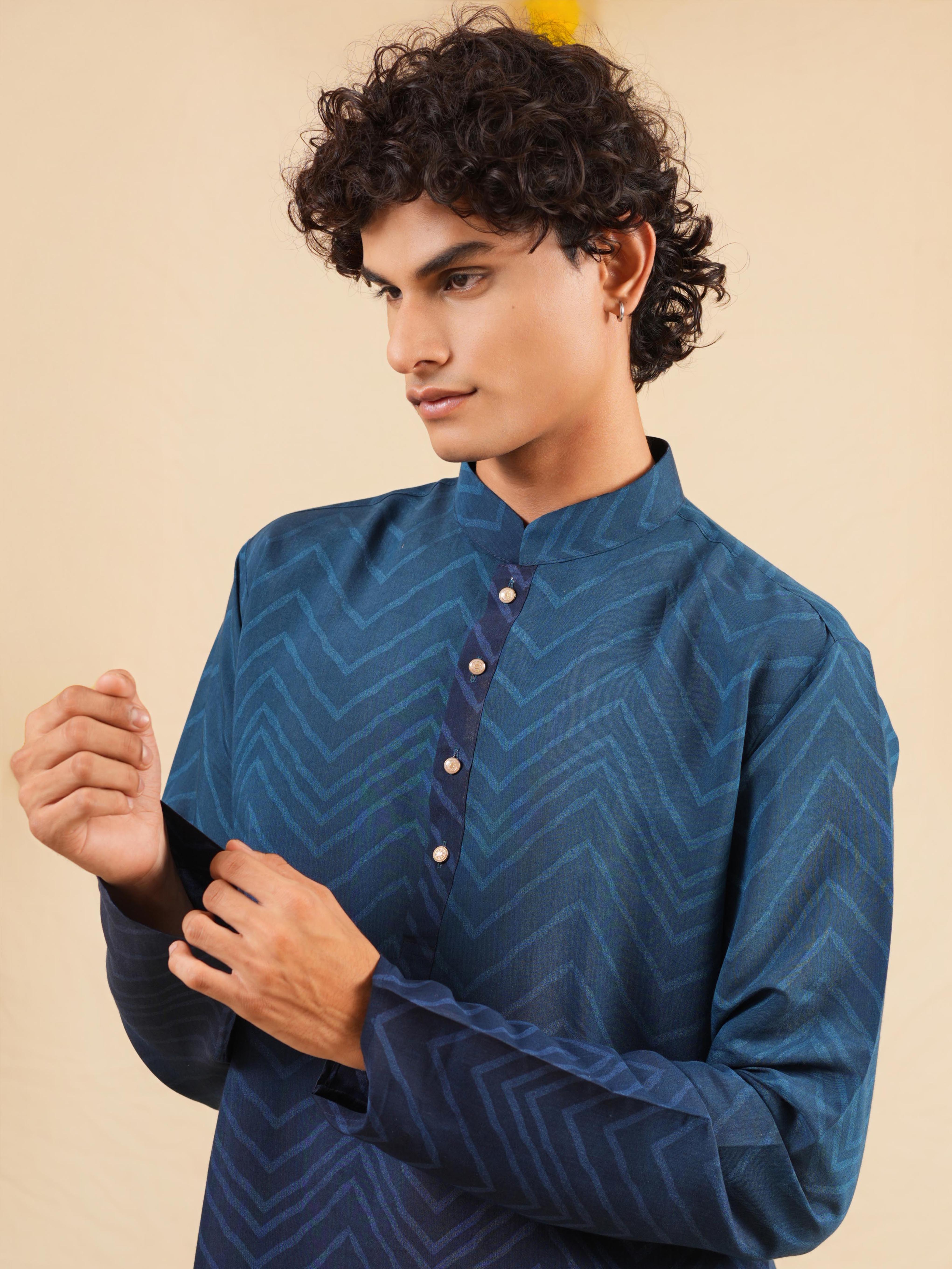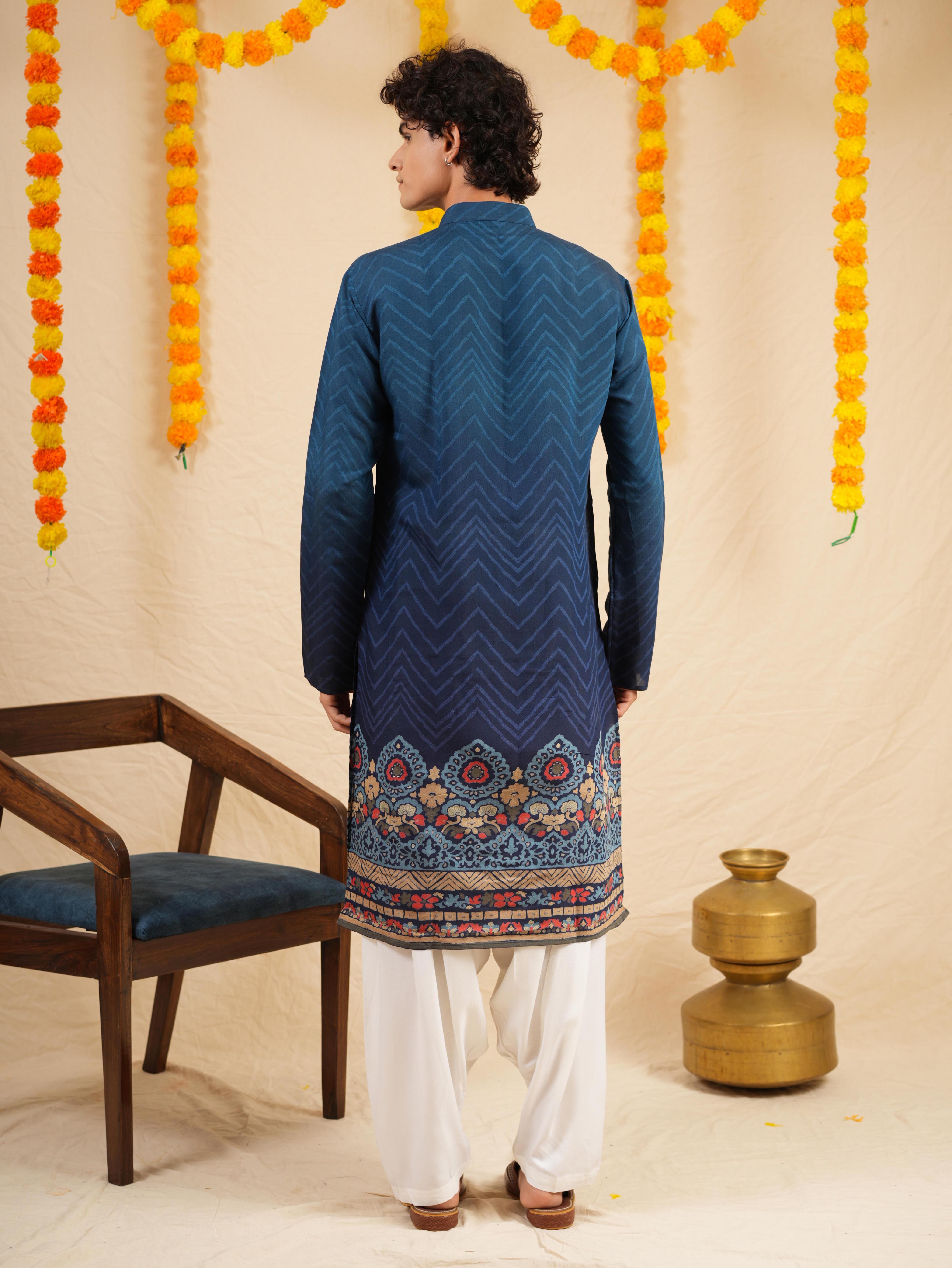 Description: Refresh your festive collection with this Men's Blue Cotton Blend Kurta Set, styled with an elegant digital print for a modern touch. Crafted from a soft and breathable cotton blend, this kurta ensures all-day comfort while keeping your look stylish. Designed with a mandarin collar, full sleeves, and a straight knee-length cut with side slits, it blends tradition with contemporary ease. Paired with matching bottoms (pajama or Patiala), this set is a perfect choice for festive occasions and cultural celebrations.