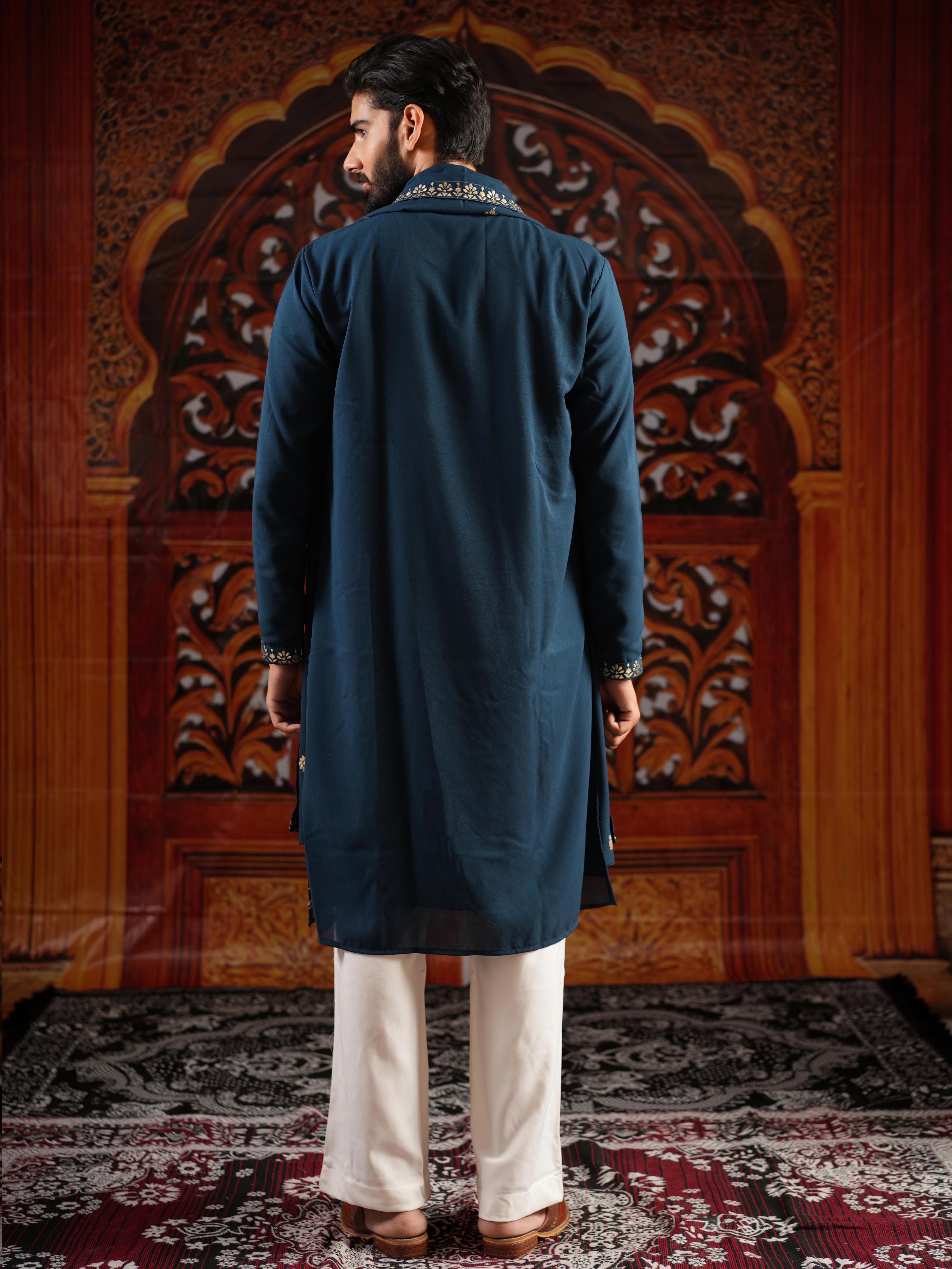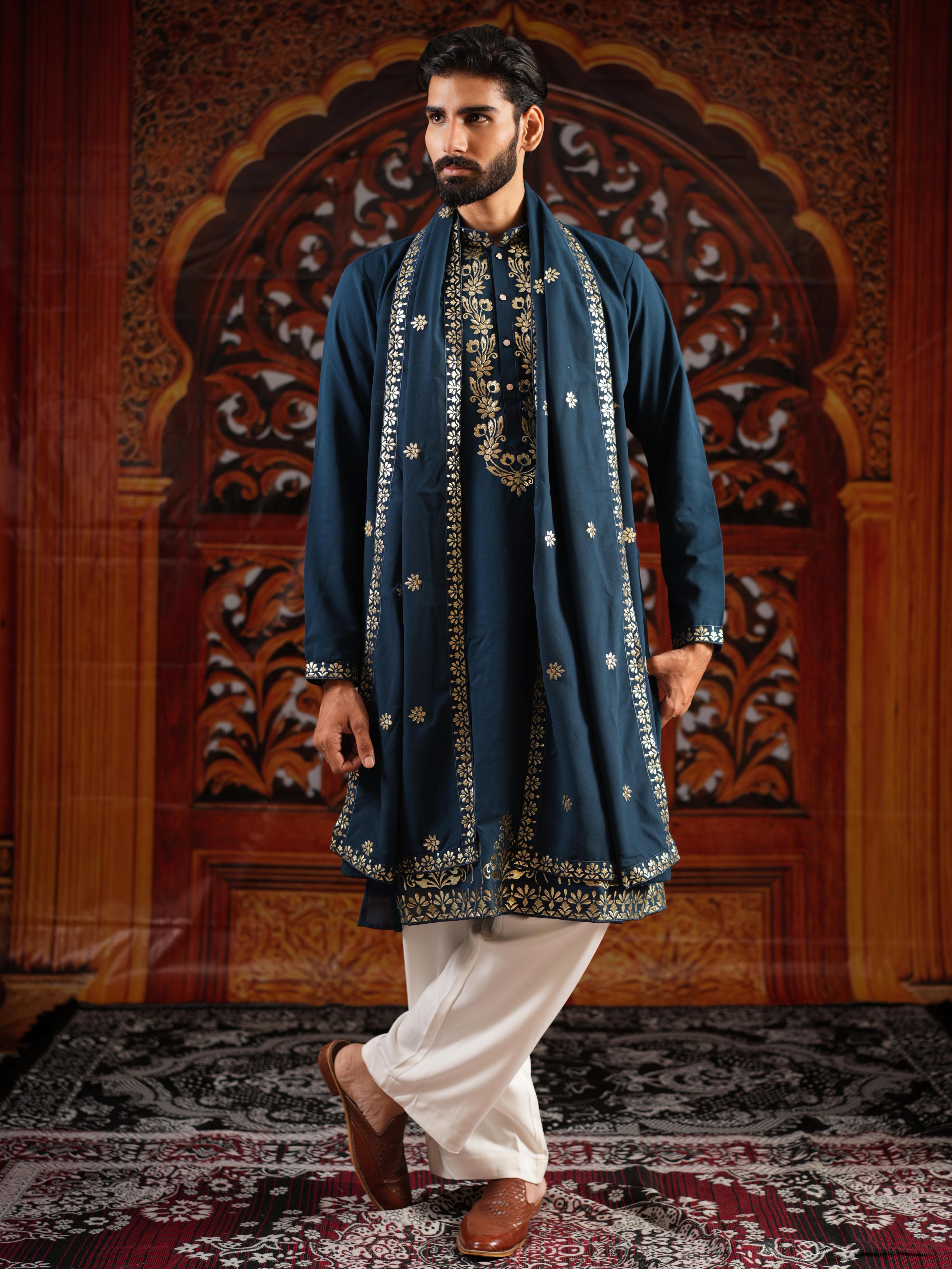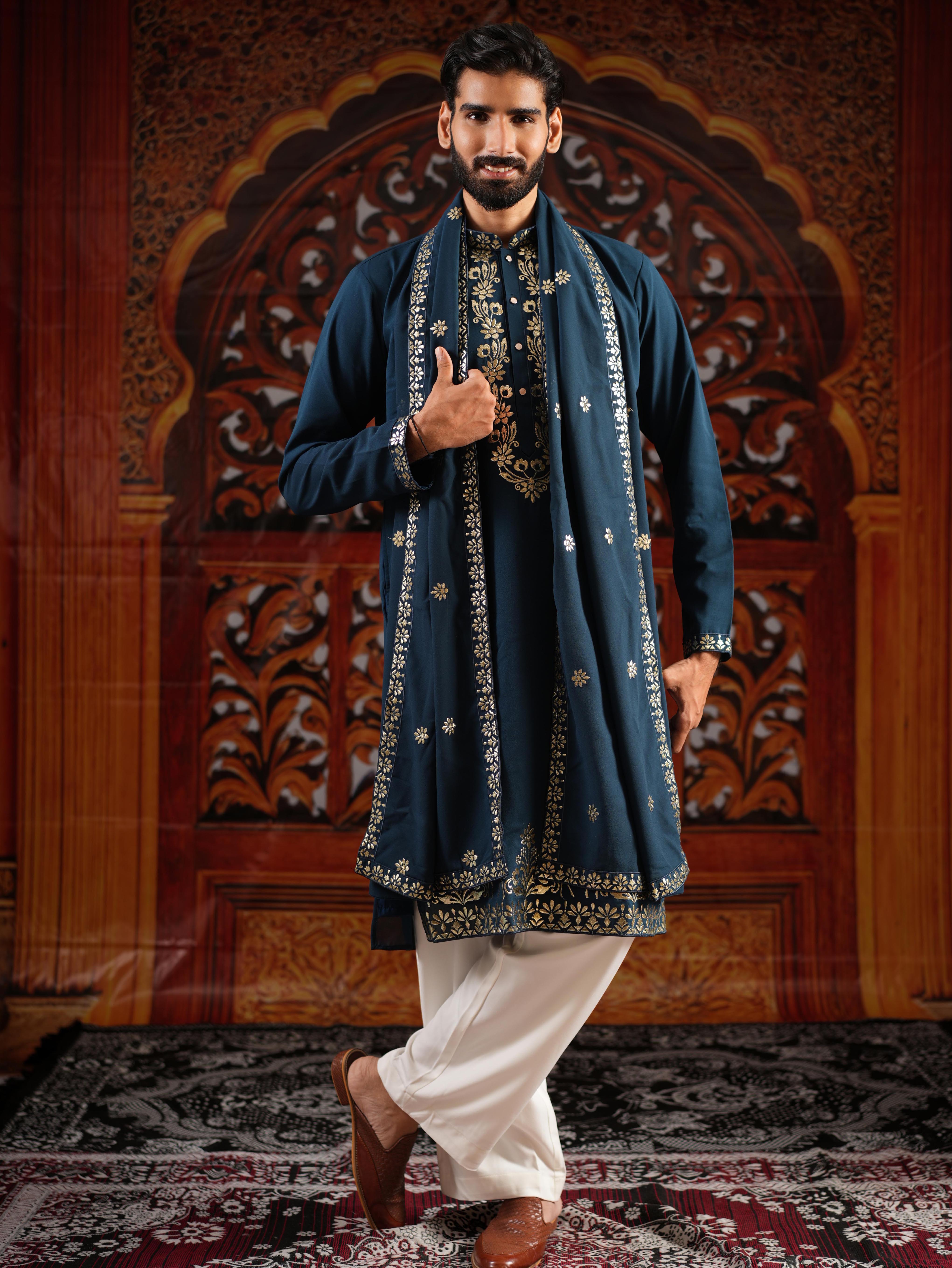 Description: Step into elegance with this Men's Blue Georgette Kurta Set, beautifully crafted with shimmering foil work for a festive touch. Made from lightweight georgette fabric, this kurta offers both comfort and refined style. Featuring a mandarin collar, full sleeves, and a straight knee-length cut with side slits, it blends tradition with modern sophistication. The set comes complete with a matching bottom (pajama or parallel) and a dupatta, making it a perfect choice for weddings, festive gatherings, and cultural celebrations.